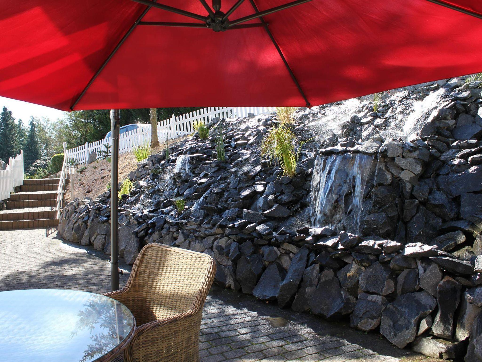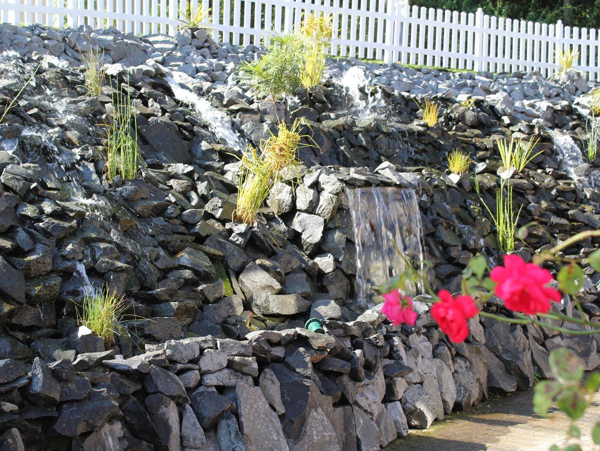 Ein wundervoller und aufwendig angelegter Zierteich mit Kois und anderen Fischen, 2 Wasserfällen und einem Bachlauf gehört zur Anlage.