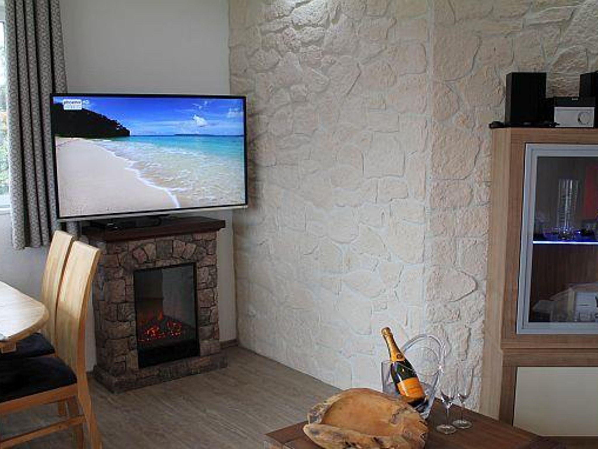 Die hell und freundlich eingerichtete Wohnung vermittelt einen naturverbundenen Flair mit viel Holz und Stein. Zudem verbreitet der Elektrokamin und ein eleganter Deckenventilator eine besondere, gemütliche Atmosphäre. So erhalten Sie auch an kalten und nassen Tagen eine besondere Urlaubsatmosphäre.