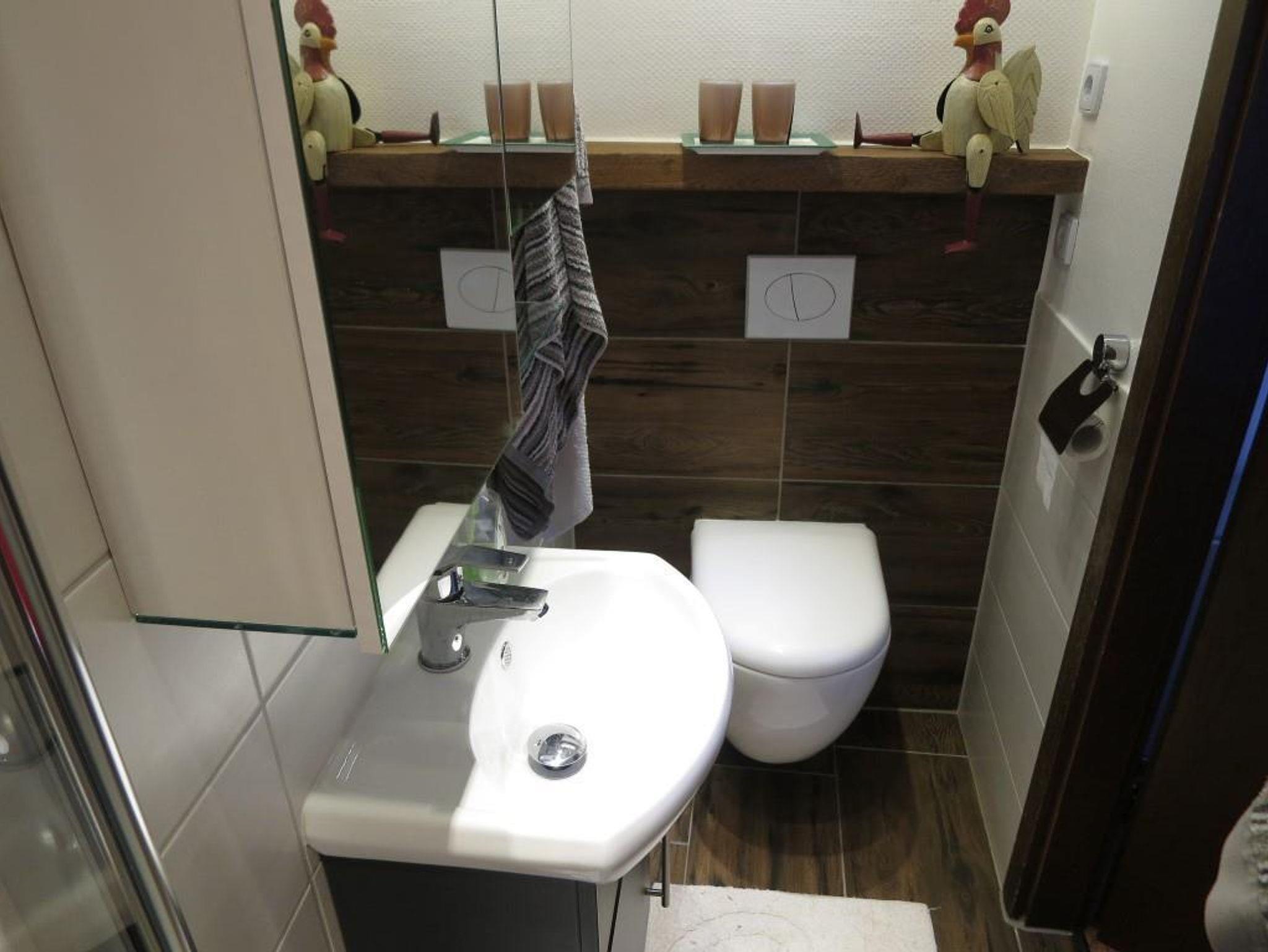 Im 1. Stock befindet sich die Küche, ein Schlafzimmer mit einem Badezimmer und ein Wohn- und Essraum. Im ausgebauten Dachgeschoss befindet sich ein weiterer Wohnraum mit wunderbarem Blick auf das Schalkenmehrener Maar. Ebenso ist hier ein zweites Schlafzimmer mit eigenem Bad vorhanden, so dass diese Wohnung sehr gut für vier Personen geeignet ist.