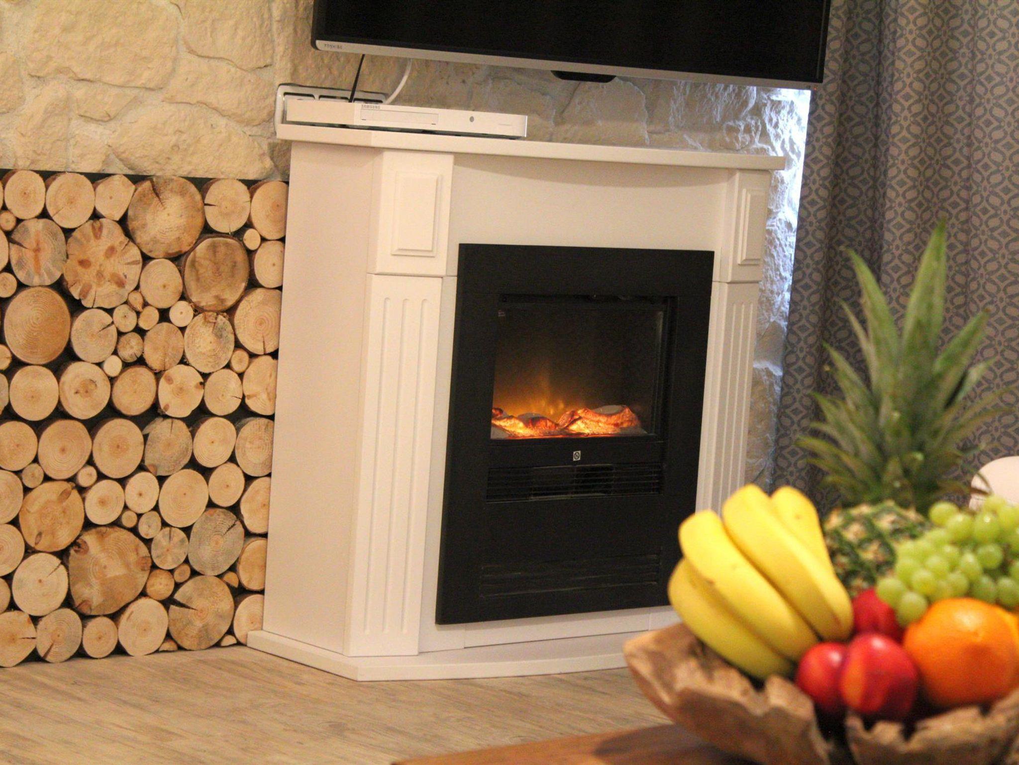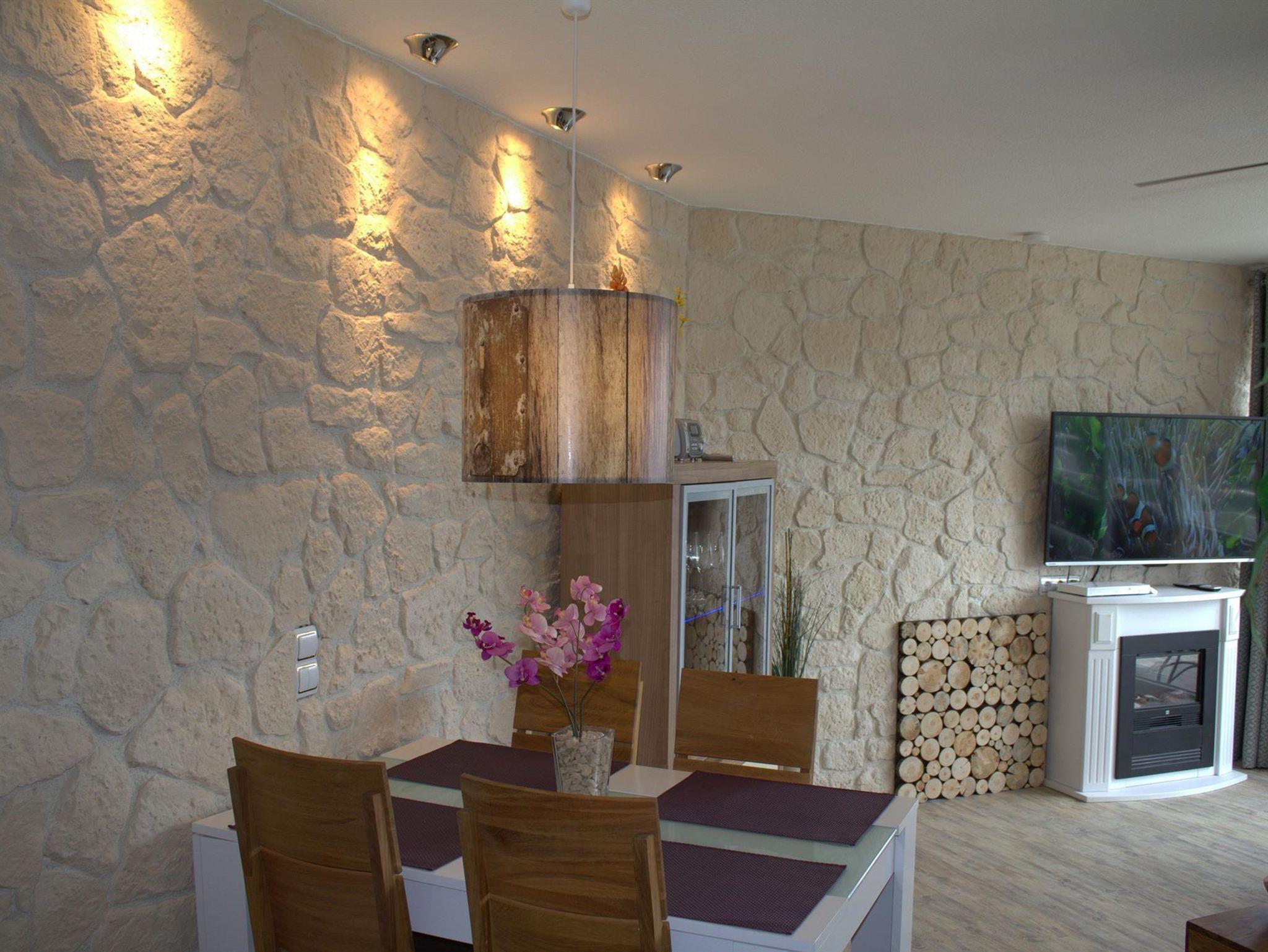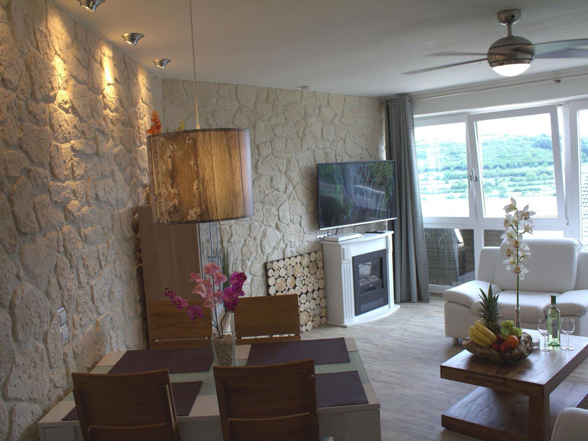 Die hell und freundlich eingerichtete Wohnung vermittelt einen naturverbundenen Flair mit viel Holz und Stein. Zudem verbreitet der Elektrokamin und ein eleganter Deckenventilator eine besondere, gemütliche Atmosphäre.