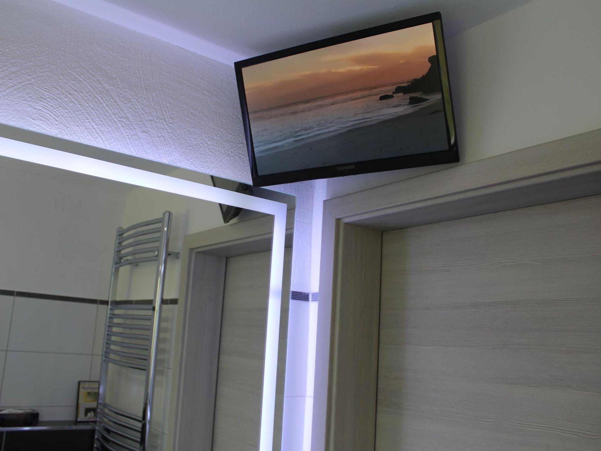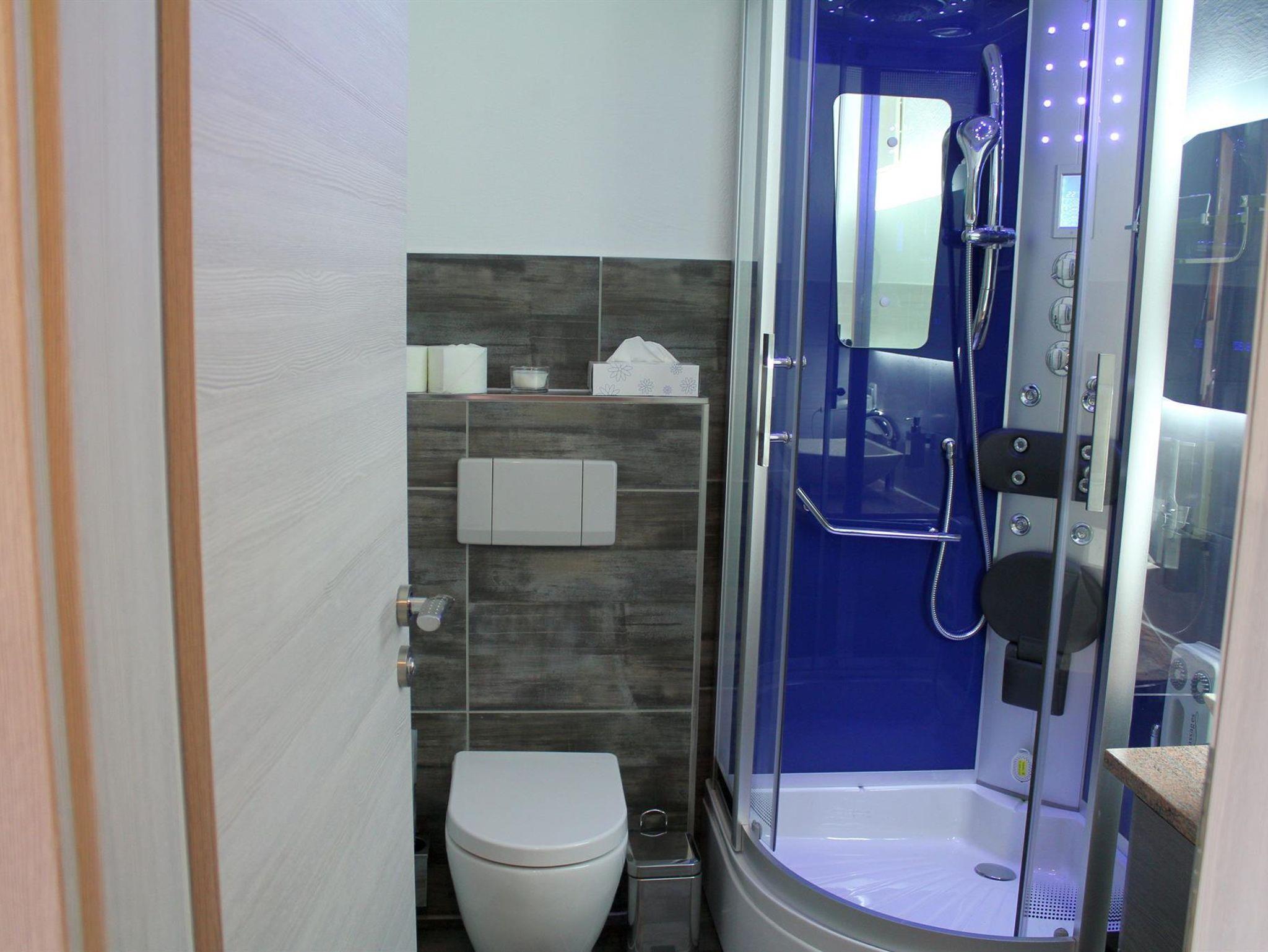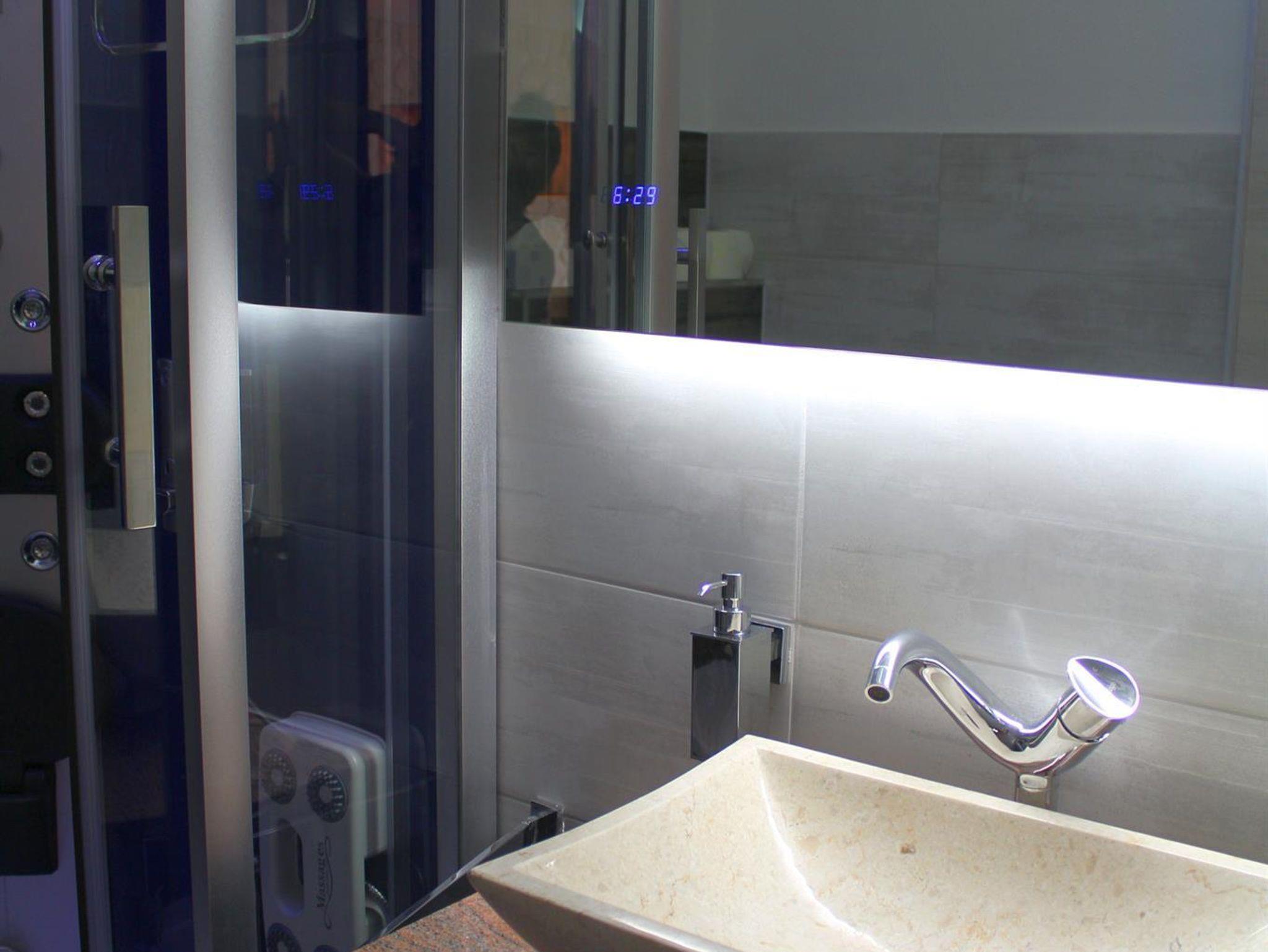Die im gesamten Bad, blau leuchtenden Boden-LED´s bieten eine tolle Atmosphäre. Ein großer, beleuchteter Spiegel mit digitaler LED Uhr, ein Hotelfön und eine Personenwaage sind vorhanden.