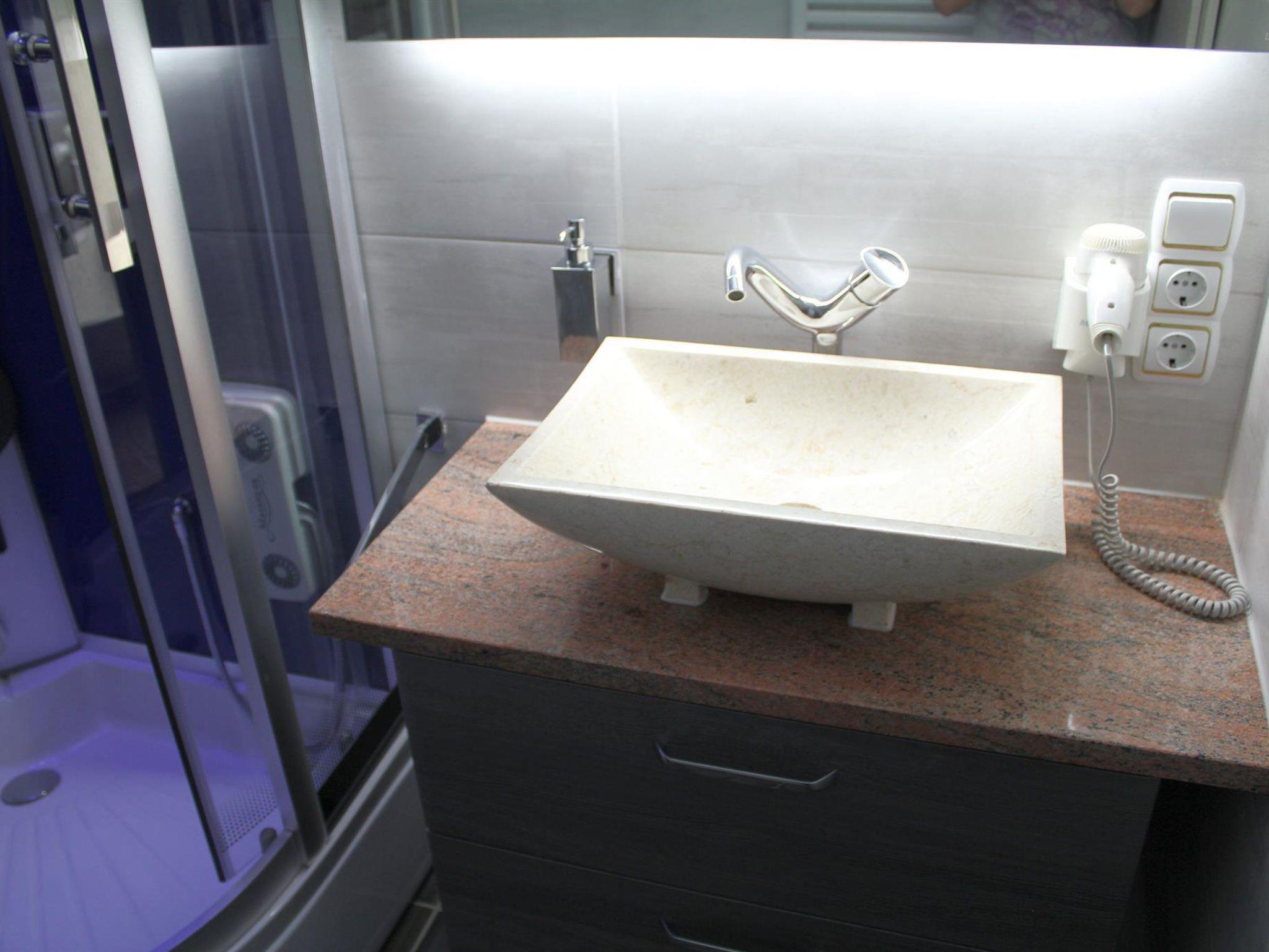 Moderne Heizung (Chrom) mit Handtuchwärmer. Modernes Aufsatzwaschbecken auf einer hochwertigen Granitplatte, Waschtisch Unterschrank mit langsam verschließenden Schubladen. WC mit Absenktechnik.
