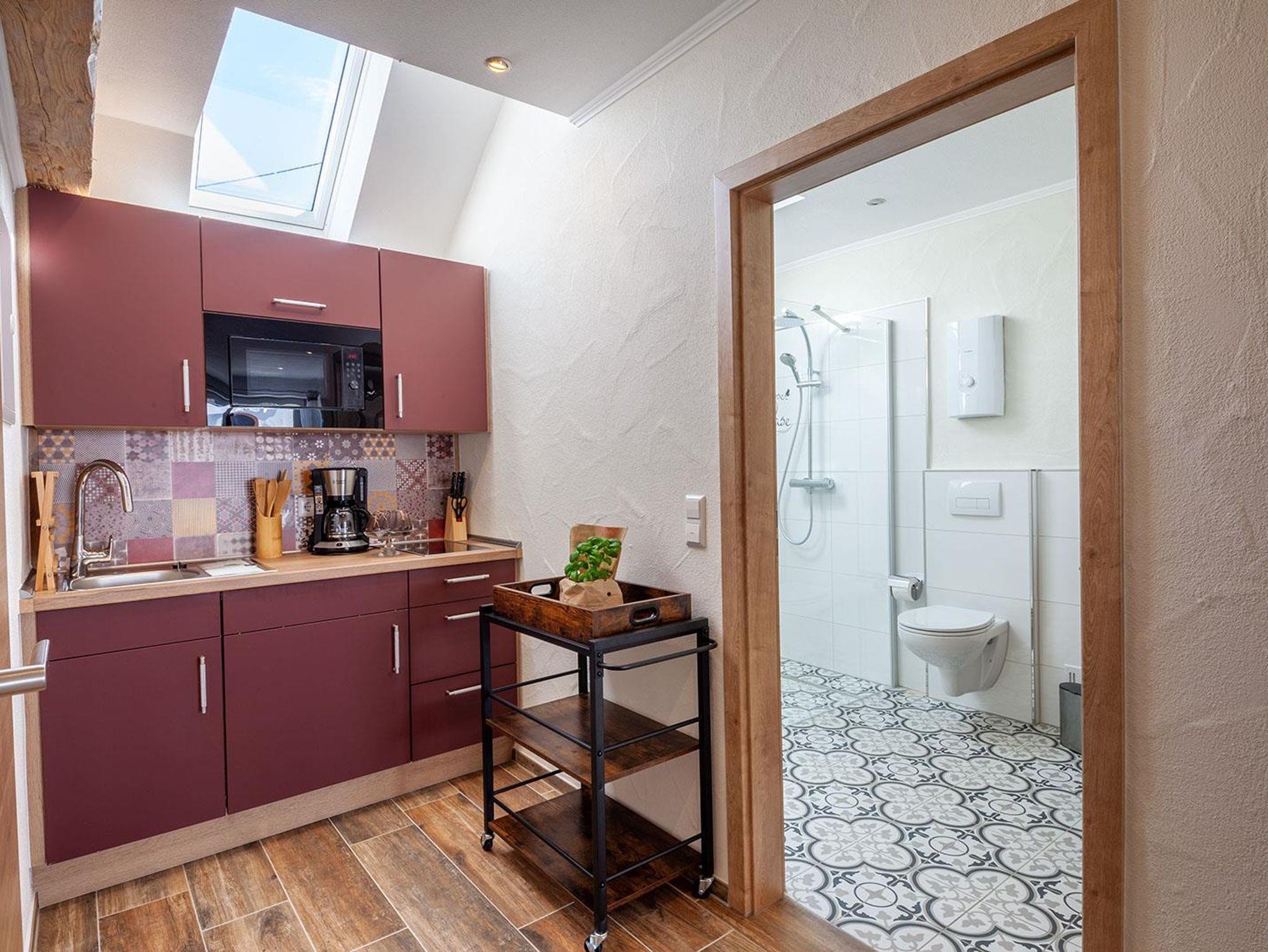 Alle drei Appartemens mit Maarblick (1x Ergschoss barrierefrei mit Terrasse und 2x im 1.Stock) bieten eine Küchenzeile inkl. Induktionskochfeld , Mikrowelle mit Backfunktion, Kühlschrank mit Gefrierteil, Toaster, Kaffeemaschine, Wasserkocher Geschirr und Gläser und Besteck sowie Grundgewürze wie Salz-Pfeffer-Zucker-, Kaffeefilter, Geschirr – und Handtücher, Küchenrolle.