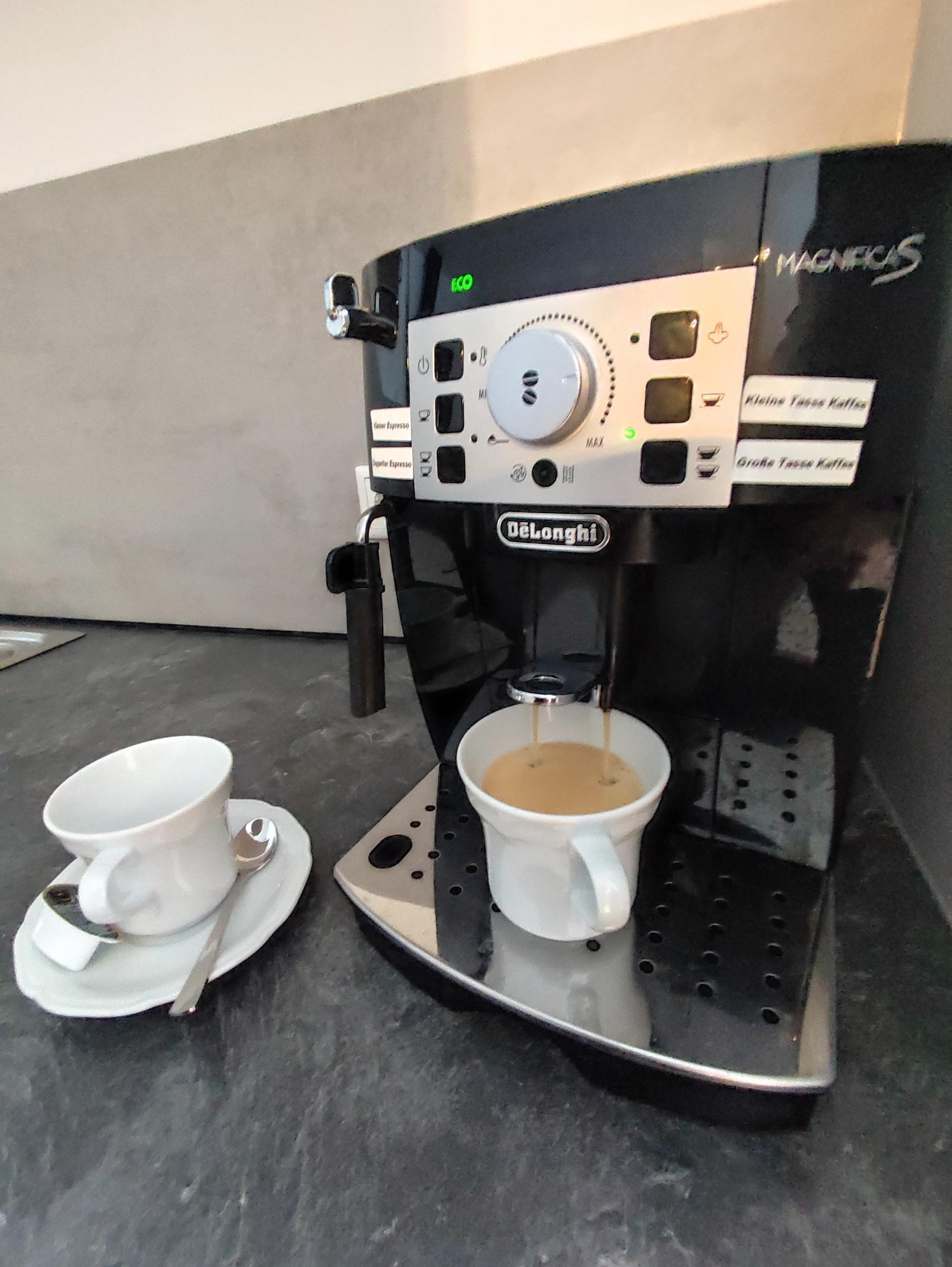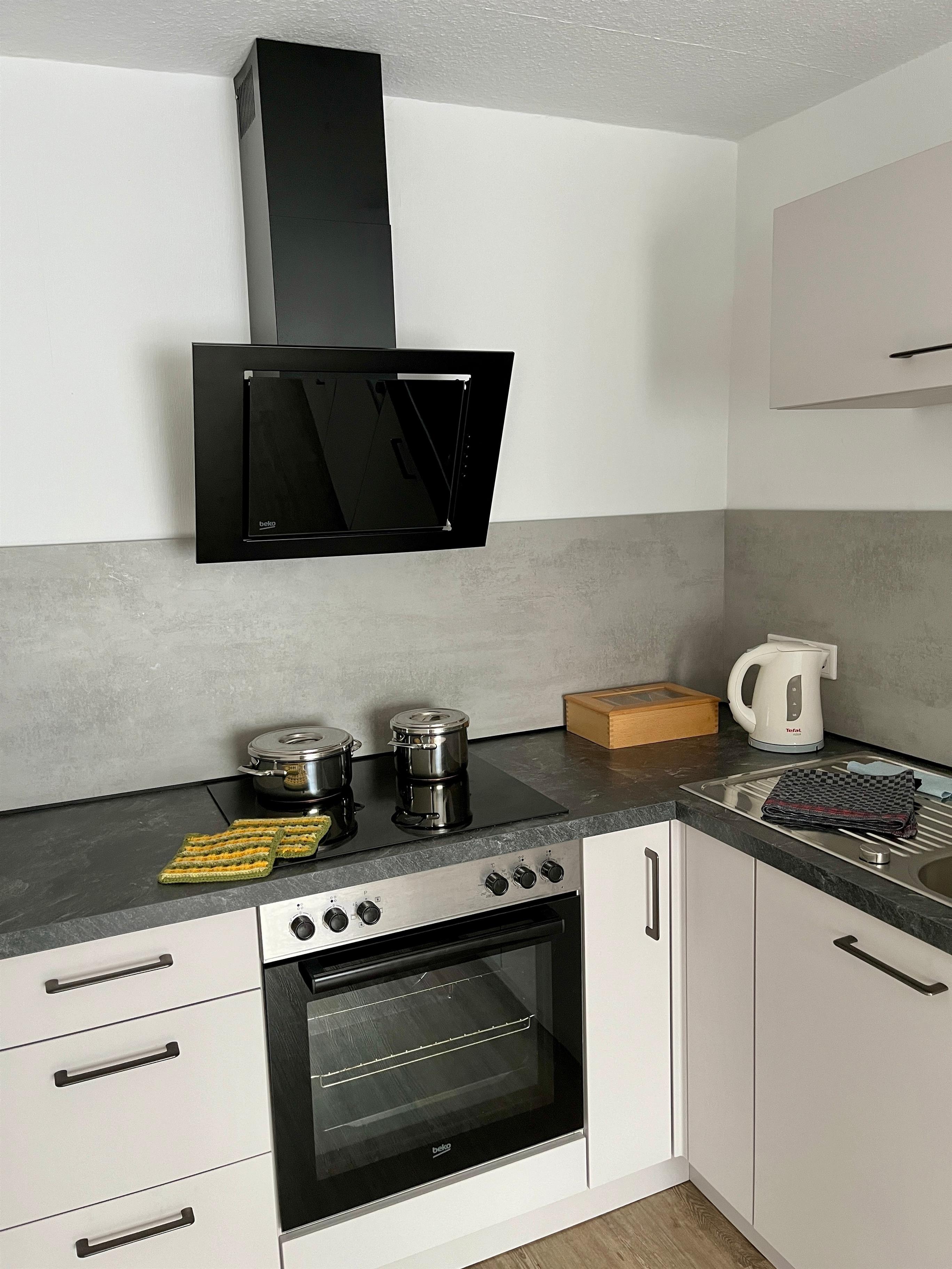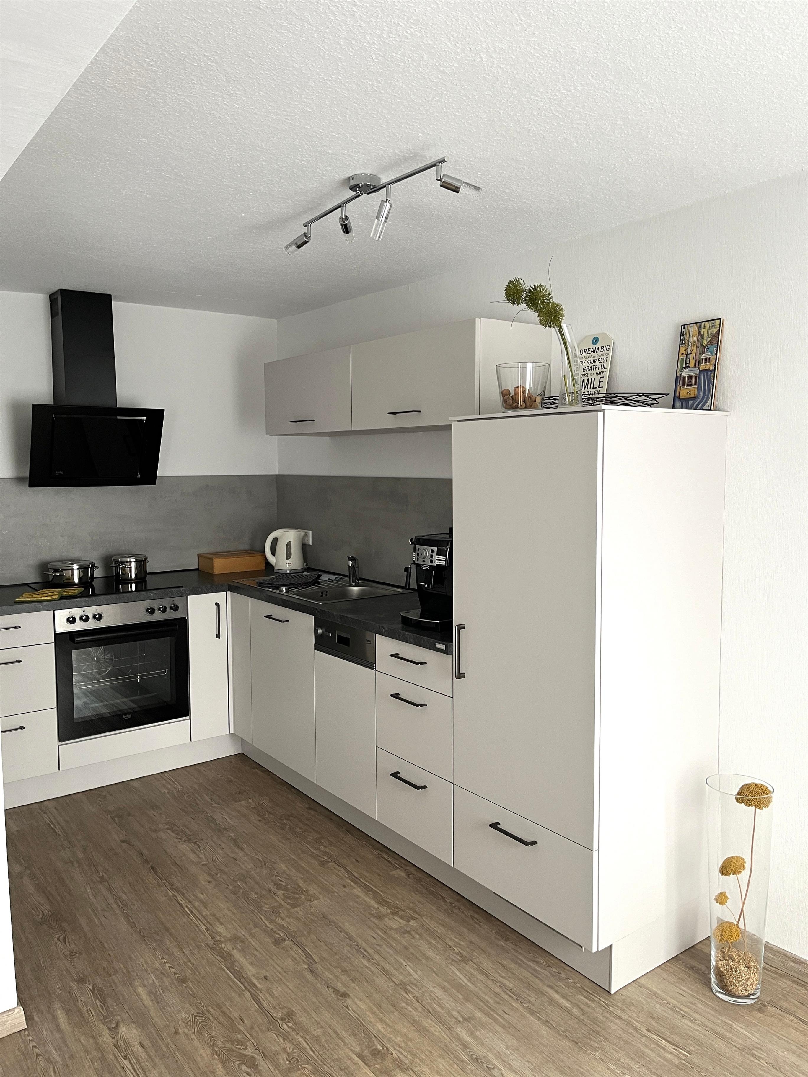 Küchenzeile mit E-Herd/4 Platten Ceranfeld und Backofen, Dunstabzugshaube, Kühlschrank mit Gefrierfach, Geschirrspüler, Kaffeeautomat, komplette Geschirr-, Besteck- und Kochausstattung