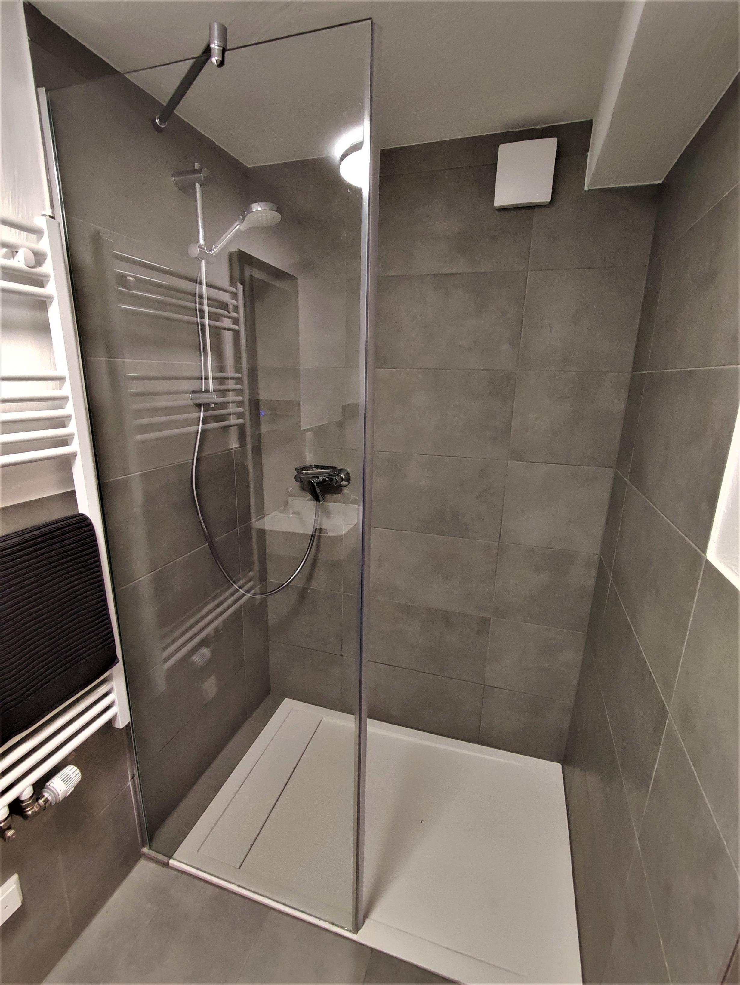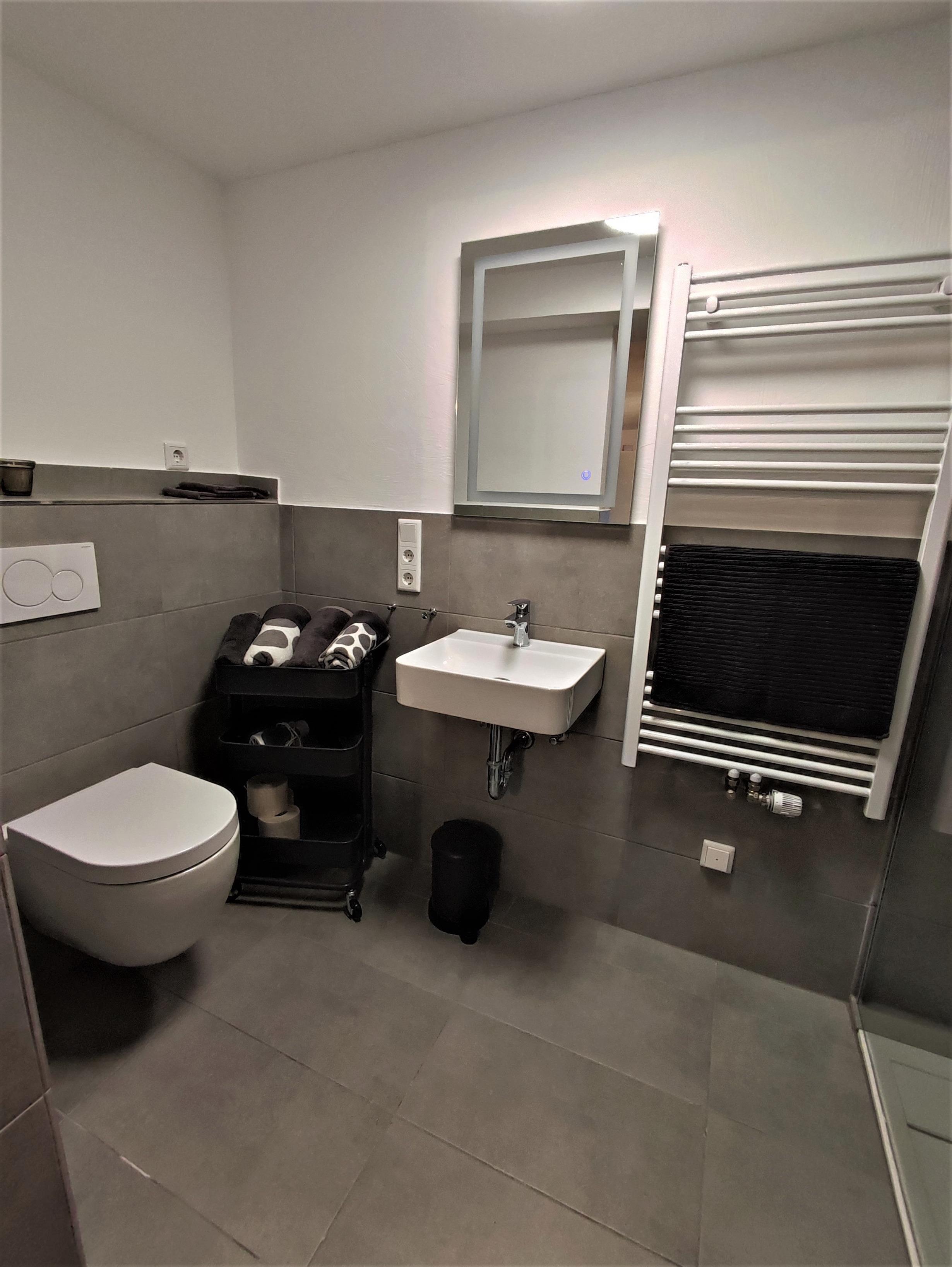 Bad/WC: Kleines Duschbad und WC, Waschtisch und Ablageflächen