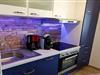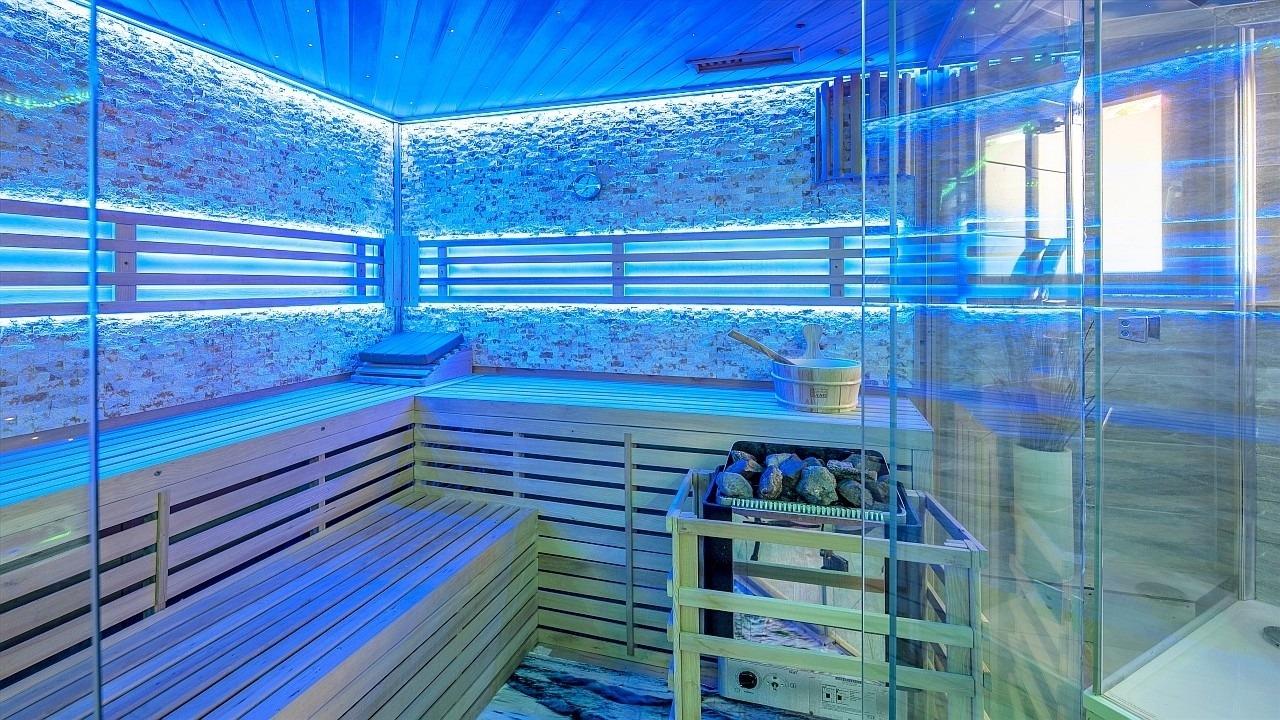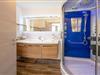 Die im gesamten Bad, blau leuchtenden Boden-LED´s bieten eine tolle Atmosphäre. Ein großer, beleuchteter Spiegel mit Uhrzeit, ein Hotelfön und eine Personenwaage sind vorhanden. Moderne Heizung aus Chrom mit Handtuchwärmer.