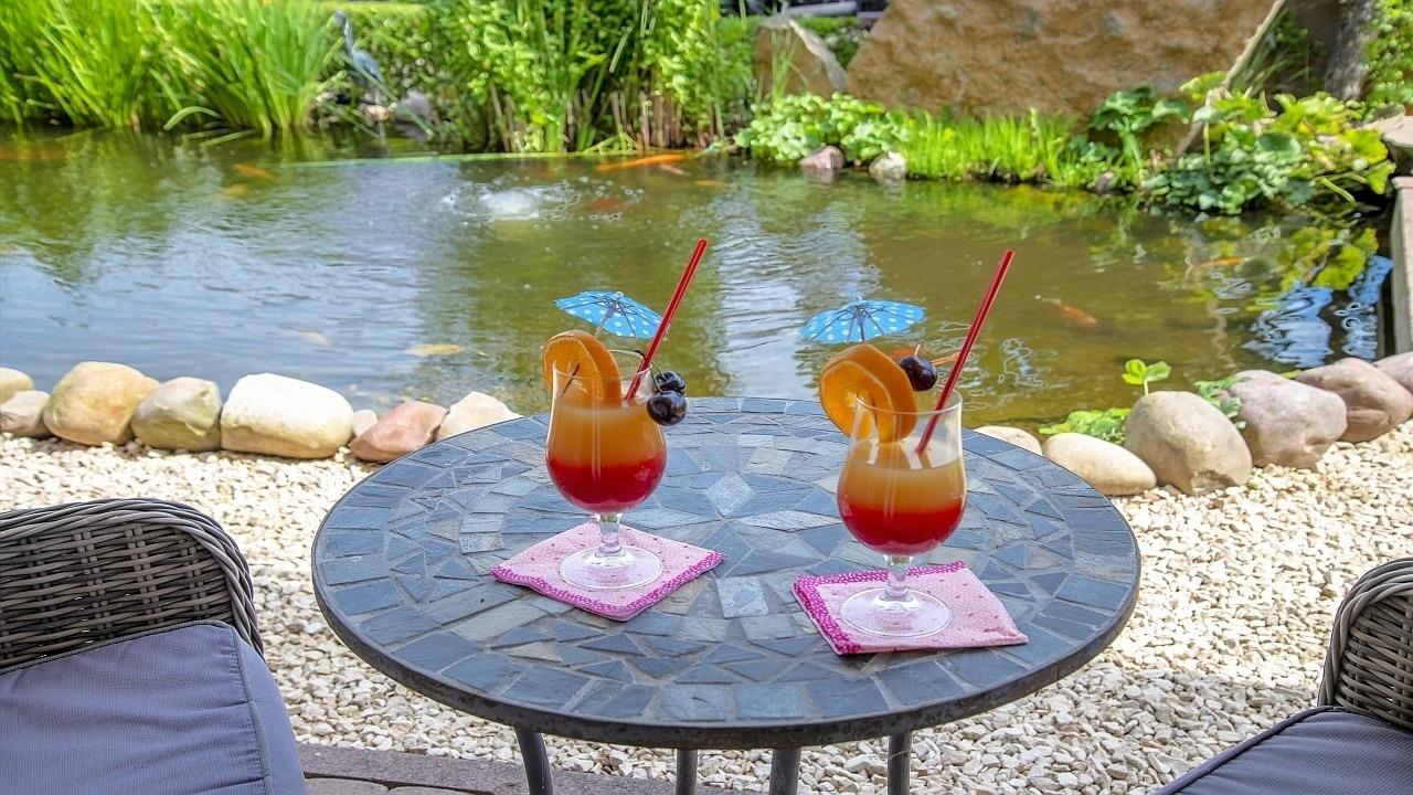 Zwei wundervoll und aufwendig angelegte Zierteiche mit Kois und anderen Fischen, 2 Wasserfälle, 2 Bachläufe und eine gepflegte Zierkiesanlage gehören zur Anlage. Die Aussenanlagen sind abends romantisch angestrahlt. In den Teichen befinden sich auch Schildkröten. Sitzen Sie gemütlich bei einem Kaffee oder einem Cocktail auf dem Balkon oder der Terrasse und schauen Sie den Fischen und den Schildkröten zu. Oder blicken Sie ins Tal auf den See.