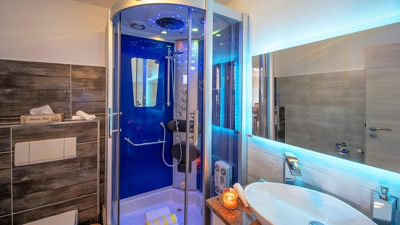 Die im gesamten Bad, blau leuchtenden Boden-LED´s bieten eine tolle Atmosphäre. Ein großer, beleuchteter Spiegel, ein Hotelfön und eine Personenwaage sind vorhanden. Moderne Heizung mit Handtuchwärmer.