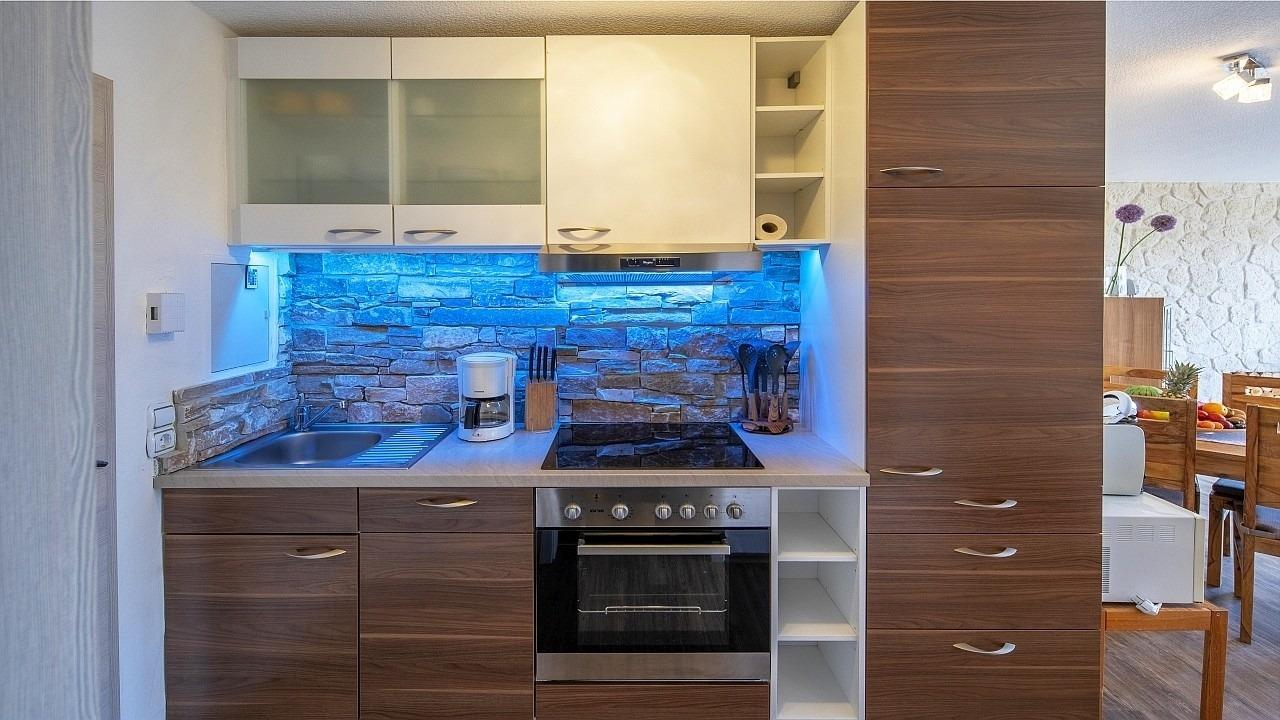 Die neue Einbauküche hat einen 4 Plattenherd (Ceranfeld) und Backofen, Spülmaschine, Kühlschrank mit Gefrierfach, Mikrowelle, 2 Kaffeemaschinen (Filter und Pad Maschine, Bosch-Tassimo). Toaster, Wasserkocher usw. Töpfe und Pfannen sowie Besteck und Geschirr für die höchstmögliche Personenzahl sind selbstverständlich vorhanden.