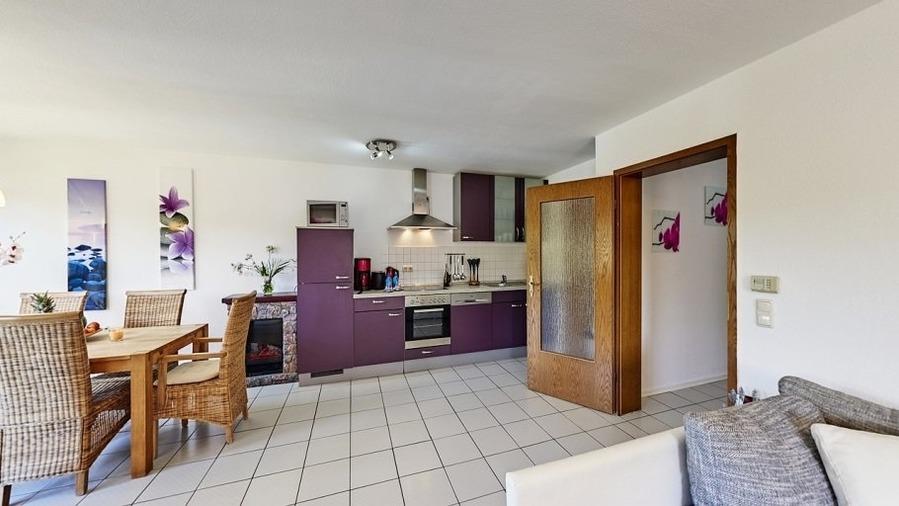 Großer Wohn-Schlafraum mit Doppelschlafsofa, Essecke mit See- und Panoramablick, 2 separate Schlafräume, davon ein Schlafraum mit großem Doppelbett und ein Schlafraum mit franz. Doppelbett (1,40 m breit), neue, hochwertige Küche mit Spülmaschine, 4 Platten-Ceranfeld, Backofen, Kühlschrank mit Gefrierfach, 2 Kaffeemaschinen: 1 x Kaffeemaschine für Pads und 1 x Filtermaschine, Abstellraum.