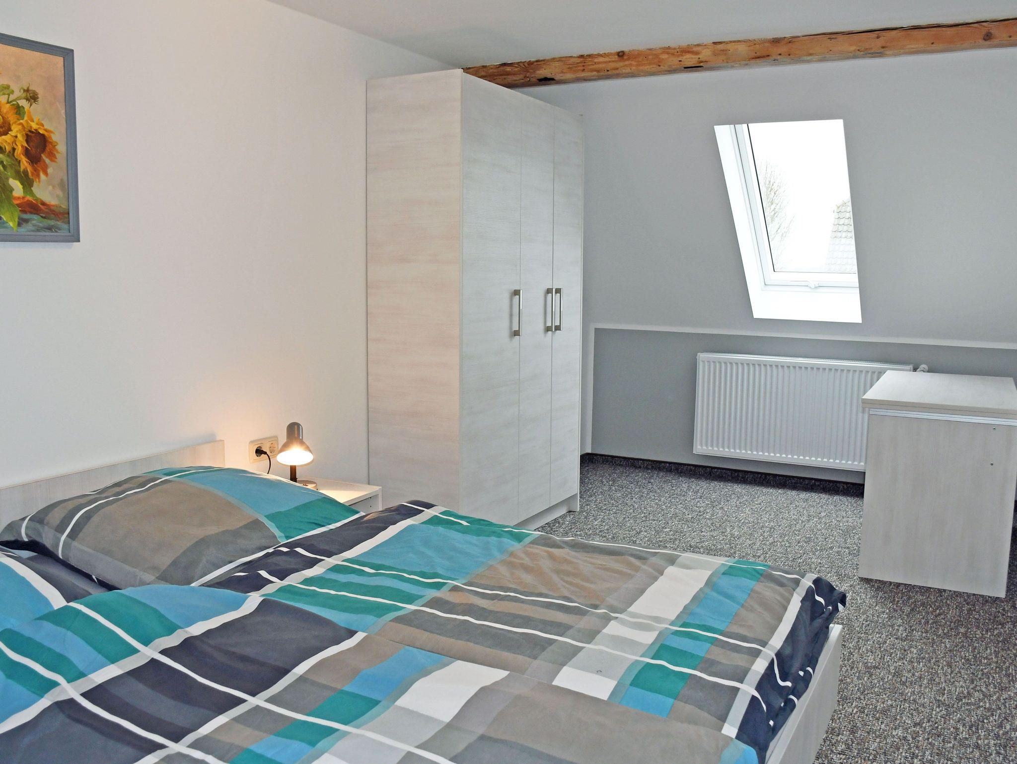 In dem im OG liegende großzügigen Wohnraum befinden sich eine Sitzcouch mit Tisch und Sessel, Leselampe und Flachbild-TV. Das im Obergeschoss befindliche Schlafzimmer ist mit einem bequemen Doppelbett mit Nachttischen und Leselampen sowie ein Kleiderschrank ausgestattet.