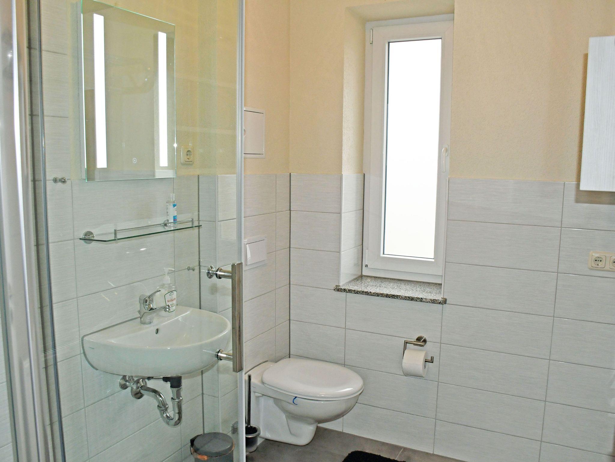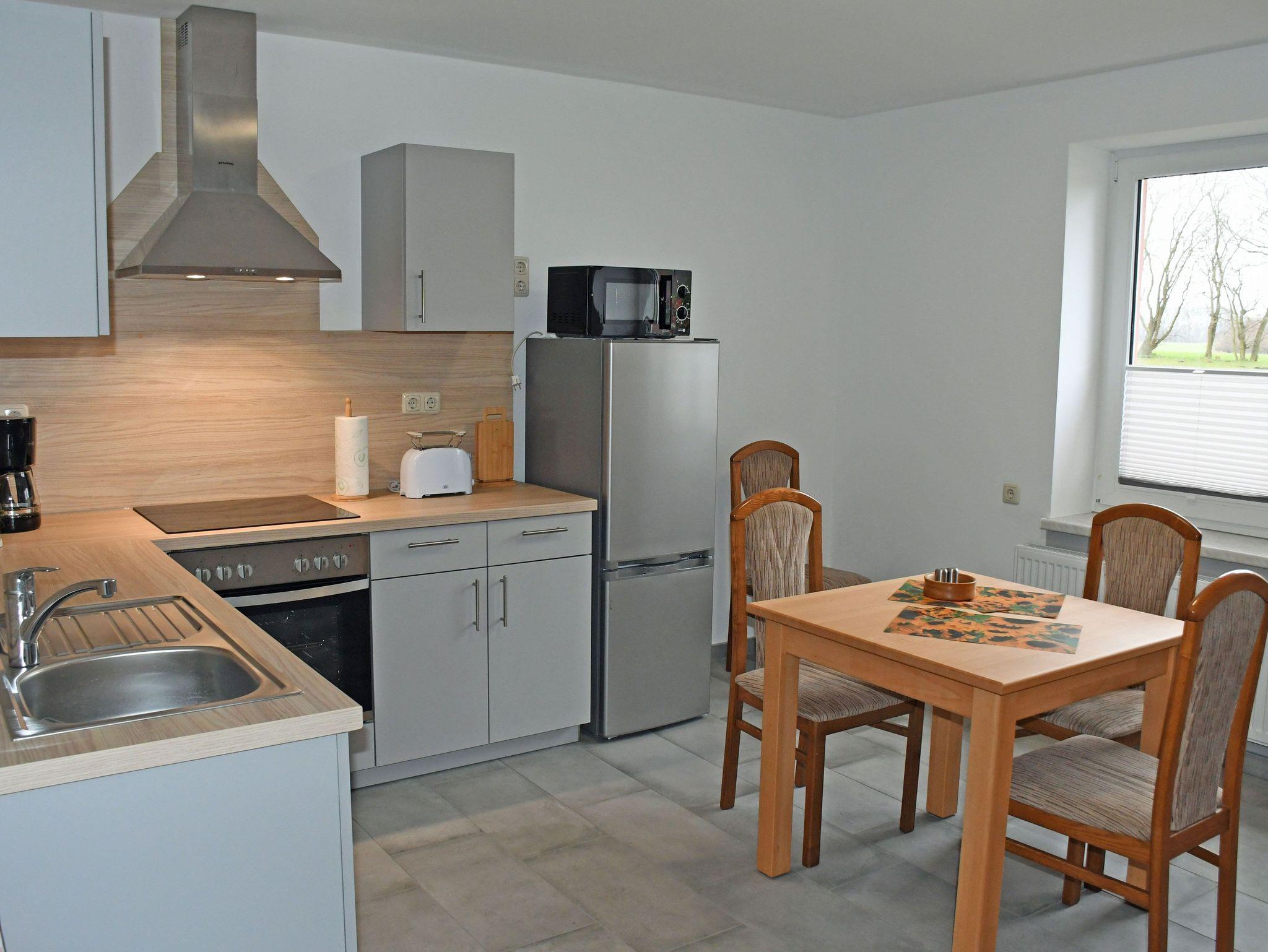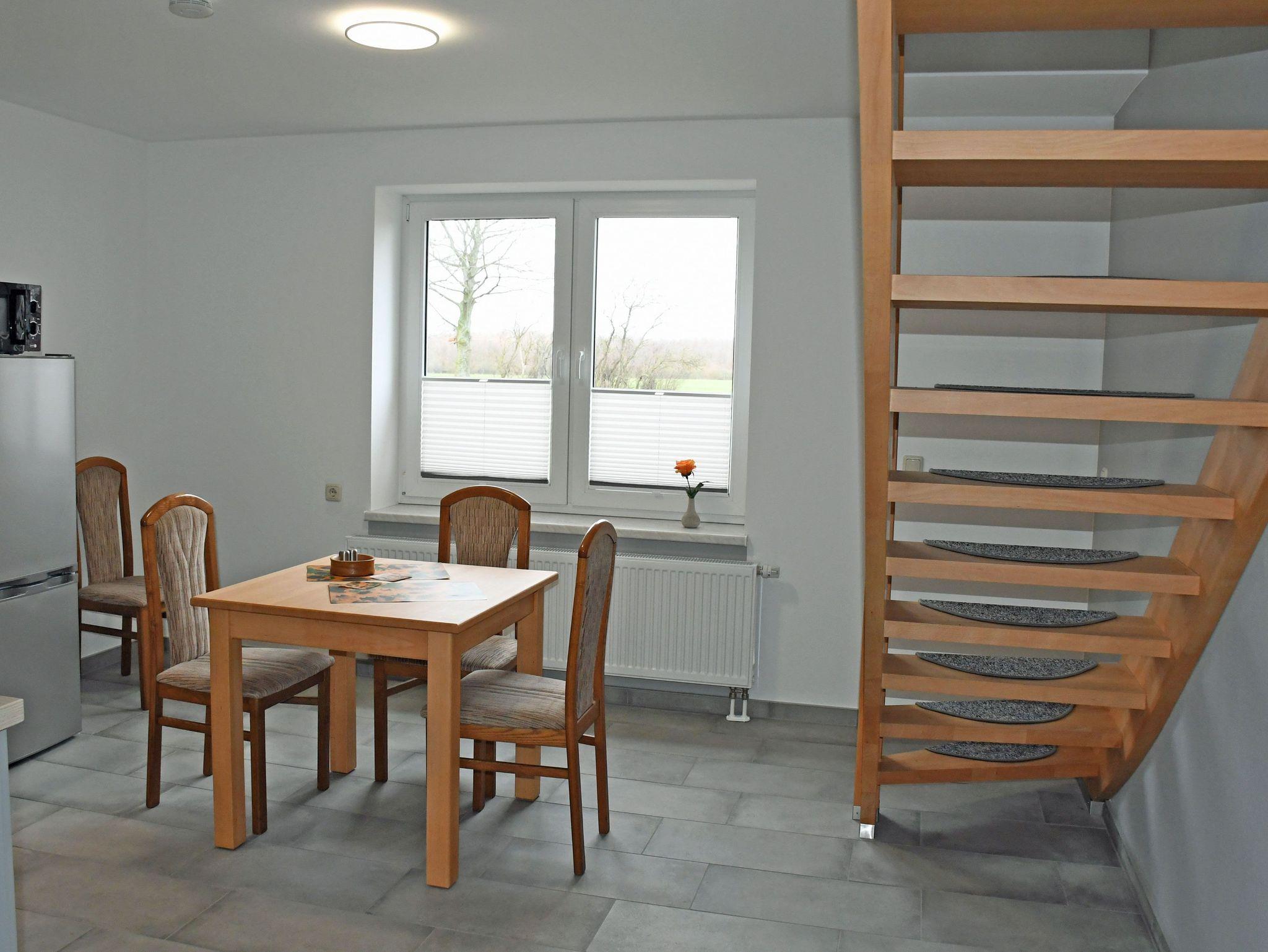 Im Erdgeschoss liegt die Küche. Hier steht auch ein Esstisch mit Stühlen. Die Küchenzeile ist mit einem Herd, Backofen, Wasserkocher, Kaffeemaschine, Toaster und Kühlschrank mit Gefrierfach komplett ausgestattet. Ebenfalls im EG liegt das Bad, es ist mit Dusche, WC und Waschtisch ausgestattet und verfügt über Tageslicht.
