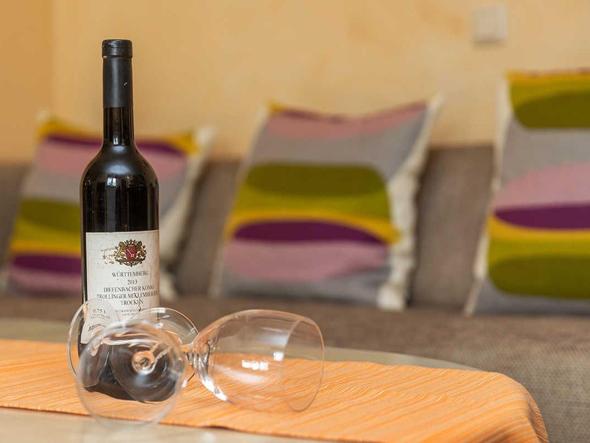 Das Urlaubsdomizil bietet auf 52 m² Platz für zwei Personen. Das Wohnzimmer verfügt über eine Couch mit Schlaffunktion (Aufbettung für max. eine Person nach Absprache möglich), Flachbild TV mit einer Bildschirmdiagonale von 60 cm mit Radiofunktion, einem Schreibtisch, sowie eine Küchenzeile mit Kühlschrank (integriertem kleinem Gefrierfach), zwei Platten Cerankochfeld, Kaffeemaschine, Toaster und Wasserkocher.
