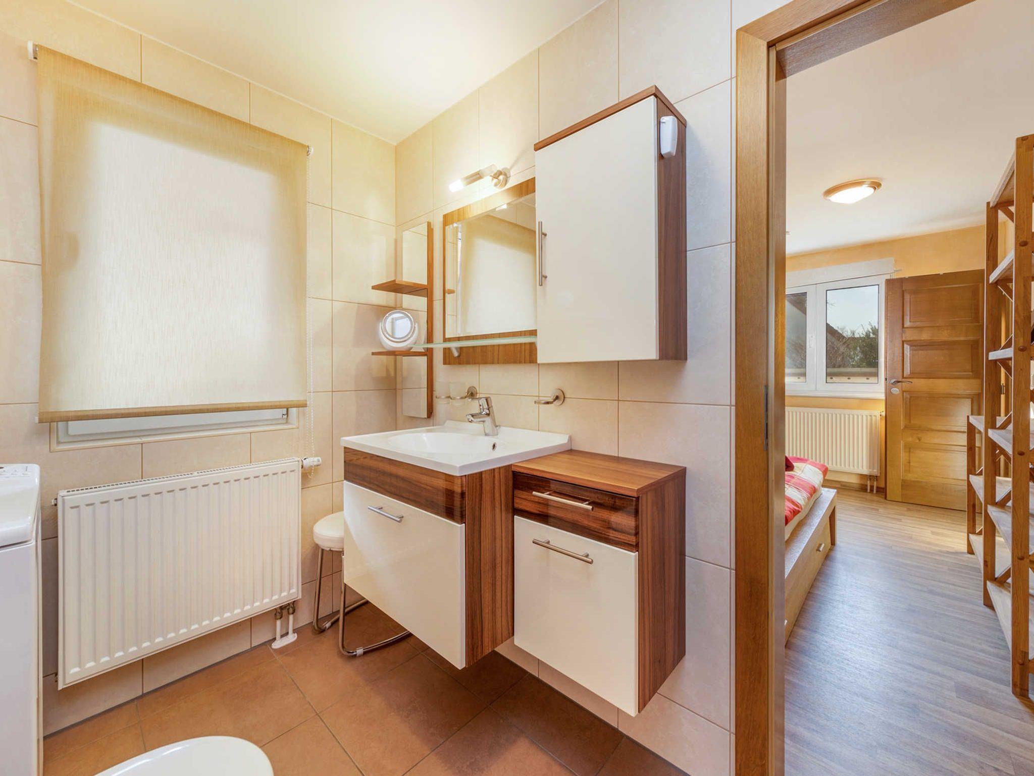 Das komplett verdunkelbare Schlafzimmer ist mit einem Doppelbett (1,40 m breit), einem Kleiderschrank und einem Regal ausgestattet. Direkt an das Schlafzimmer grenzt das Tageslichtbad, dieses ist mit Dusche / WC, Waschtisch und Fön ausgestattet.