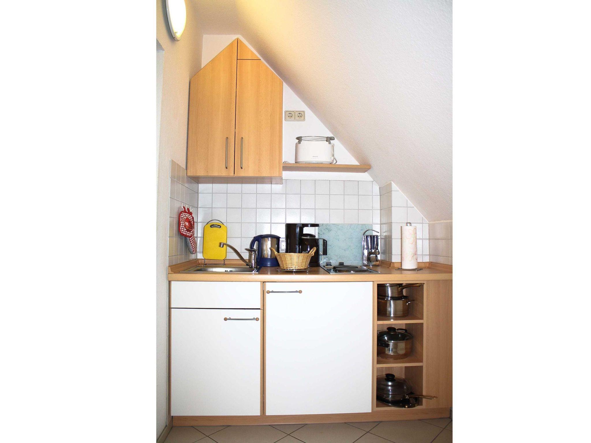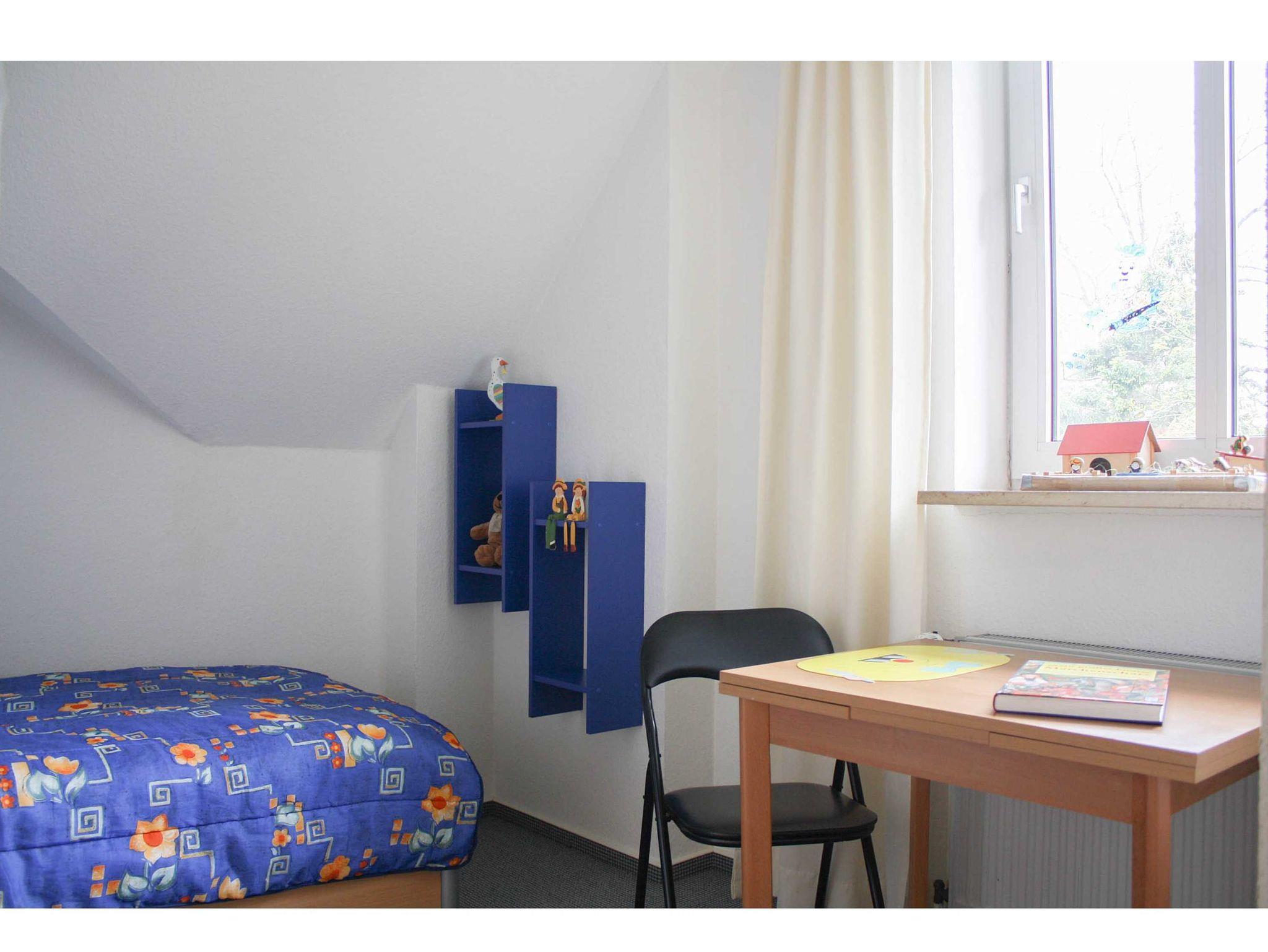 Die 2-Zimmerwohnung liegt im Dachgeschoß zur Westseite und ist für 2-3 Personen eingerichtet. Sie besteht aus einem kombinierten Wohn ? Schlafraum mit Schrankbett, Essecke, Farb-TV, Radio, separater Pantryküche ausgesattet mit Kaffeemaschine, Toaster und Wasserkocher, Duschbad, Kinderzimmer mit Einzelbett und PKW-Stellplatz. Nicht für Handwerker / Monteure geeignet.