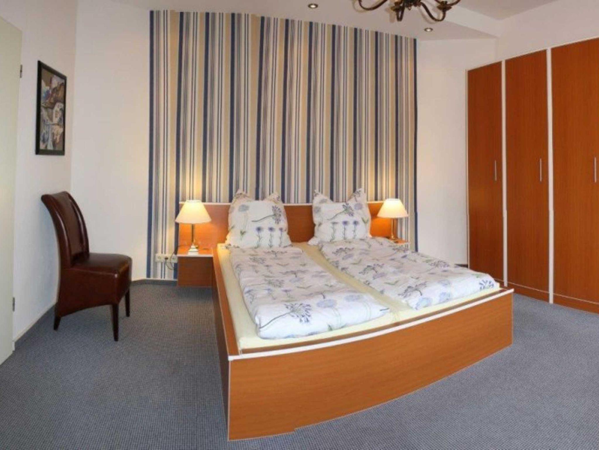 Die 2-Zimmerwohnung liegt im Erdgeschoß mit Gartensitzplatz zur Westseite und ist für 2-4 Personen eingerichtet. Sie besteht aus einem Wohnraum mit Schrankbett, Farb-TV, Radio, Einbauküche ausgestattet mit Kaffeemaschine, Toaster und Wasserkocher, Essdiele, Duschbad, Schlafraum mit Doppelbett und PKW-Stellplatz. Nicht für Handwerker / Monteure geeignet.