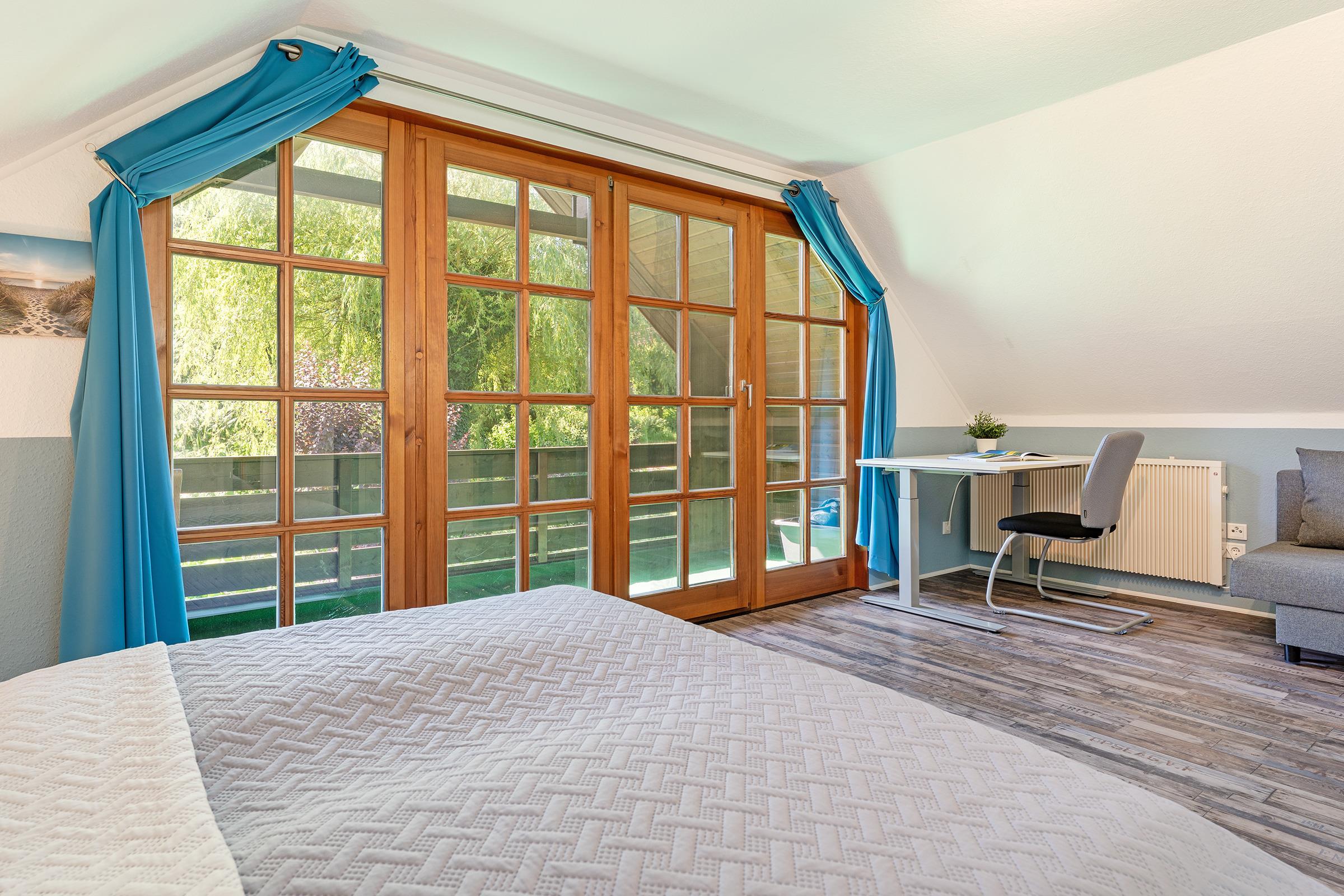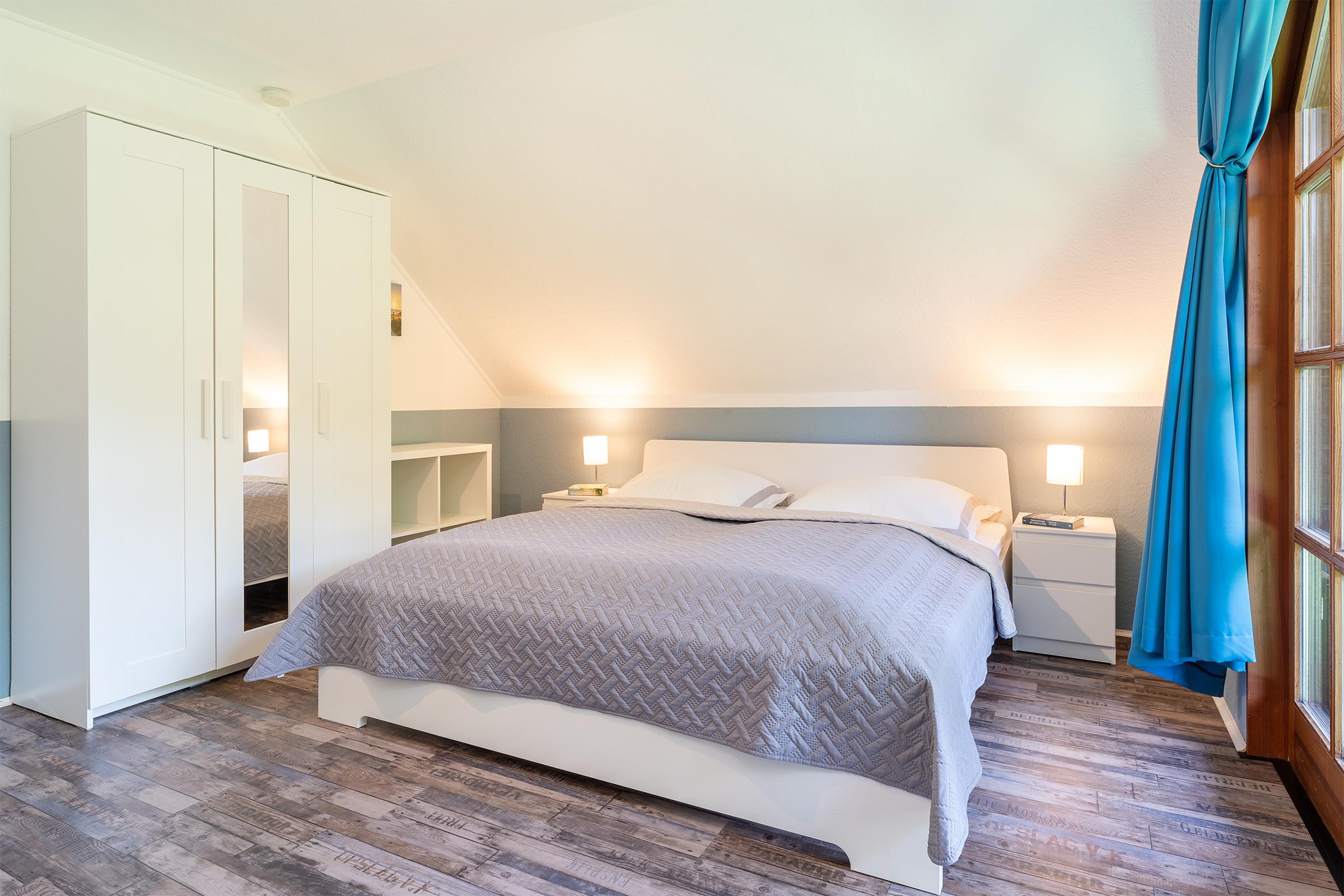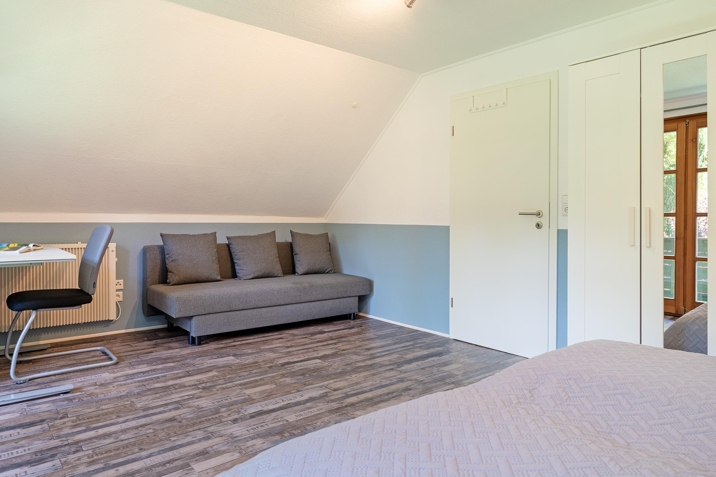 Schlafzimmer 1: Doppelbett (2x 90x200 cm), Schlafsofa (130x190 cm), Kleiderschrank, Verdunkelung: lichtundurchlässiger Vorhang, Platz für ein Babybett vorhanden