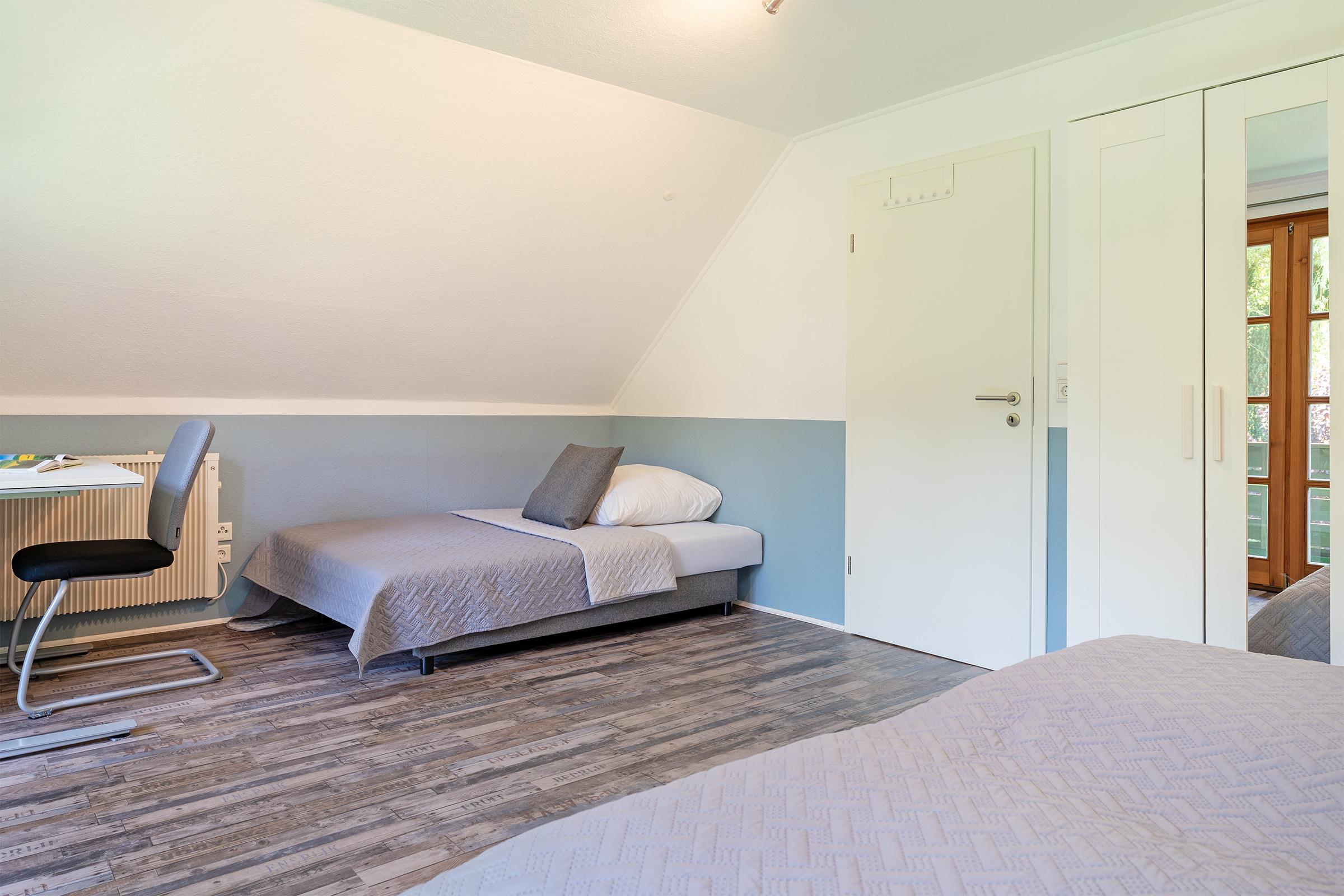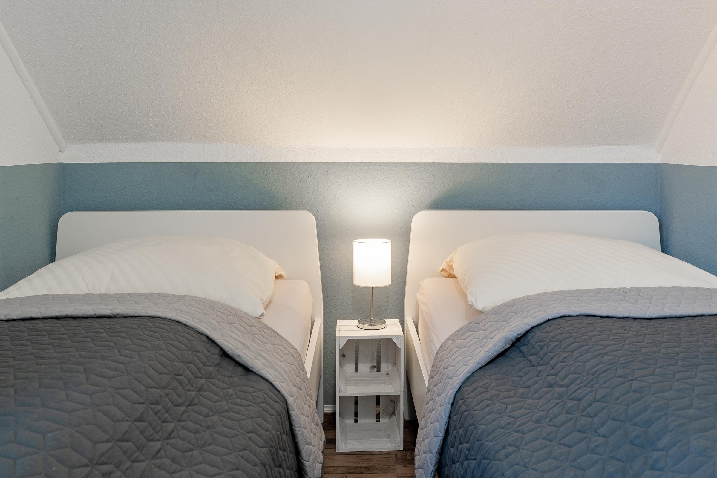 Schlafzimmer 2: 2 Einzelbetten (ja 90x200 cm), Kleiderschrank, Verdunkelung: lichtundurchlässiger Vorhang, kein Platz für ein Babybett