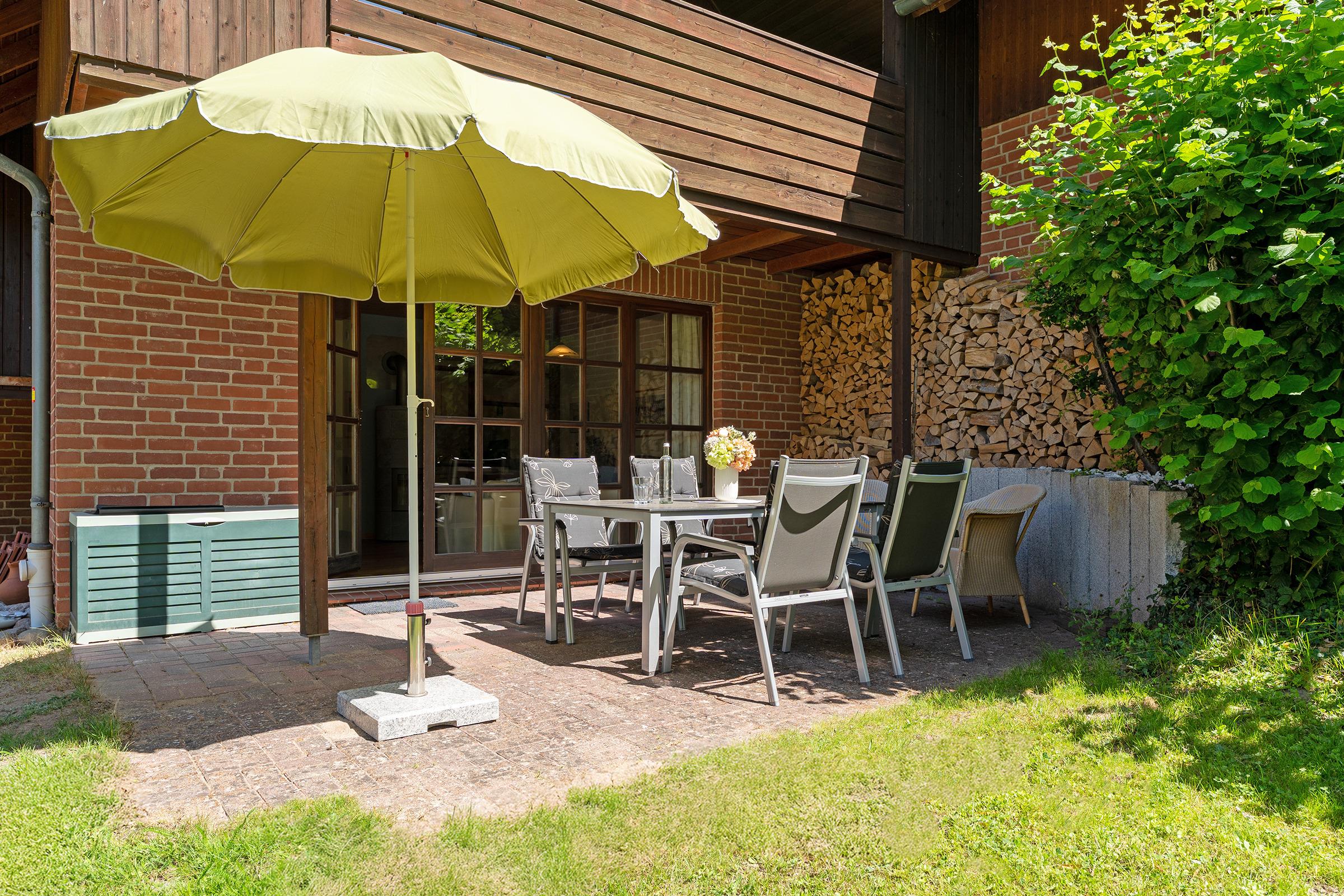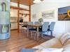 Das charmante Reihenhaus überzeugt mit einem gemütlichen Wohnbereich, der sich über das Erdgeschoss und das erste Obergeschoss verteilt. Liebevolle Details wie nostalgische Sprossenfenster, sichtbare Holzbalken und eine warme Holzdecke schaffen eine behagliche Atmosphäre. Ein Fernseher bietet Unterhaltung, der Kaminofen steht aus Sicherheitsgründen nicht zur Nutzung bereit. Vom Wohnbereich gelangen Sie direkt auf die möblierte Terrasse – perfekt für entspannte Stunden im Freien. Der überdachte Balkon im Obergeschoss lädt ebenfalls zum Verweilen ein.