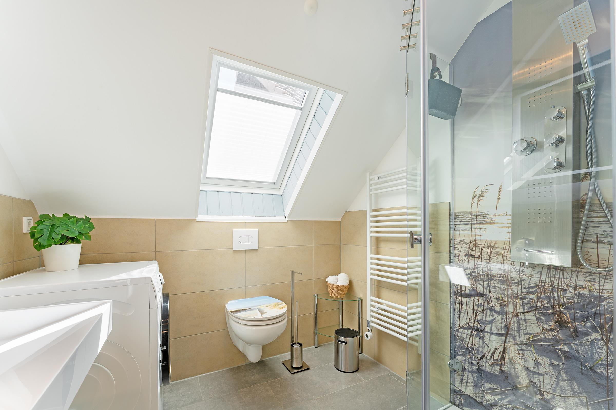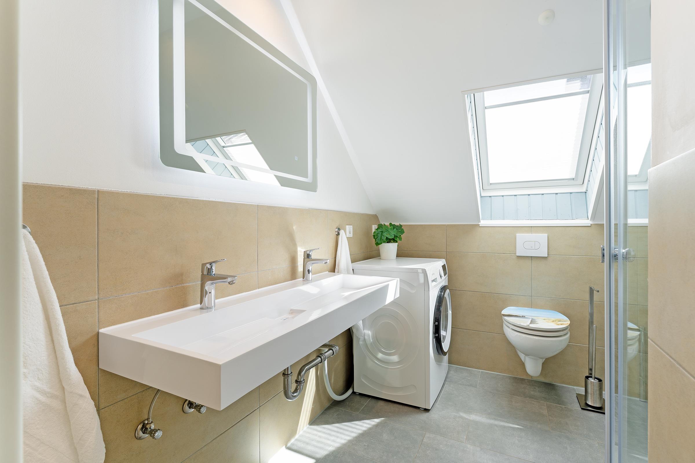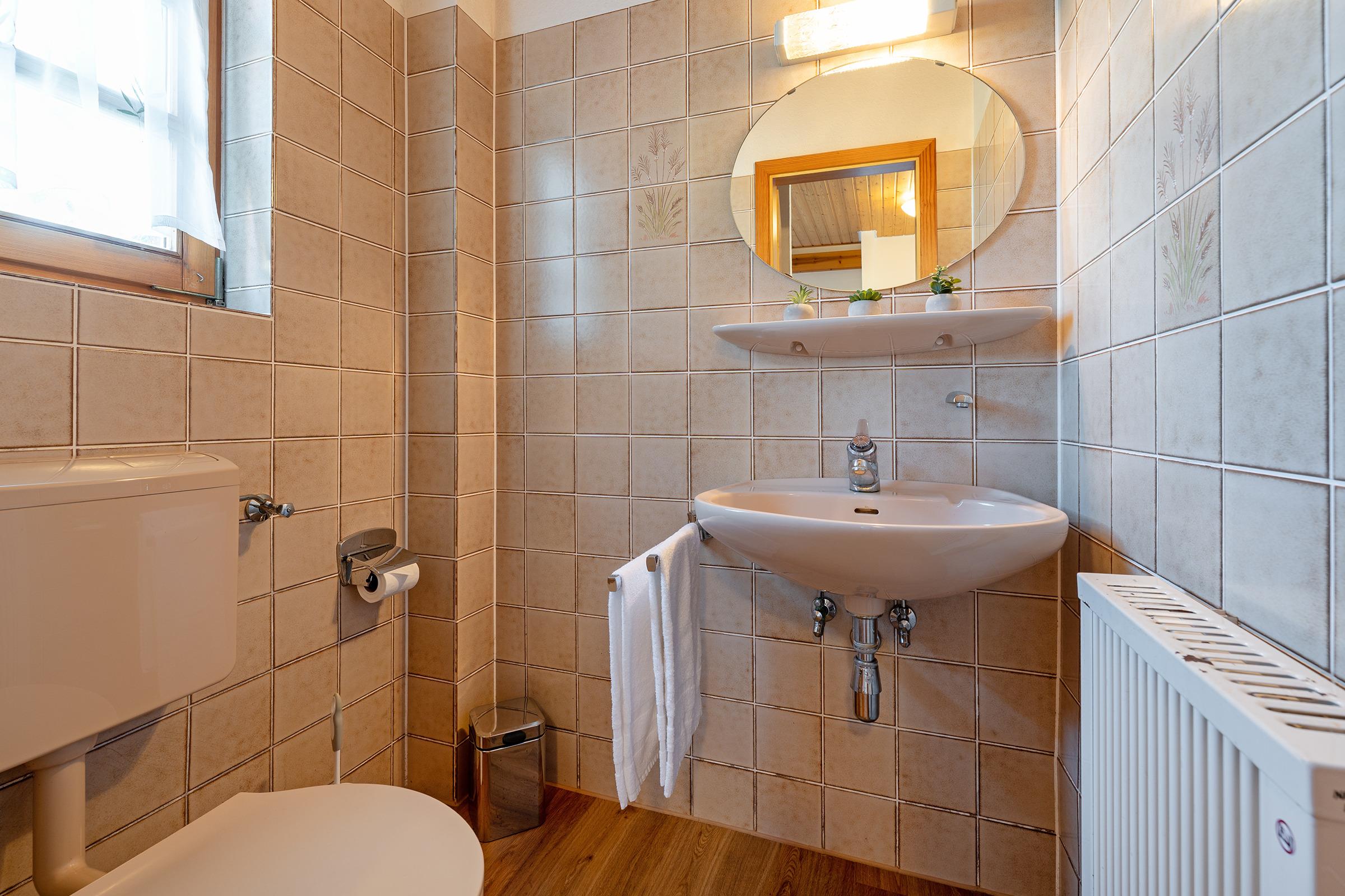 Das helle Tageslichtbad verfügt über Dusche mit Duschwanne und WC. Ein Gäste-WC ergänzt den Komfort. Für Familien stehen sowohl ein Kinderreisebett als auch ein Hochstuhl bereit.