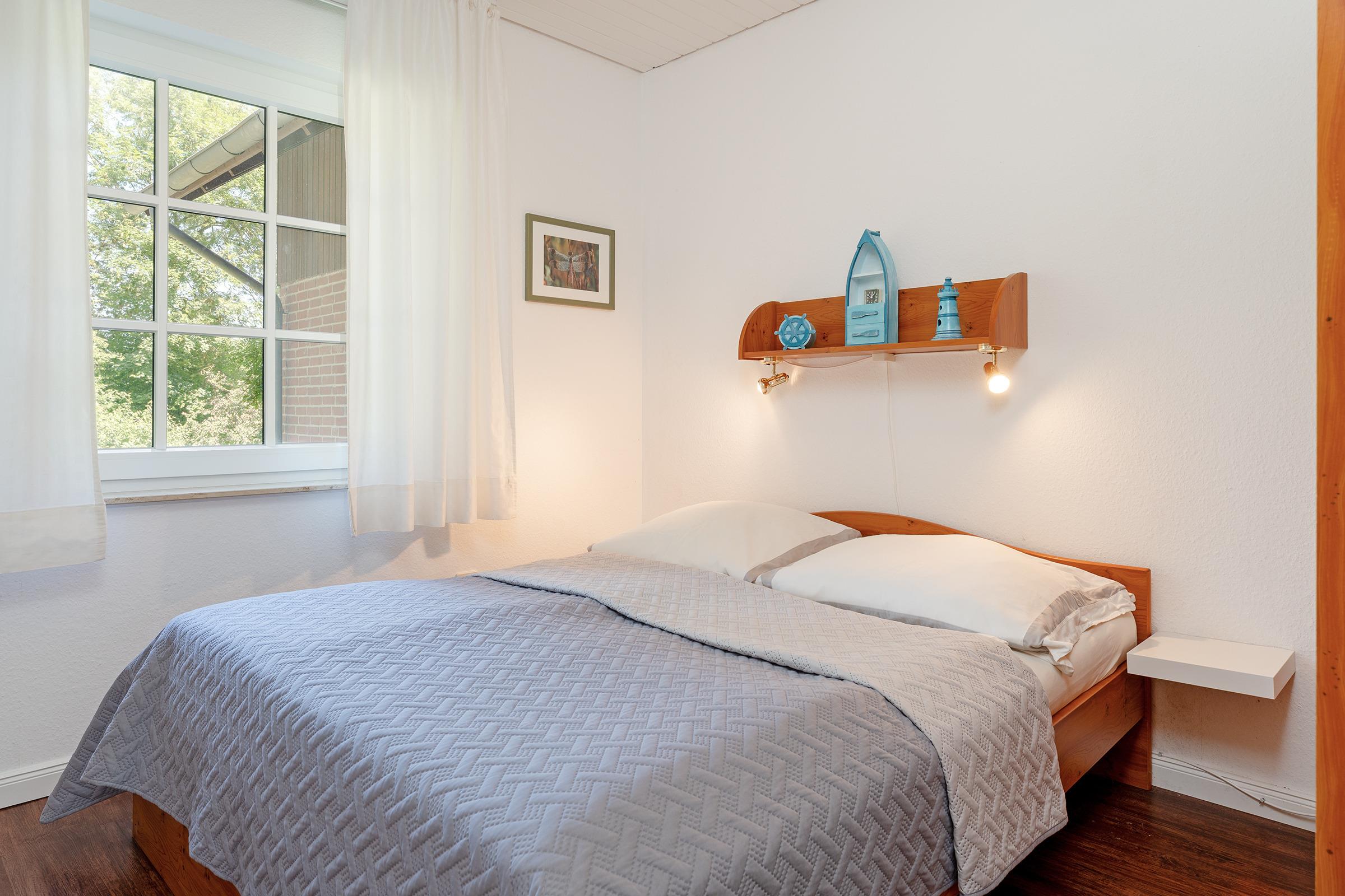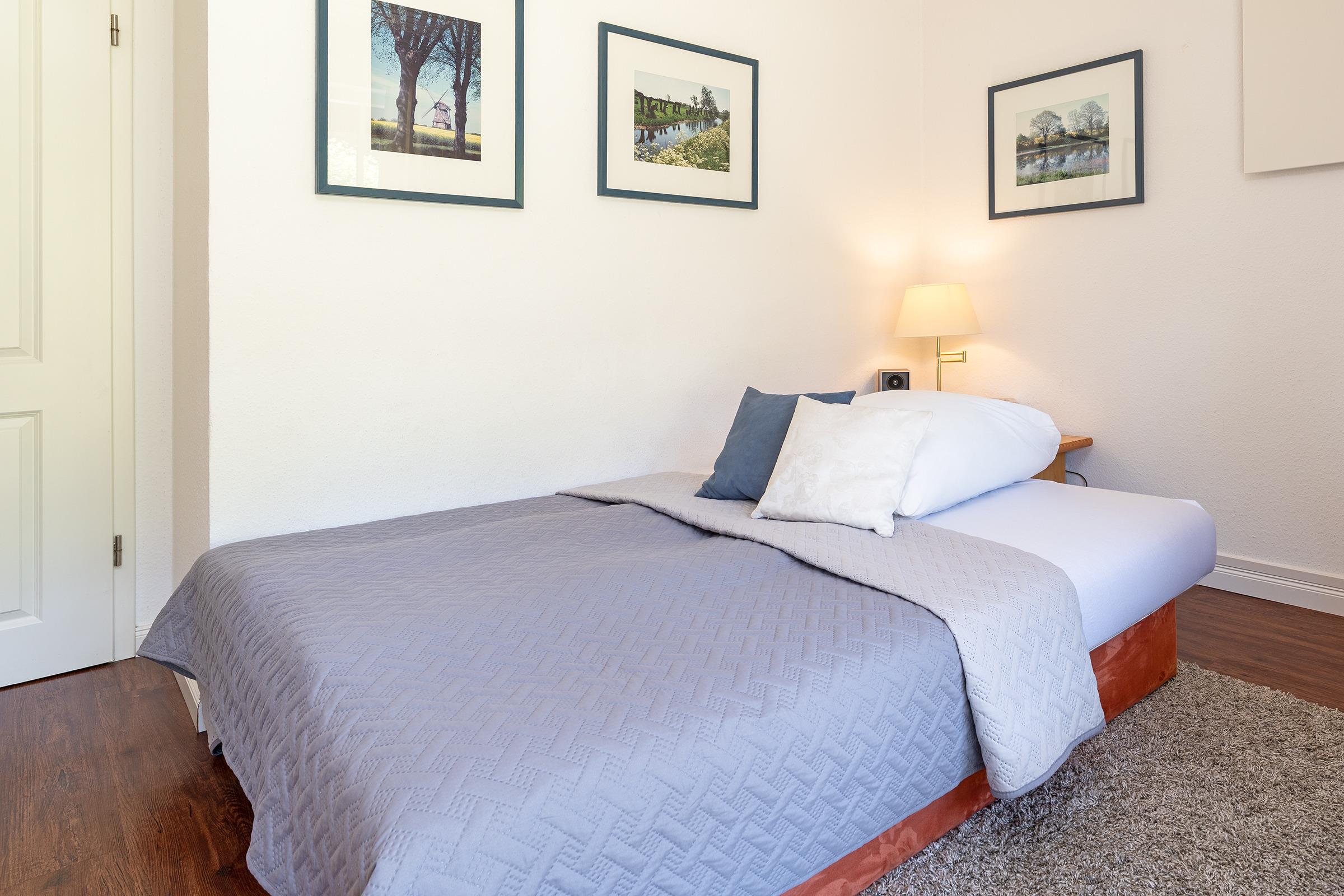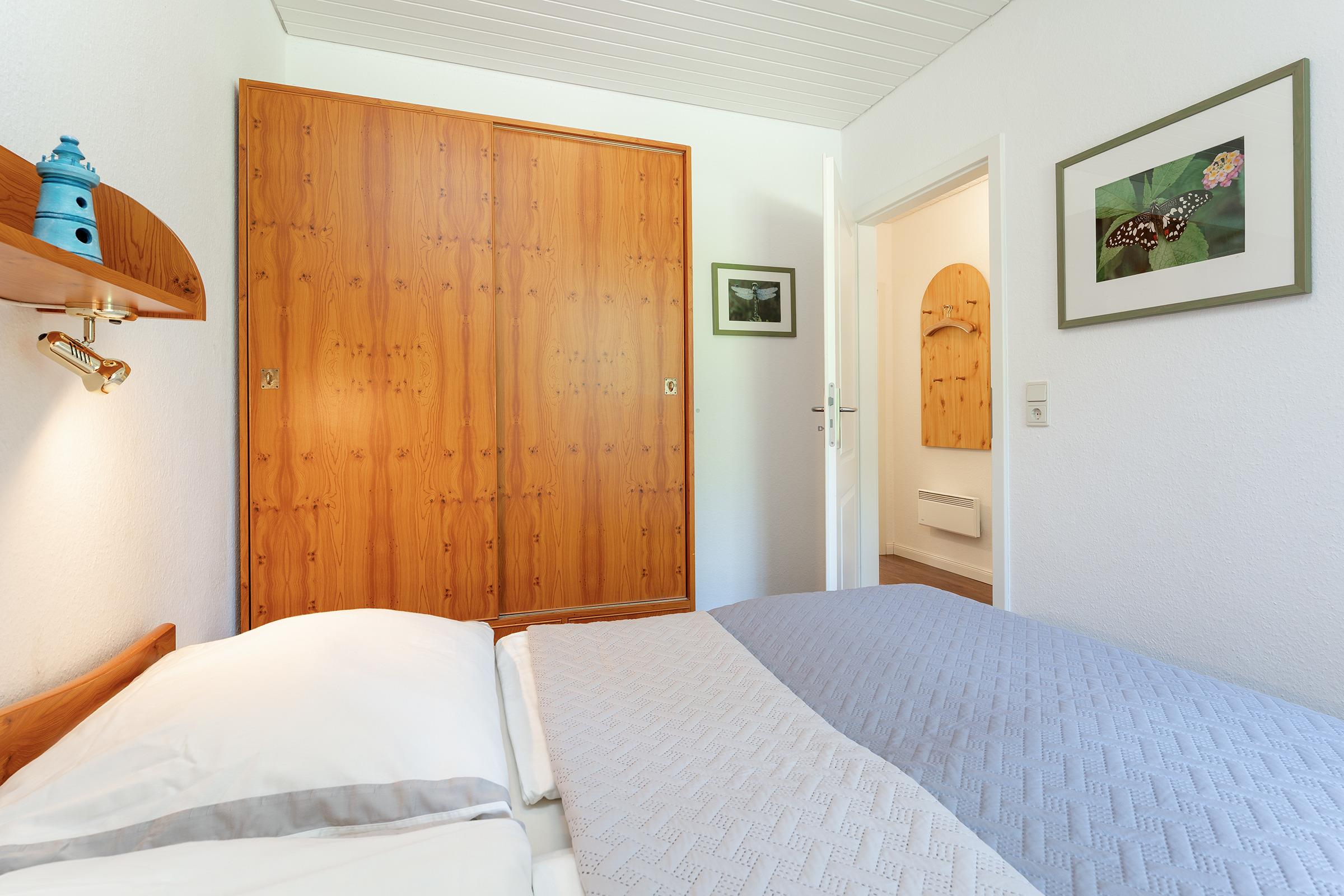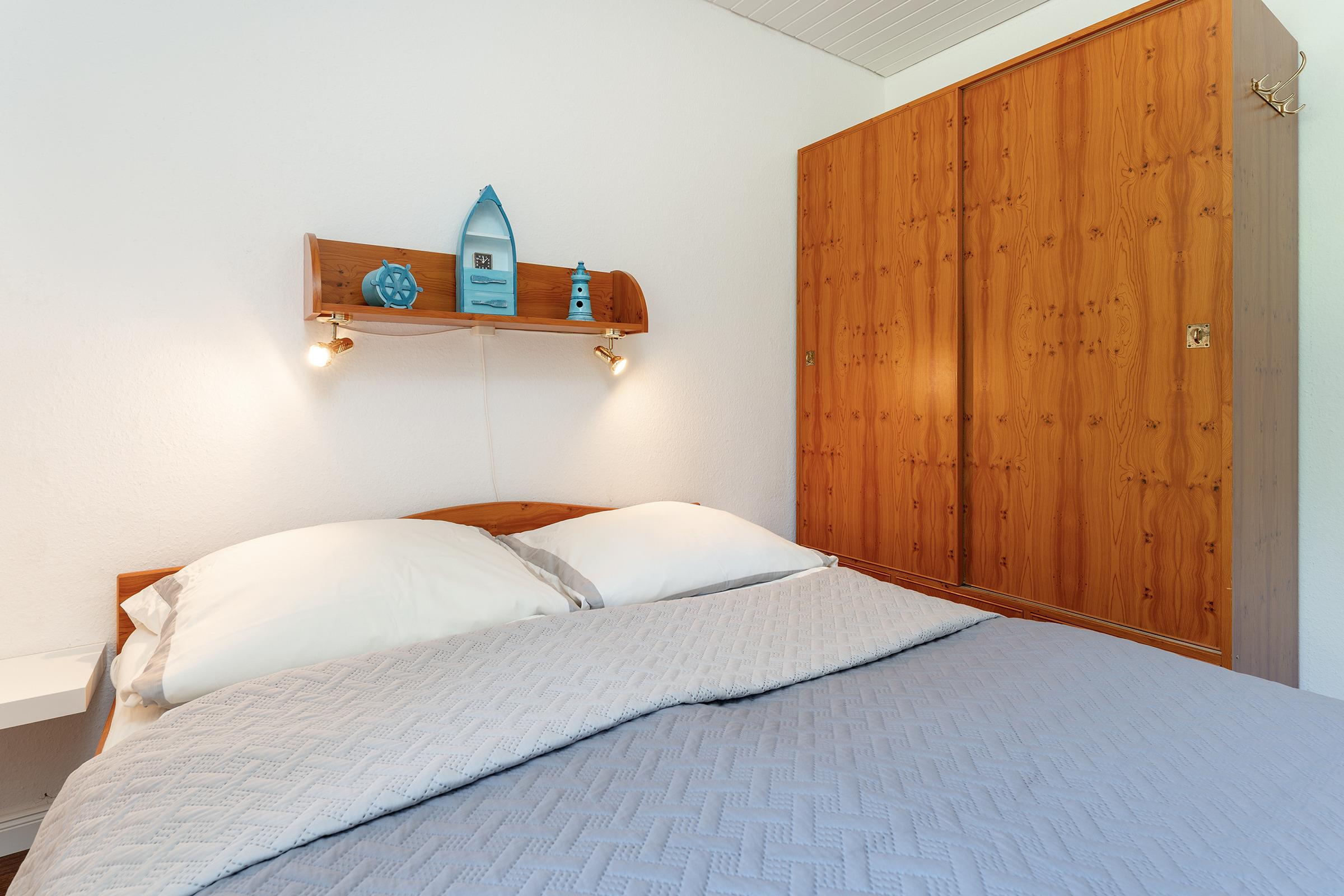 Schlafzimmer 1: Doppelbett (2x 80x190 cm), Kleiderschrank, Verdunkelung: Vorhänge, kein Platz für ein Babybett vorhanden