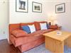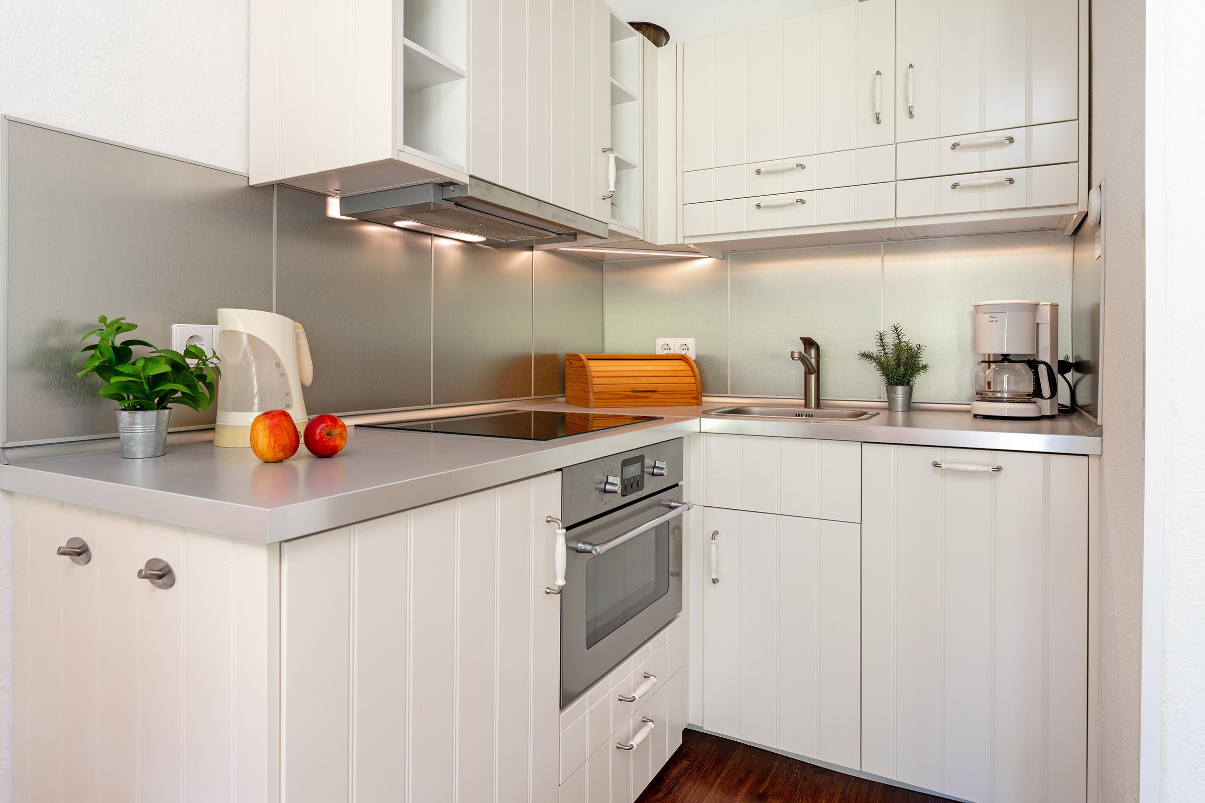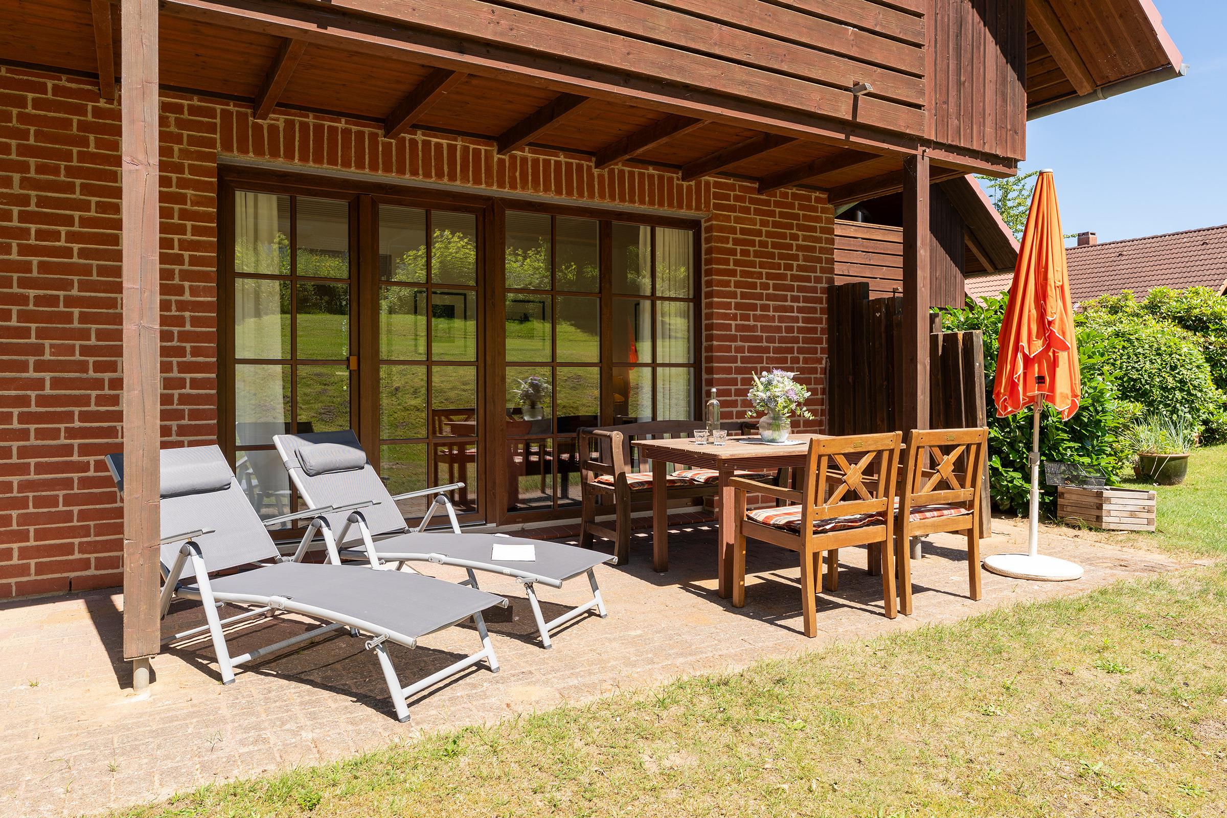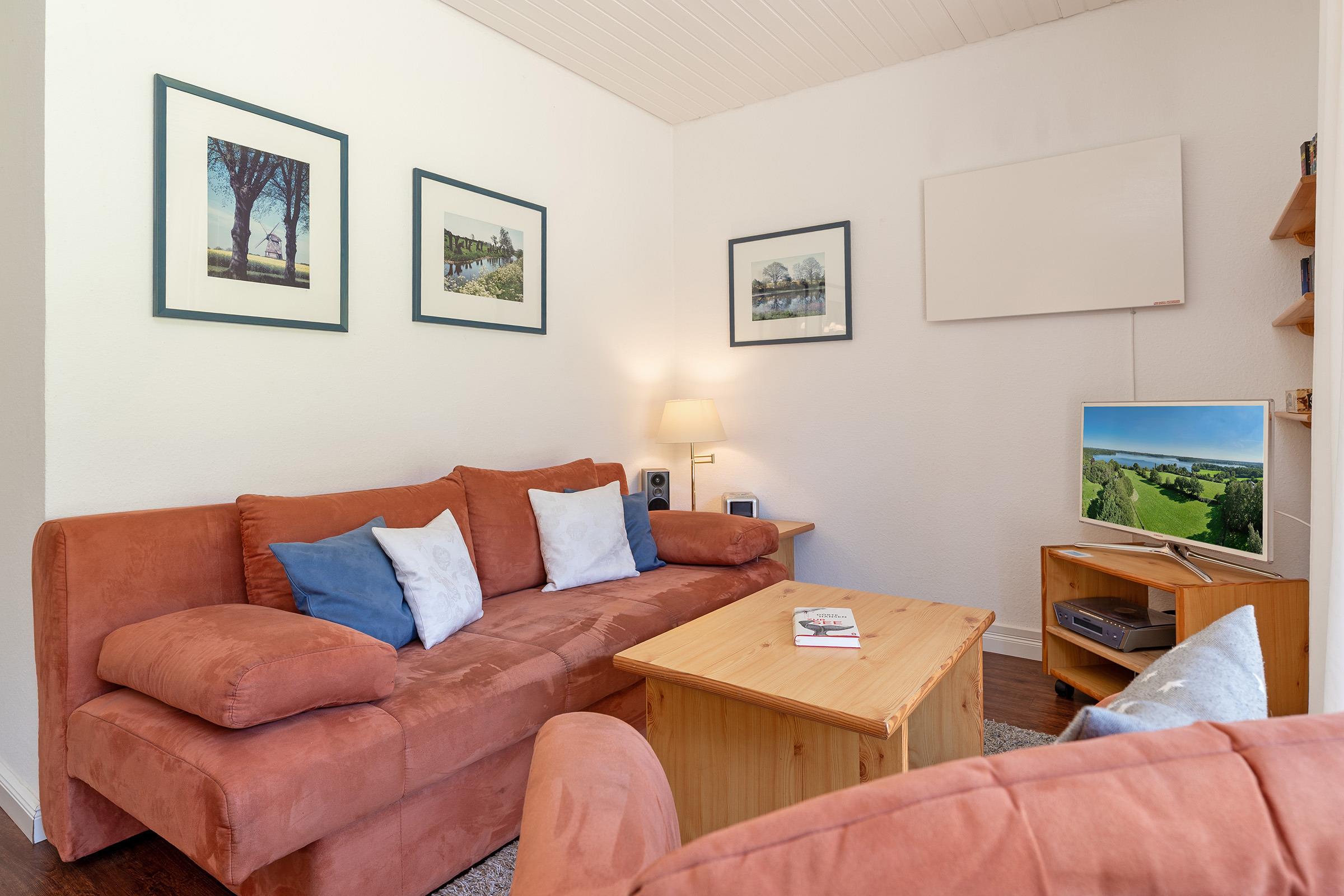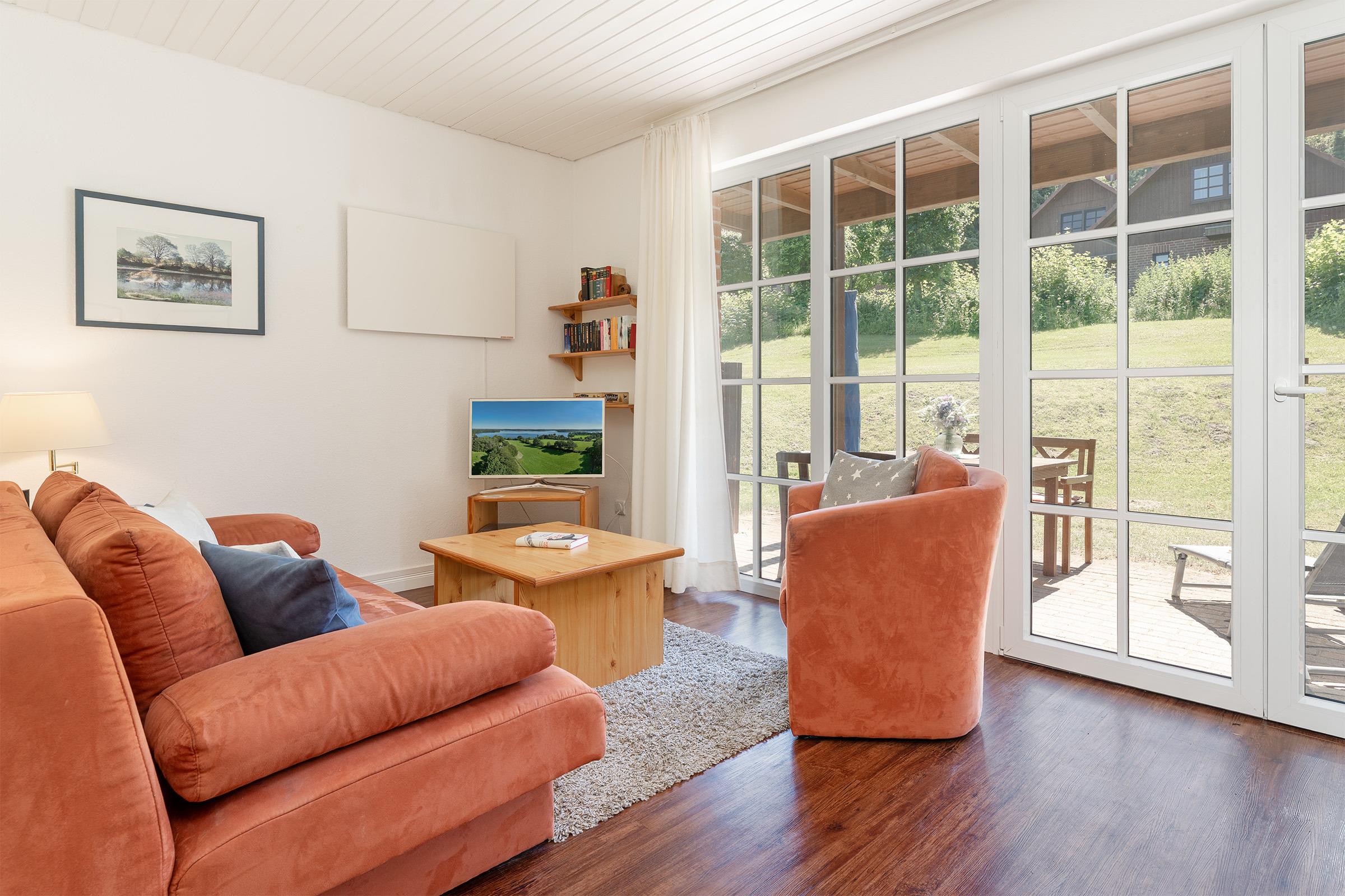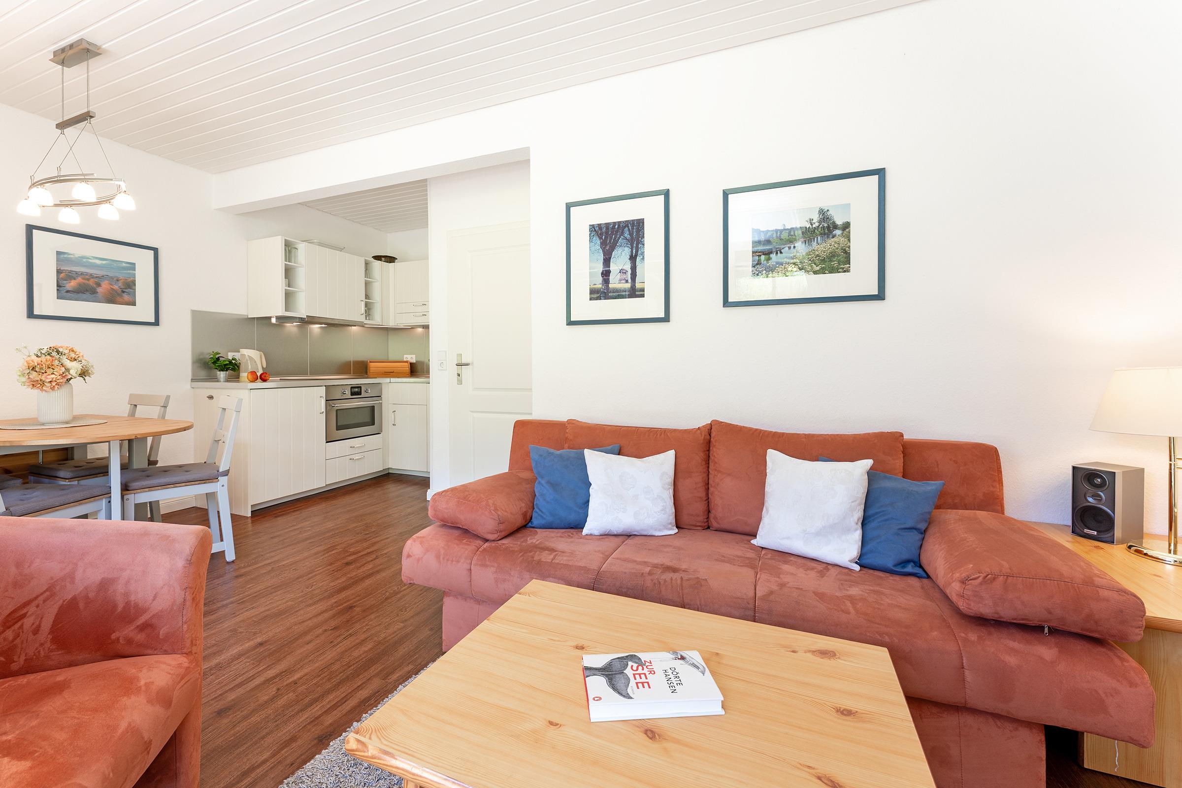 Der Wohnbereich lädt mit stilvollem Interieur zum Entspannen ein. Vom Wohnraum aus gelangen Sie direkt auf die möblierte Terrasse, die an sonnigen Tagen zum Frühstück im Freien oder entspannten Grillabenden einlädt. In der voll ausgestatteten Küche mit Geschirrspüler, Kaffeemaschine und Kombigerät Mikrowelle/Backofen können Sie sich ganz nach Wunsch selbst versorgen. Der angrenzende Essbereich bietet ausreichend Platz für gemeinsame Mahlzeiten. Das Schlafsofa bietet Ihnen angenehme Nachtruhe. Das Schlafzimmer verfügt über ein Doppelbett und einen Kleiderschrank.