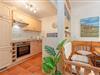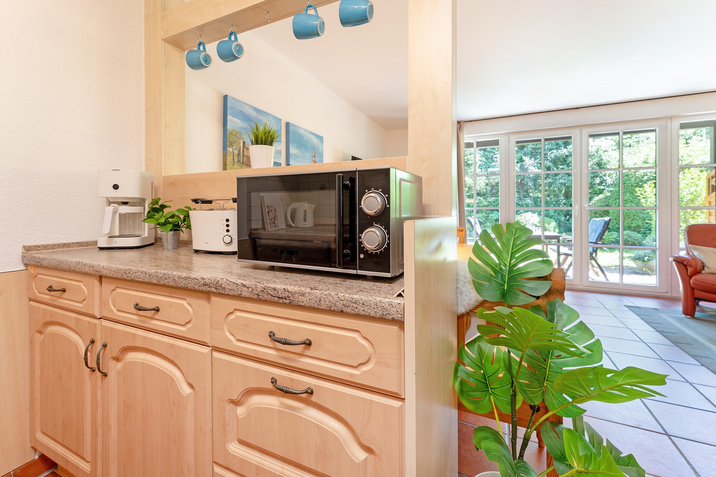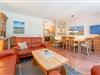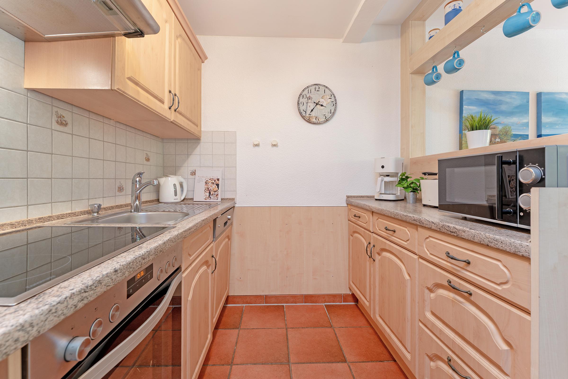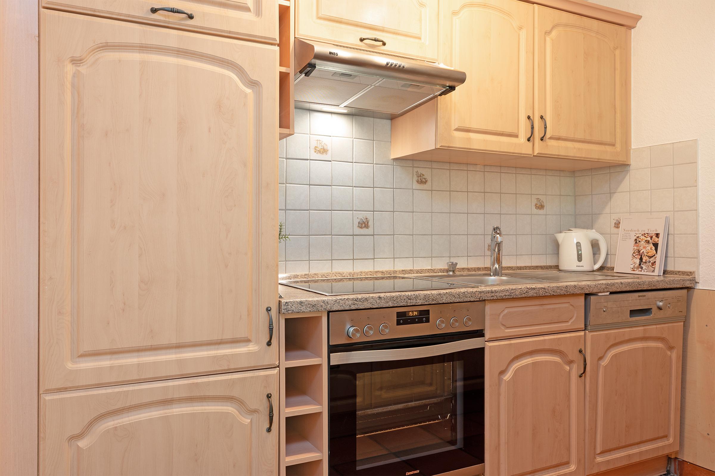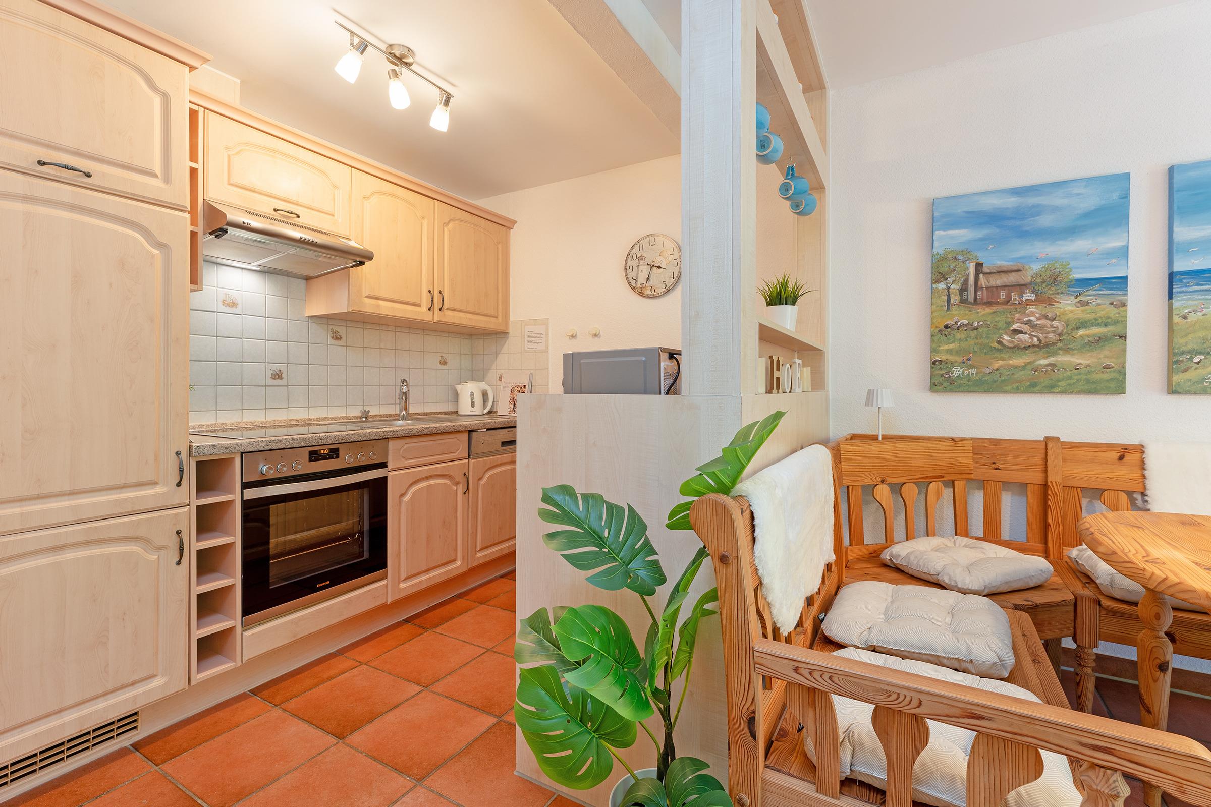 Die Küche ist umfangreich ausgestattet mit Backofen, Mikrowelle, Kaffeemaschine, Geschirrspüler und Ceran-Kochfeld. Der angrenzende Essbereich bietet ausreichend Platz für gemeinsame Mahlzeiten. Zwei Schlafzimmer im ersten Obergeschoss bieten Rückzugsorte für erholsame Nächte.