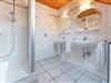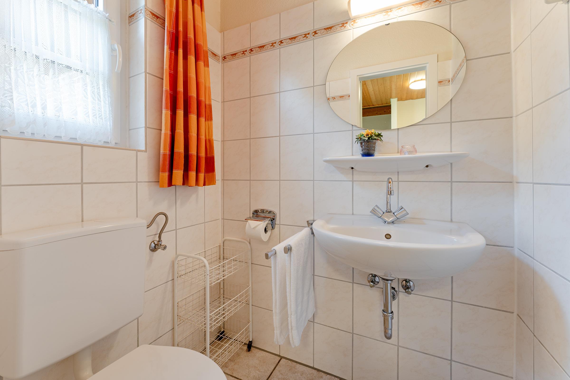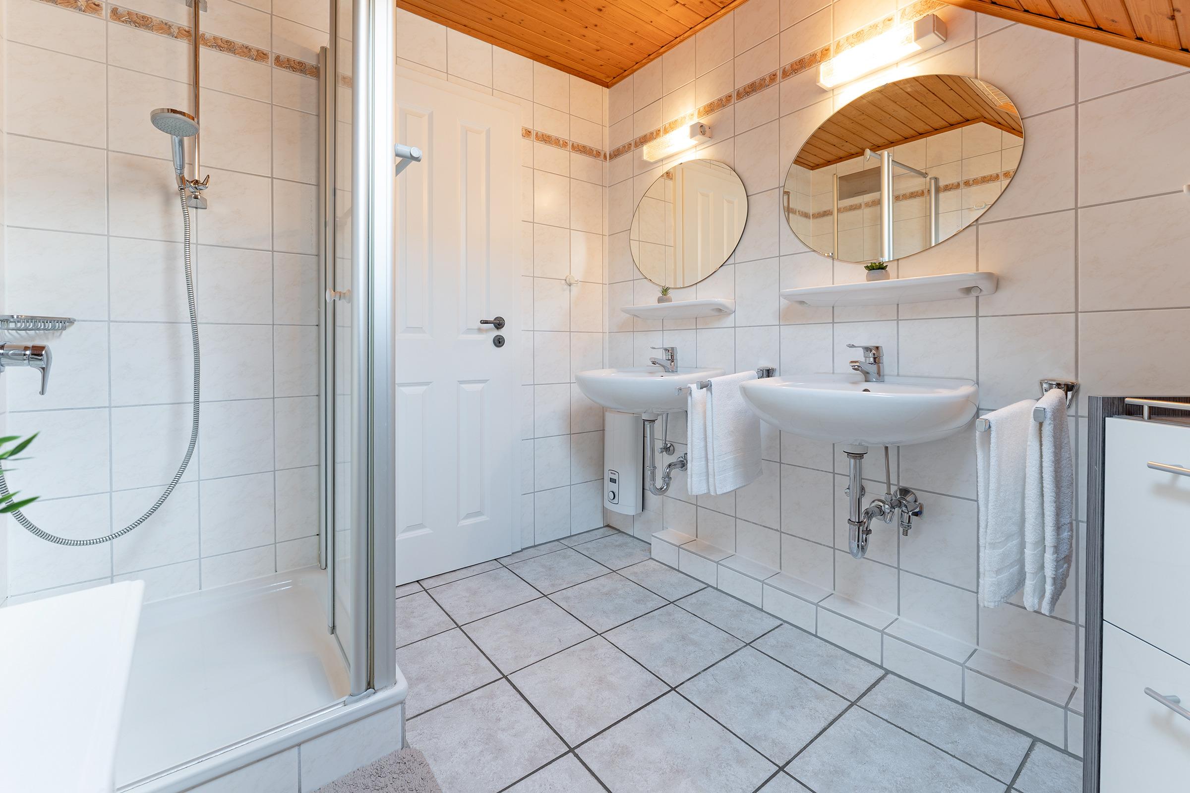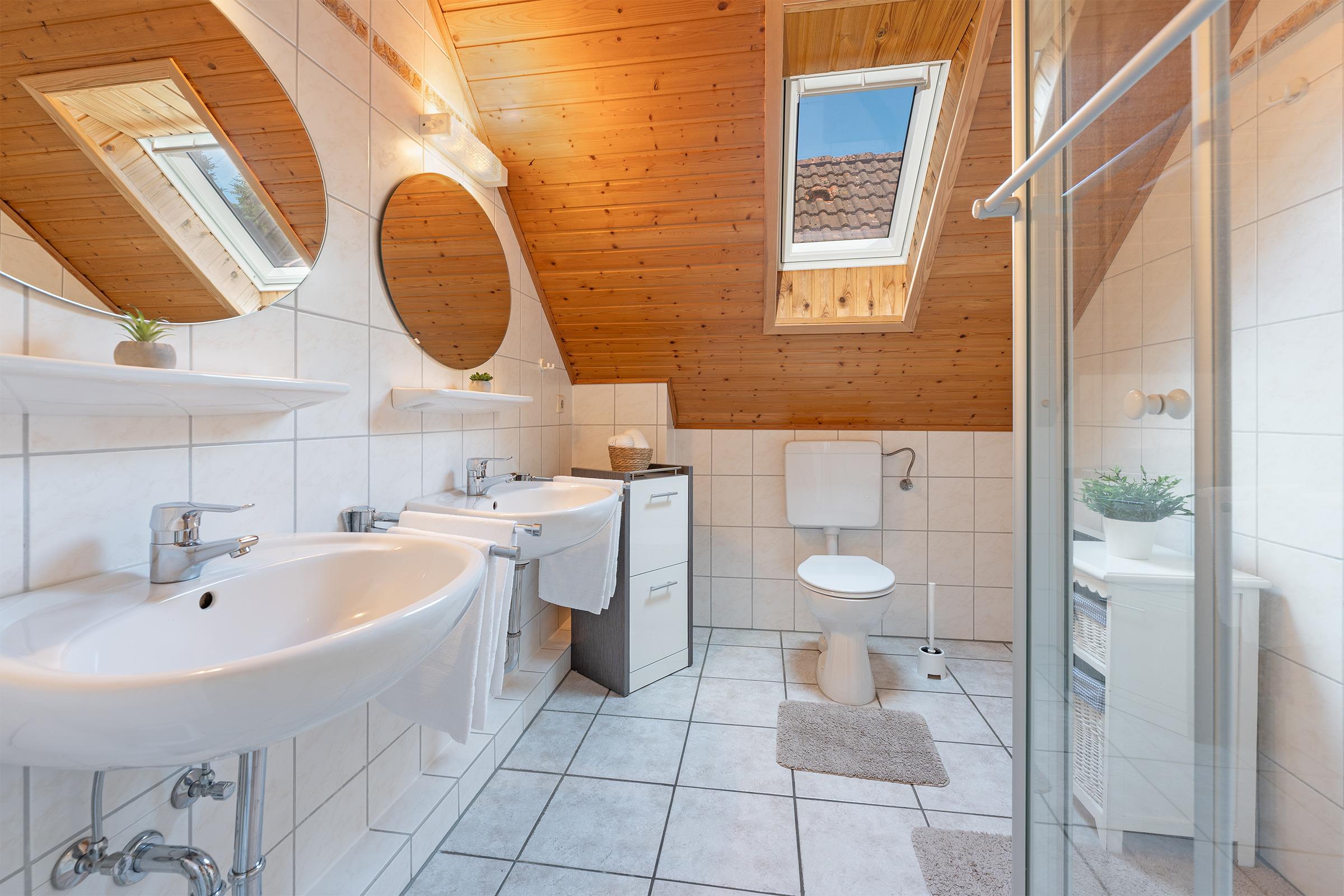 Das helle Tageslichtbad verfügt über eine Dusche, WC und zwei praktische Waschbecken - damit beim Zähneputzen kein Stau entsteht. Ein Gäste-WC ergänzt den Komfort. Für Familien stehen sowohl ein Kinderreisebett als auch ein Hochstuhl bereit.