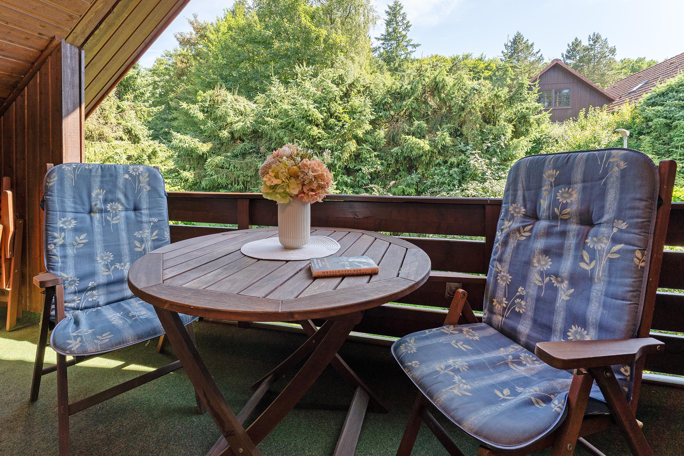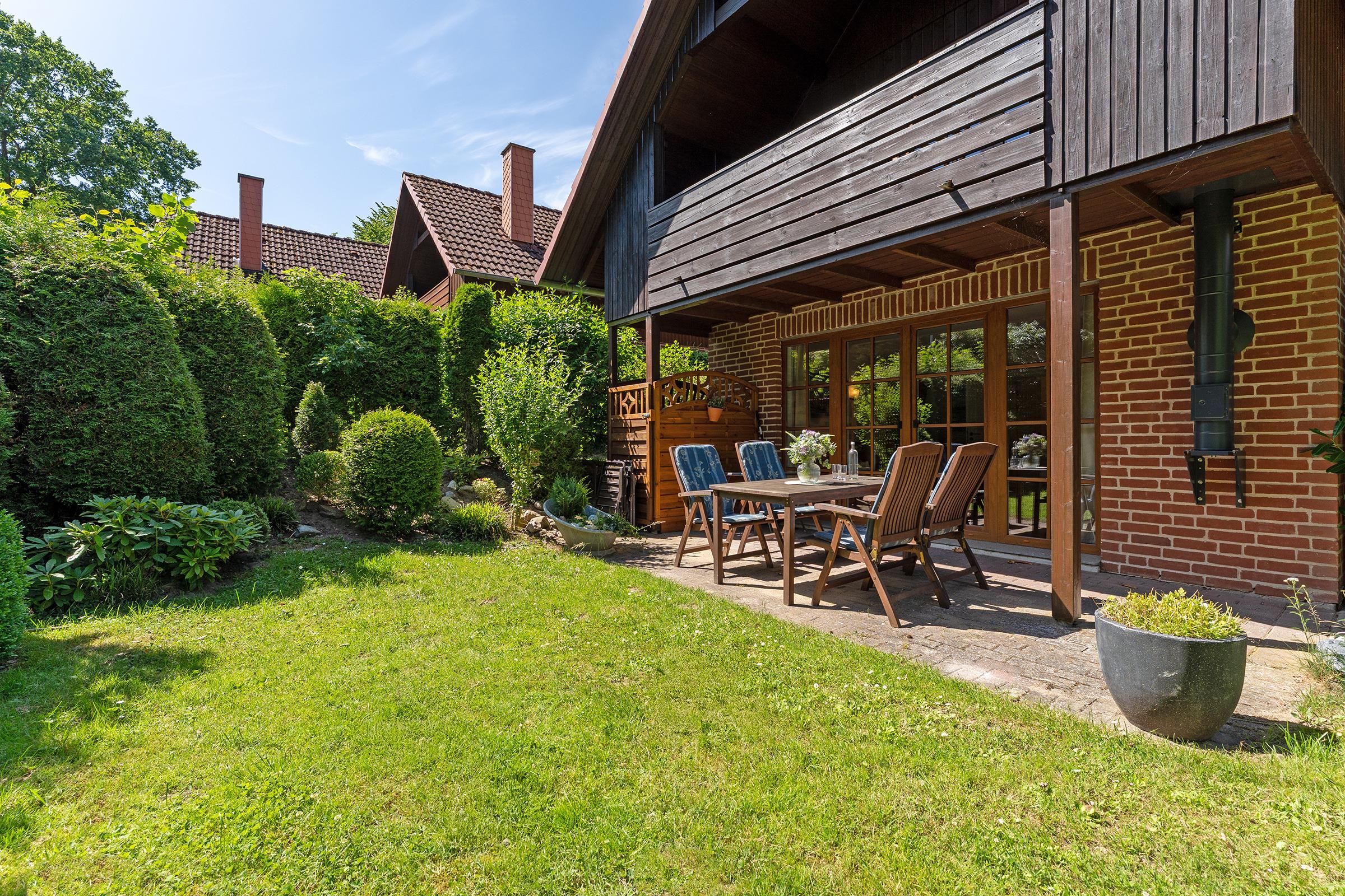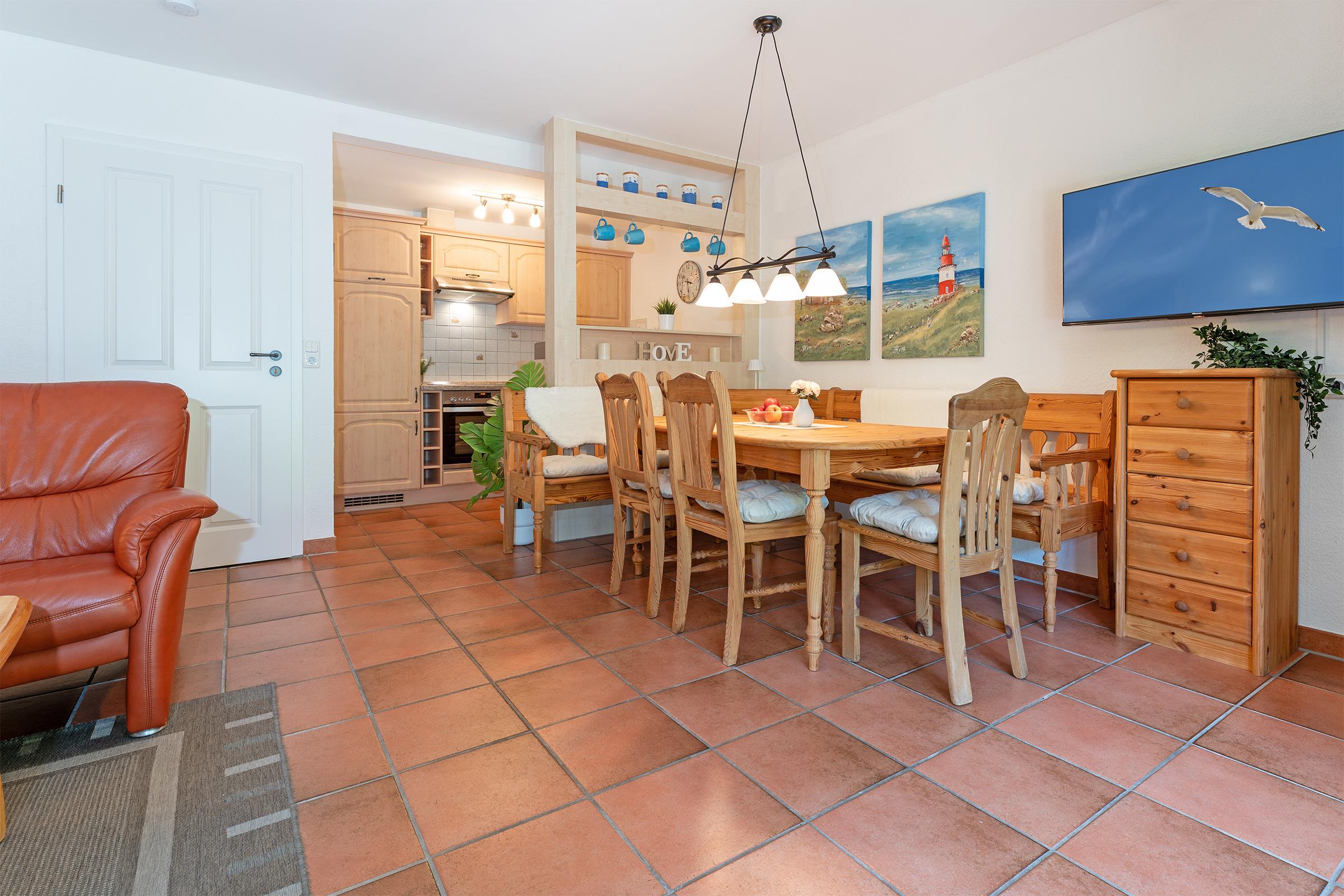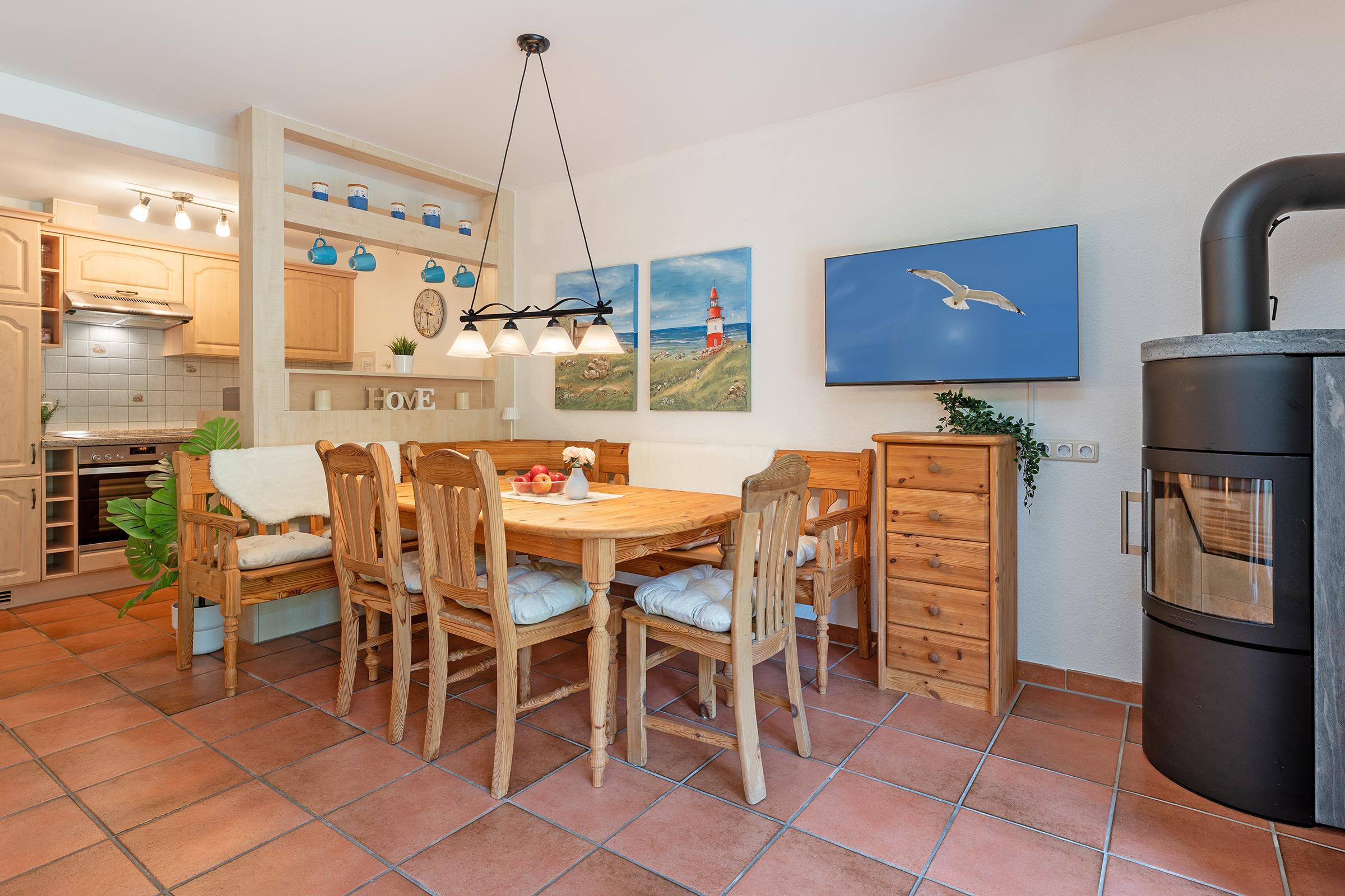 Das charmante Reihenhaus überzeugt mit einem gemütlichen Wohnbereich, der sich über das Erdgeschoss und das erste Obergeschoss verteilt. Liebevolle Details wie nostalgische Sprossenfenster, sichtbare Holzbalken und eine warme Holzdecke schaffen eine behagliche Atmosphäre. Ein Fernseher bietet Unterhaltung, der Kaminofen steht aus Sicherheitsgründen nicht zur Nutzung bereit. Vom Wohnbereich gelangen Sie direkt auf die möblierte Terrasse – perfekt für entspannte Stunden im Freien mit dem Blick ins Grüne. Der überdachte Balkon im Obergeschoss lädt ebenfalls zum Verweilen ein.