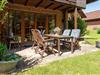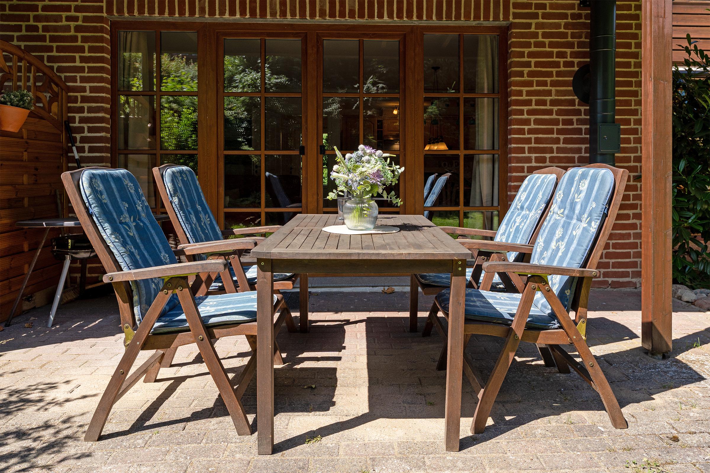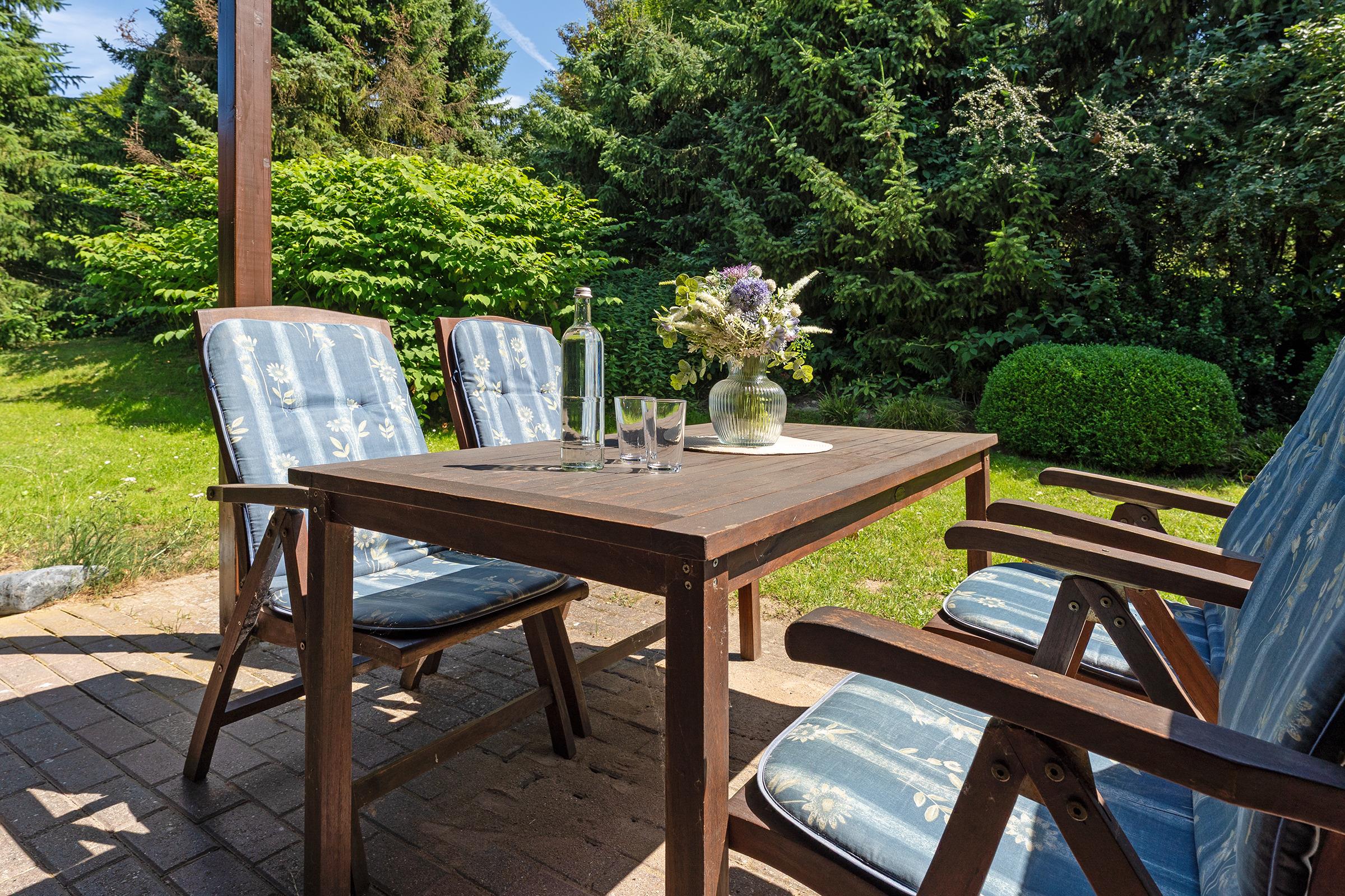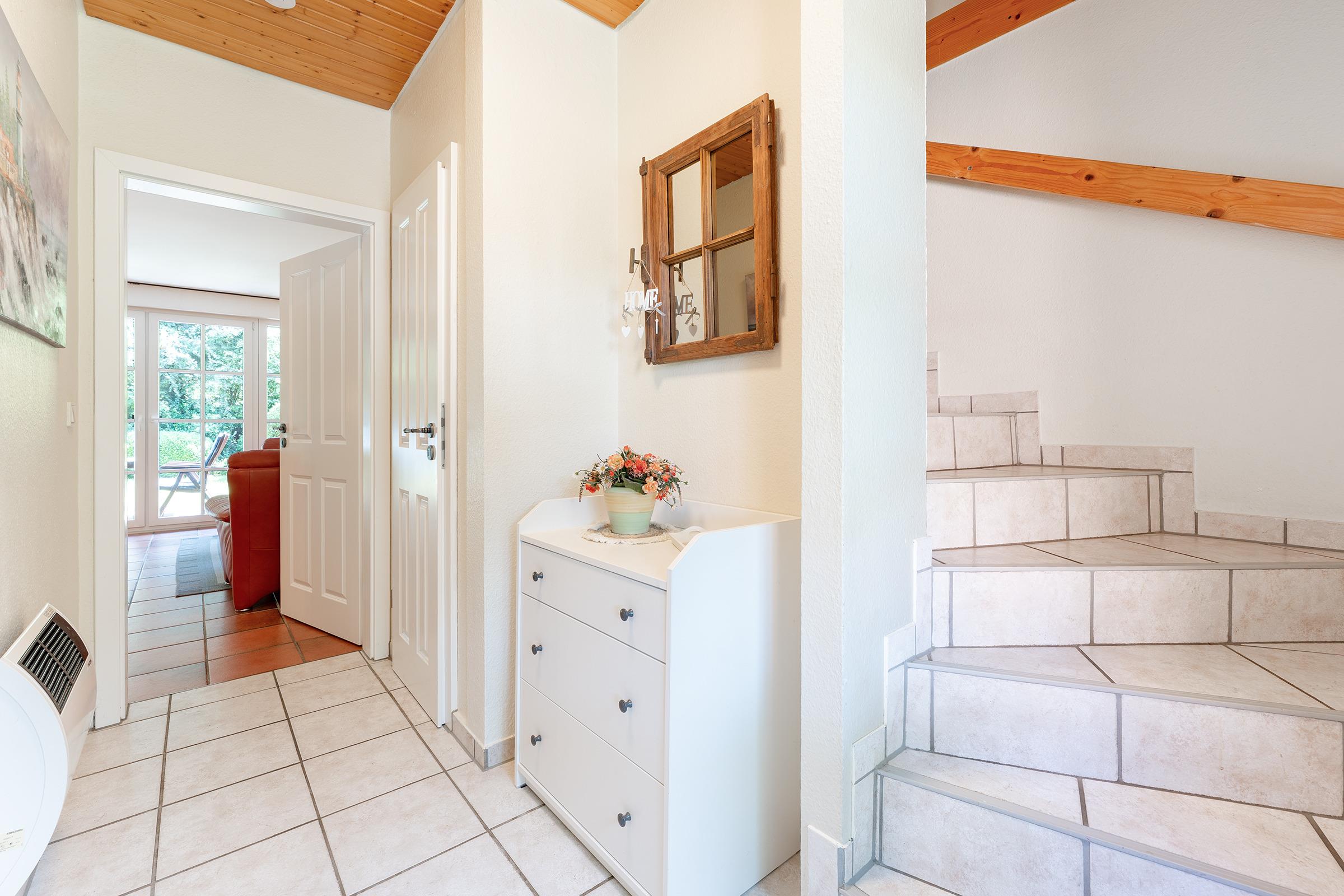 Das charmante Reihenhaus überzeugt mit einem gemütlichen Wohnbereich, der sich über das Erdgeschoss und das erste Obergeschoss verteilt. Liebevolle Details wie nostalgische Sprossenfenster, sichtbare Holzbalken und eine warme Holzdecke schaffen eine behagliche Atmosphäre. Ein Fernseher bietet Unterhaltung, der Kaminofen steht aus Sicherheitsgründen nicht zur Nutzung bereit. Vom Wohnbereich gelangen Sie direkt auf die möblierte Terrasse – perfekt für entspannte Stunden im Freien mit dem Blick ins Grüne. Der überdachte Balkon im Obergeschoss lädt ebenfalls zum Verweilen ein.