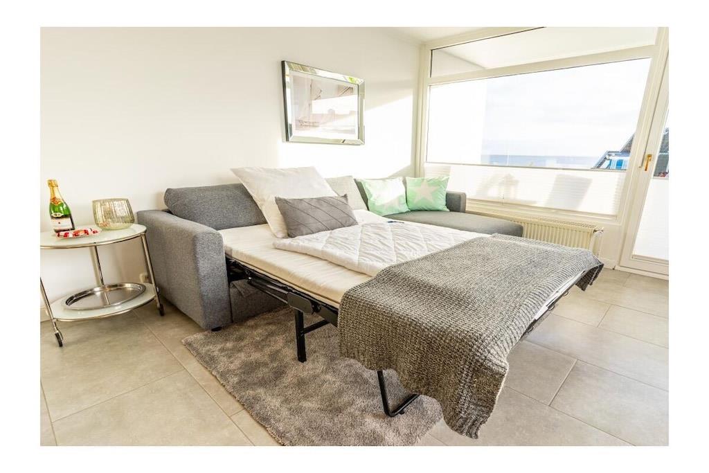 STRANDLAGE; 100% Seeblick / 2 Zimmer-Komfort-App. in bester Strandlage ! Genießen Sie den unvergesslichen Ostseeblick von der schönen Dachterrasse und dem Seeblickbalkon. Einfach ankommen und sich wohlfühlen. Ca. 66qm , W-LAN und Klimaanlage vorhanden. Das Luxus Appartement befindet sich im 4. Geschoss /Lift vorhanden. Wohnraum mit integrierter Einbauküche (Ceranfeld, Geschirrspüler, Mikrowelle, Kühlschrank, Kaffeevollautomat ) und angeschlossenem Essplatz, Fliesenboden, Sofa mit Schlaffunktion (Schlaffunktion für 2 Personen), Couchtisch, großer Flachbild TV mit HD Sender, Sky und Alexa (Radio hören, etc.). Zusätzlich gibt es einen separaten Schlafraum mit Fliesenboden, Kleiderschrank, Boxspring Bett, Alexa (hört auf den Namen ; Echo), Flachbildfernseher , Tresor, Fenster vorhanden. Neues modernes Duschbad mit Duschabtrennung und Fenster, separates WC mit Fenster. Die Wohnung verfügt über W-Lan-Anschluss (bei Störung kein Ersatzanspruch). Auf der 40 qm großen Dachterrasse befindet sich eine Sauna zum entspannen nach einem langen Standspaziergang. (Sauna gegen Gebühr 1 EUR/20 Minuten) Hinter dem Haus gibt es die Möglichkeit Fahrräder abzustellen. Im Außenbereich Für E-Bikes gibt es die Möglichkeit, die Fahrräder auf der Dachterrasse zu laden, um auf die Dachterrasse der Ferienwohnung zu gelangen , müssen sie beachten, das sie das E-Bike zunächst einige Stufen zum Fahrstuhl tragen müssen.