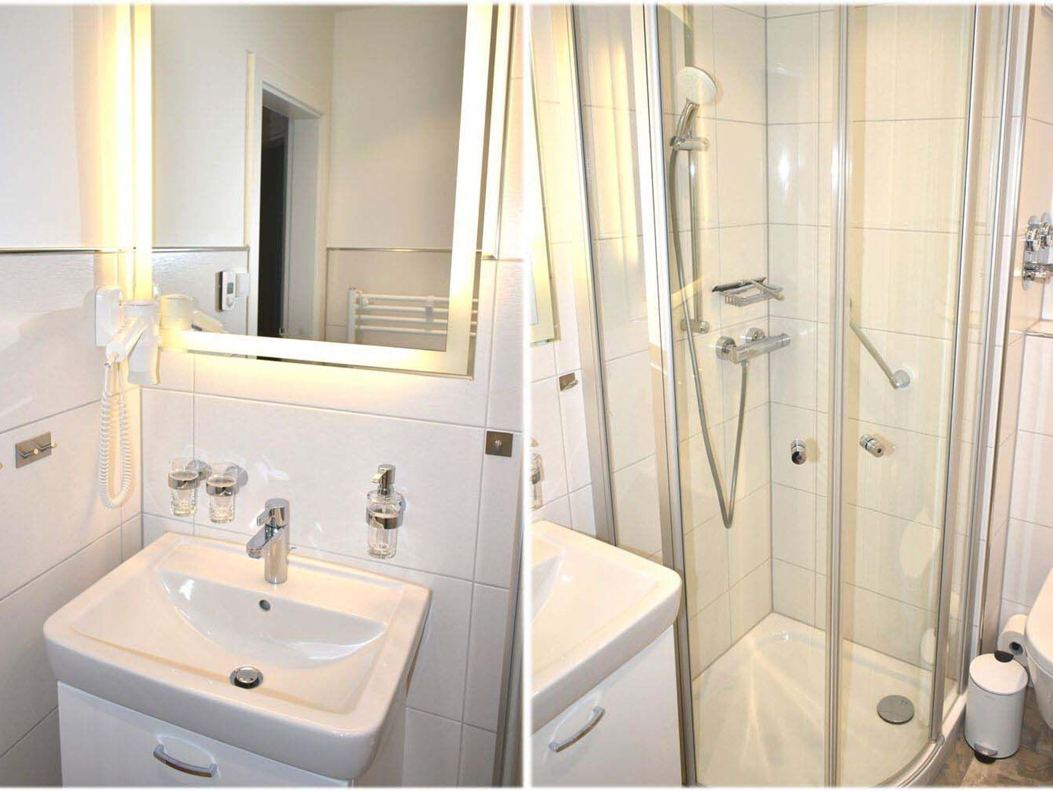 Bad 1: Dusche, Duschkabine, Fön, Fussbodenheizung - rechter Schalter im Bad, Handtuchheizung, Spiegel, Waschtisch, WC