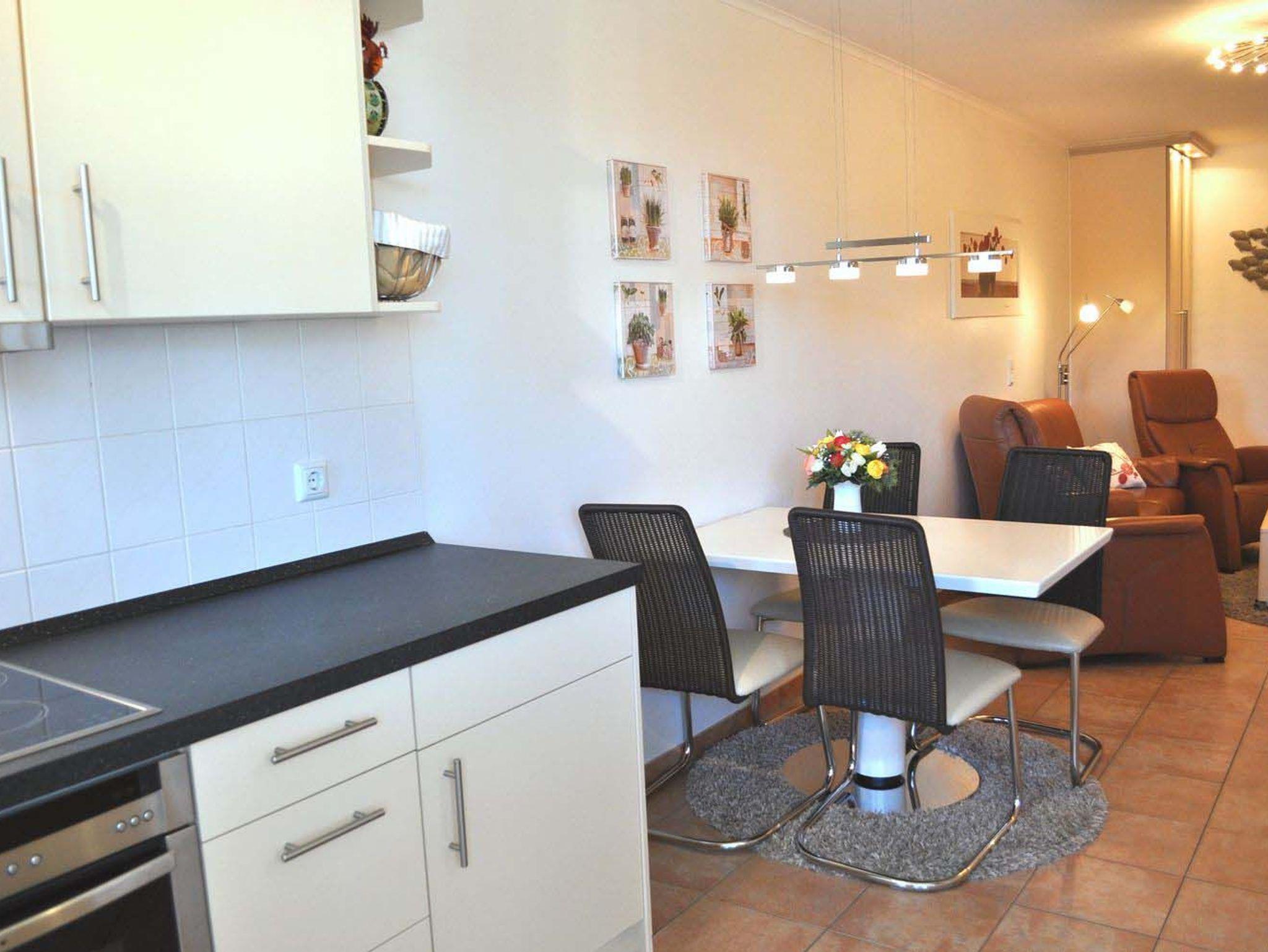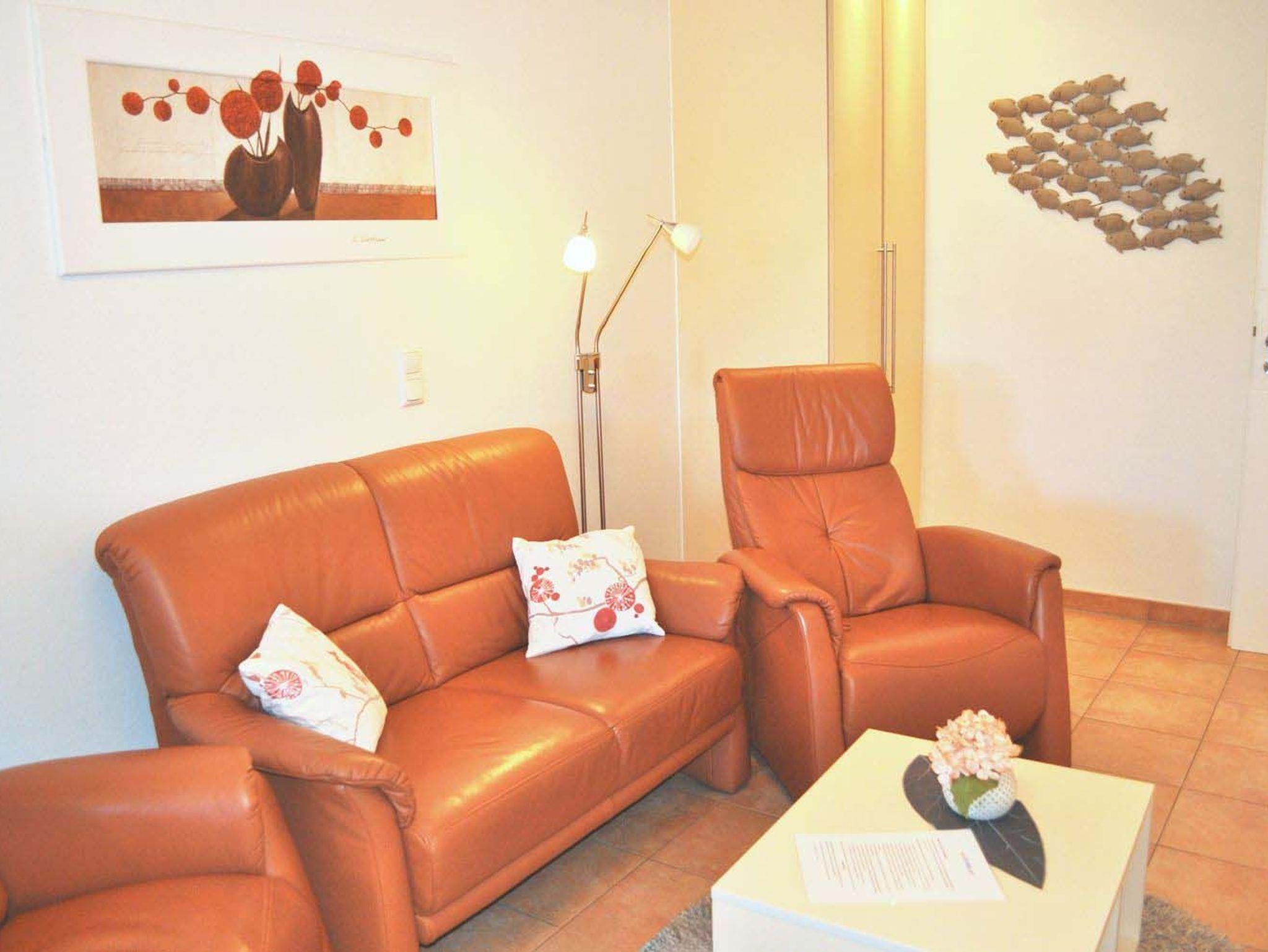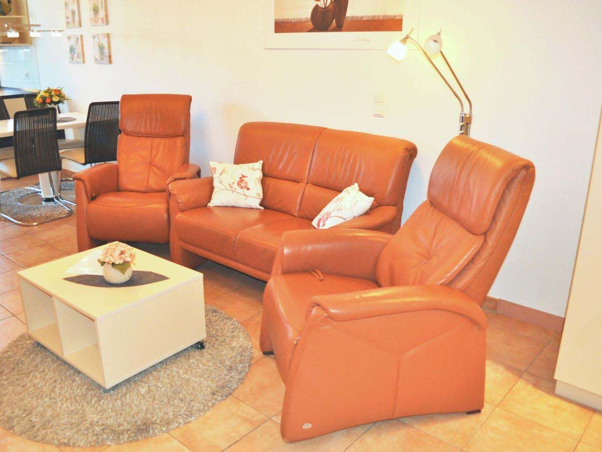Wohnzimmer: 2 Relaxsessel, 4 Plattenherd mit Ceranfeld und Backofen, 4 Stühle, Anrichte, aus dem Küchenfenster Blick aus Meer, Bügelbrett, Bügeleisen, Couch, Couchtisch, Dunstabzugshaube, Einbaukleiderschrank, Einbauküche, Einbauregal, elektrische Zitronenpresse, Esstisch, Flachbildschirm, Fliegenschutzgitter nur an den Fenstern, Handmixer, Kabel-TV, Kaffeemaschine, Kaffeepadmaschine, Kühlschrank, Senseo Kaffeemaschine, Spülmaschine, Staubsauger, Stereoanlage mit CD-Player, Toaster, Wasserkocher