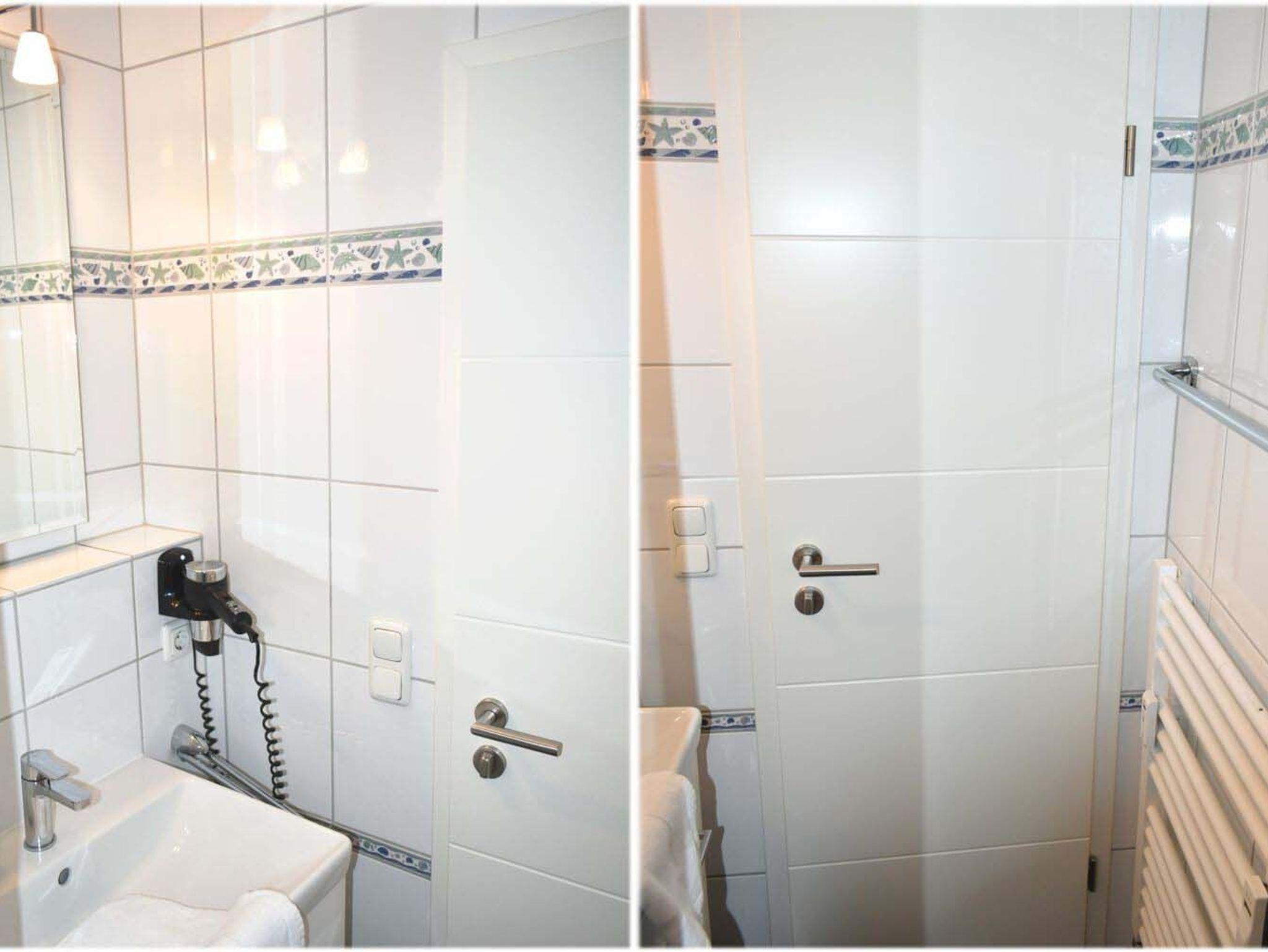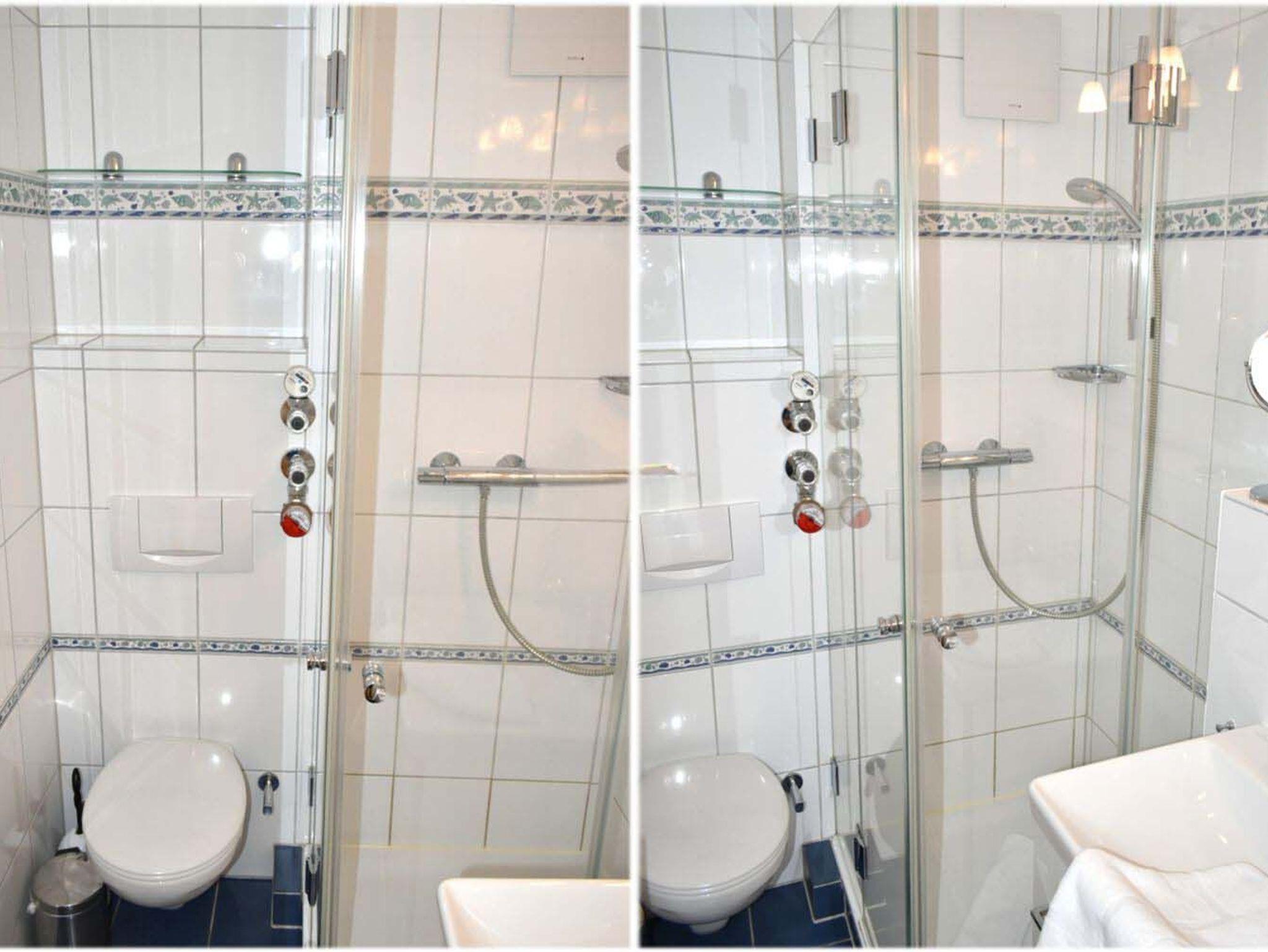 Bad 1: Dusche, Duschkabine, Fön, Kosmetikspiegel, Schrank, Spiegel, Waschbecken, WC