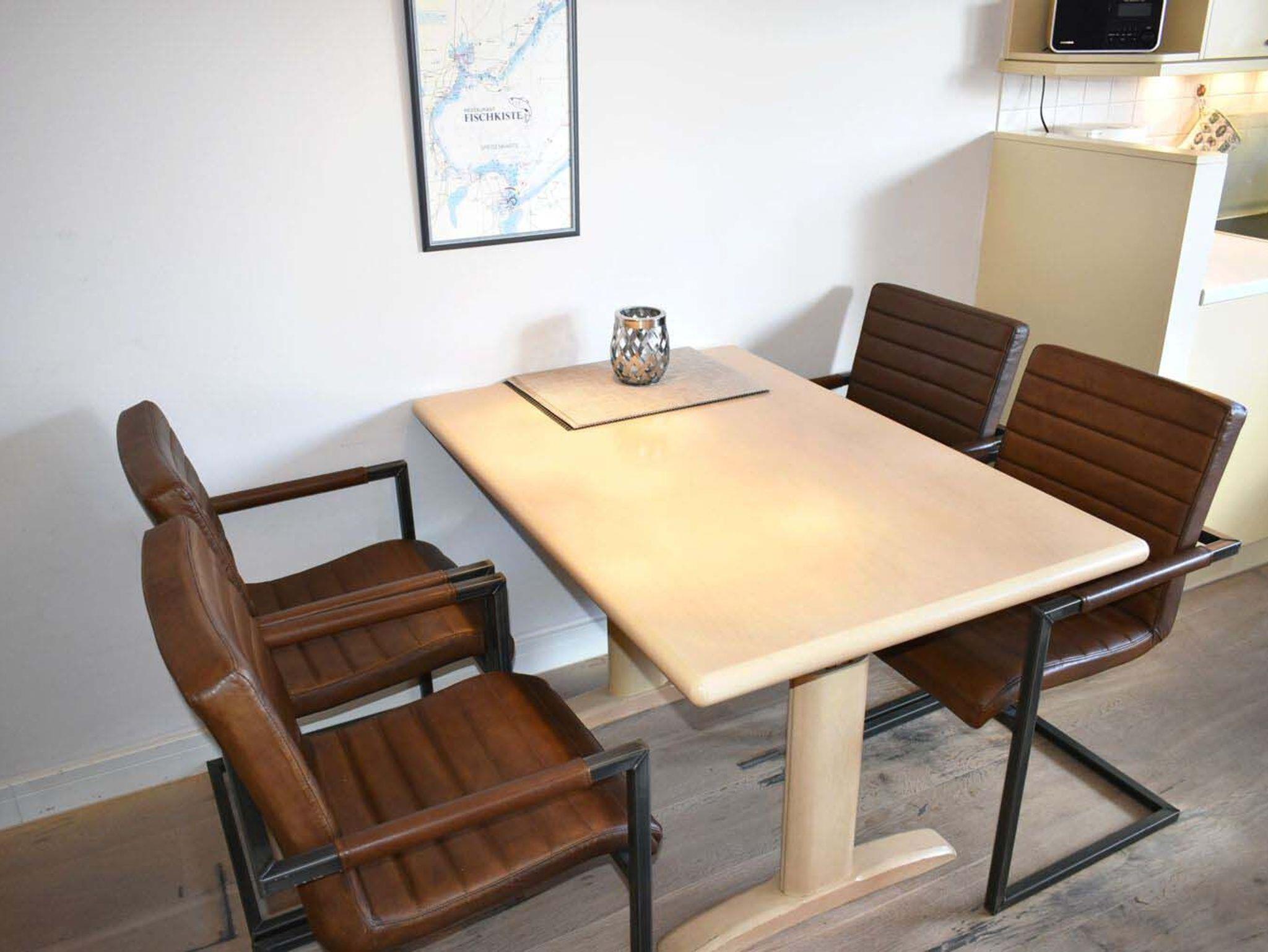 Balkon: 4 Fleecedecken, 4 Stühle mit Auflagen, Bodenwindlicht, Meerblick zwischen den Häusern, Nord- Ostlage, Tisch, Tischwindlicht, überdacht