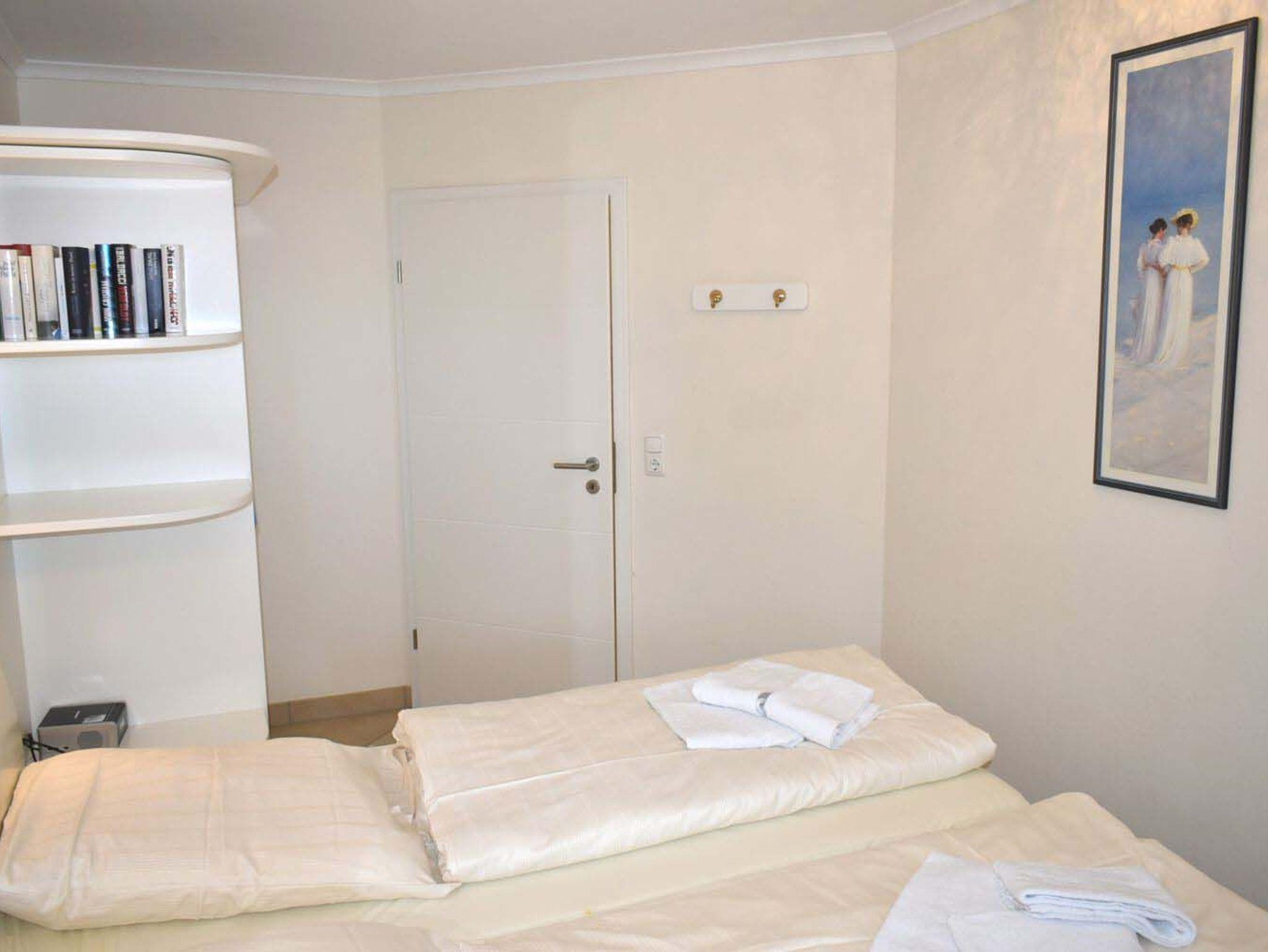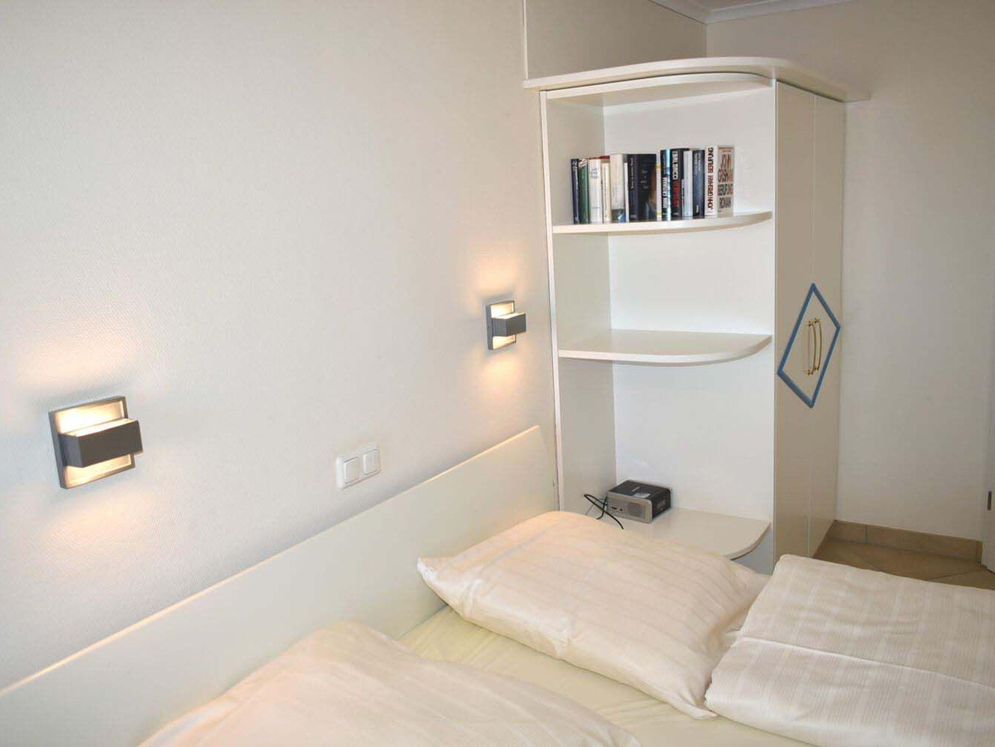 Schlafzimmer 1: Doppelbett 2,00 x 1,80 m Lattenrost Kopf- und Fussteil verstellbar, Flachbildschirm, Garderobe, Kabel-TV, Kleiderschrank, kleiner Meerblick zwischen den Häusern aus dem Bett, Kofferablage, Korbsessel, Nachttisch, Radiowecker, Regal, Spiegel