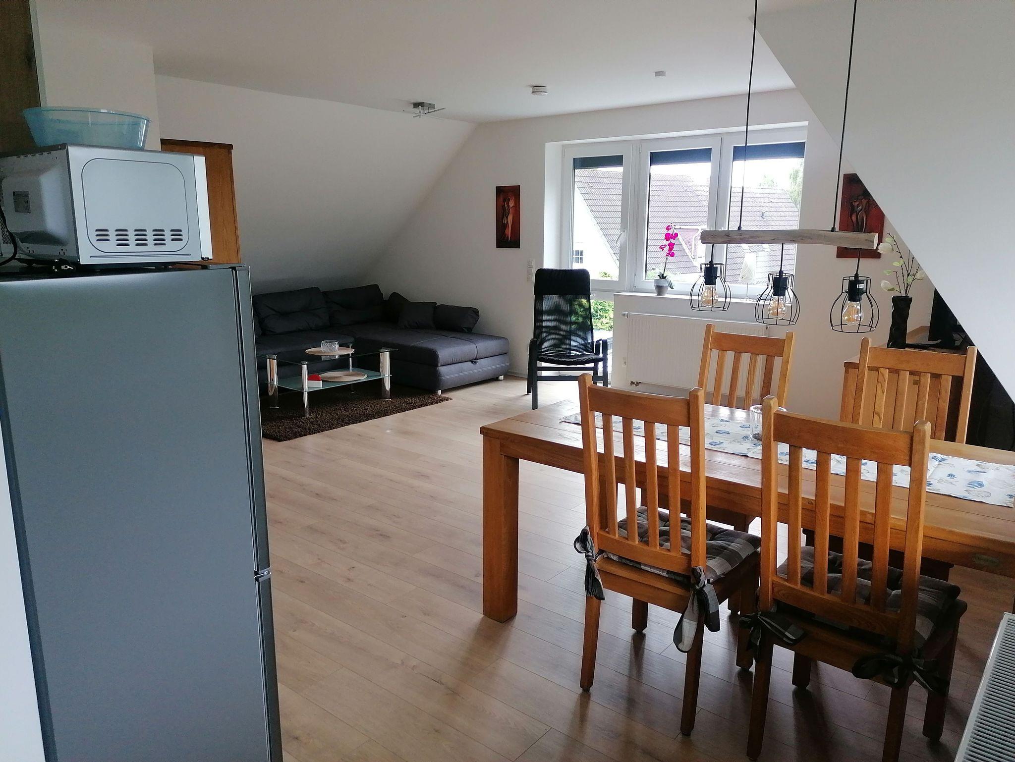 Die neu gebaute Ferienwohnung ist ca. 58m² groß, hat einen getrennten Schlafraum mit einem Doppelbett und im Wohnbereich befindet sich eine Schlafcouch. Die Küche ist offen und voll ausgestattet mit Mikrowelle, Geschirrspülmaschine, Backofen, Herd uvm. Das Badezimmer ist mit WC/Dusche und einem Haartrockner ausgestattet. Die Wohnung befindet sich im 1. OG mit einem separaten Eingang. WLAN ist kostenlos mit Zugang verfügbar.
