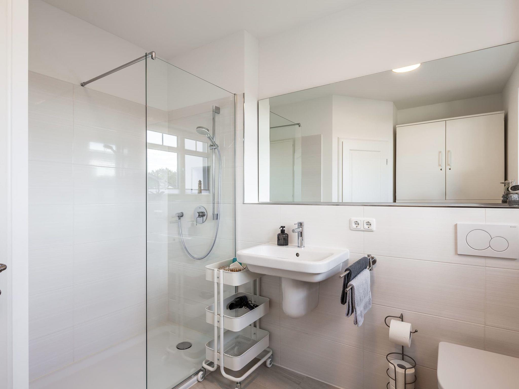 Im geräumigen Duschbad finden Sie nicht nur eine erfrischende Dusche, sondern auch einen großzügigen Schrank für Ihre persönlichen Gegenstände.