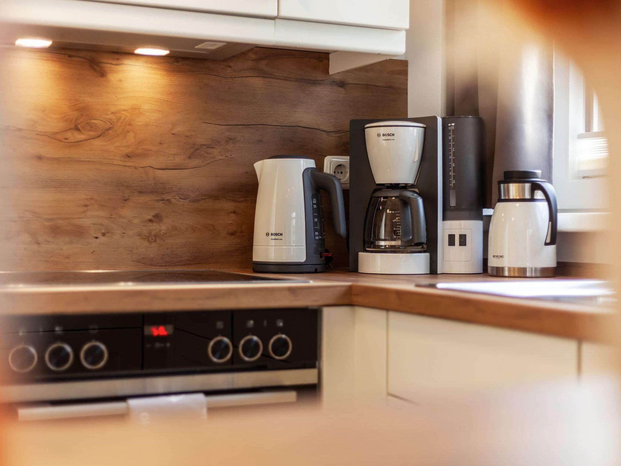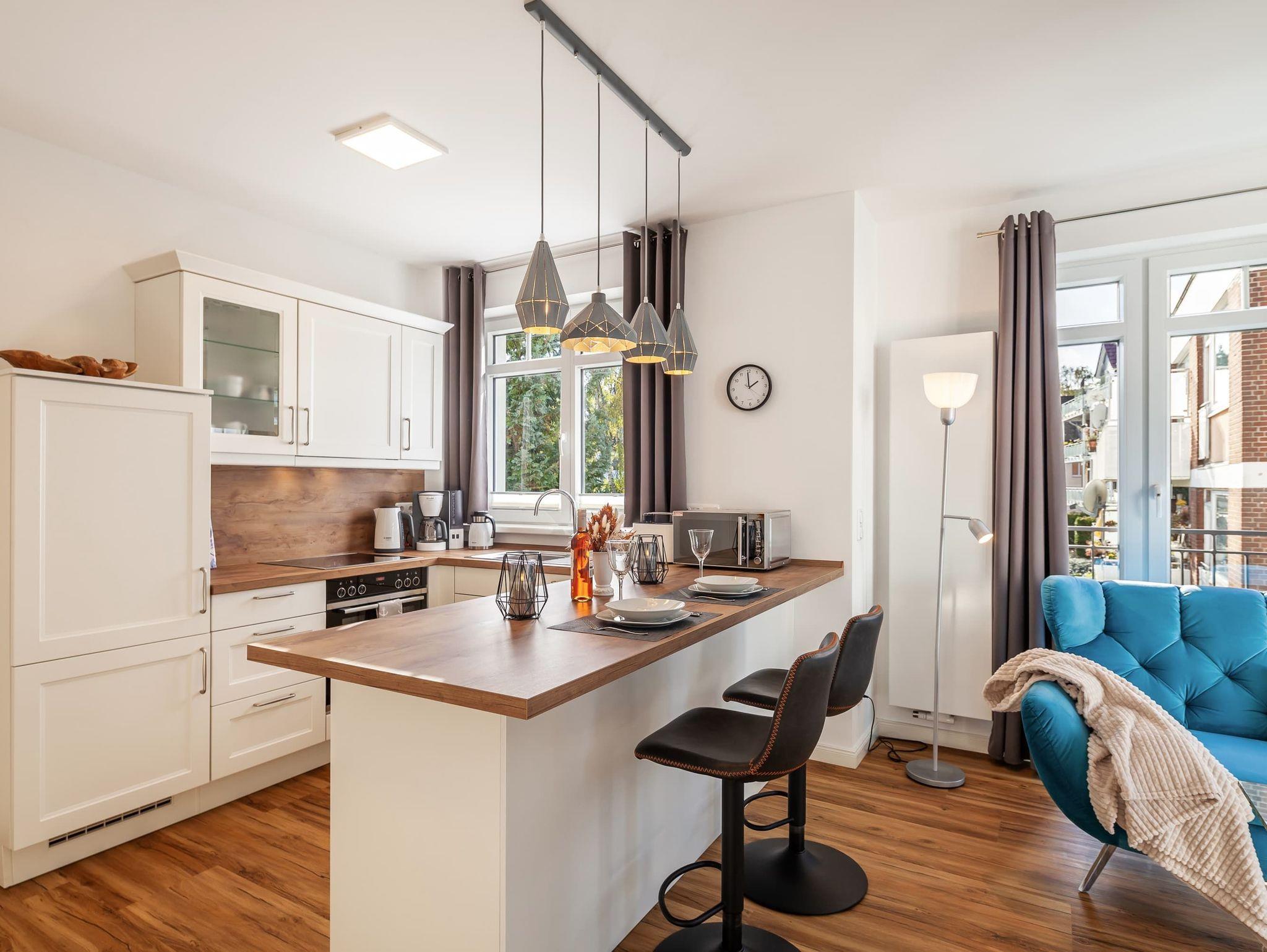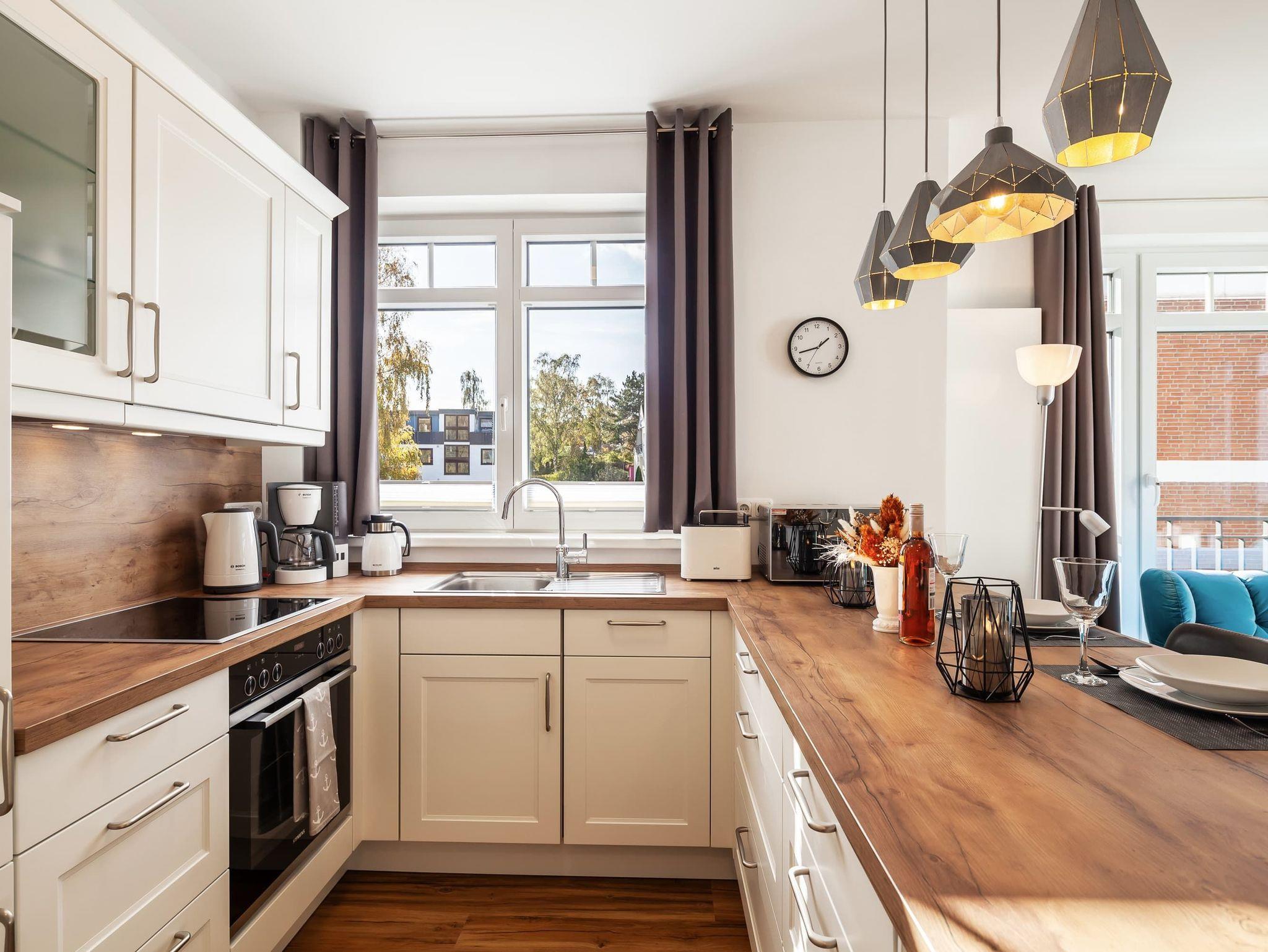 Jede Wohnung verfügt über eine vollständige Küchenausstattung, die keine Wünsche offen lässt. Die offene Gestaltung der Küche schafft eine einladende Atmosphäre und bietet alles, was Sie für einen angenehmen Aufenthalt benötigen, einschließlich Herd mit Backofen und großem Kühl- und Gefrierschrank, sowie Geschirrspülmaschine.
