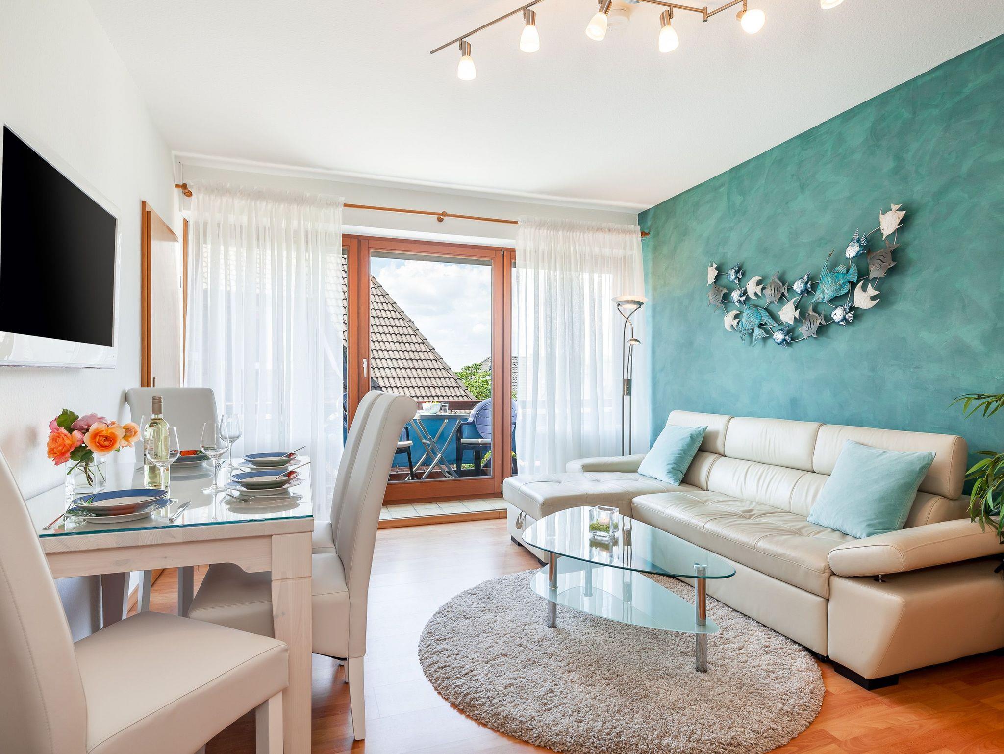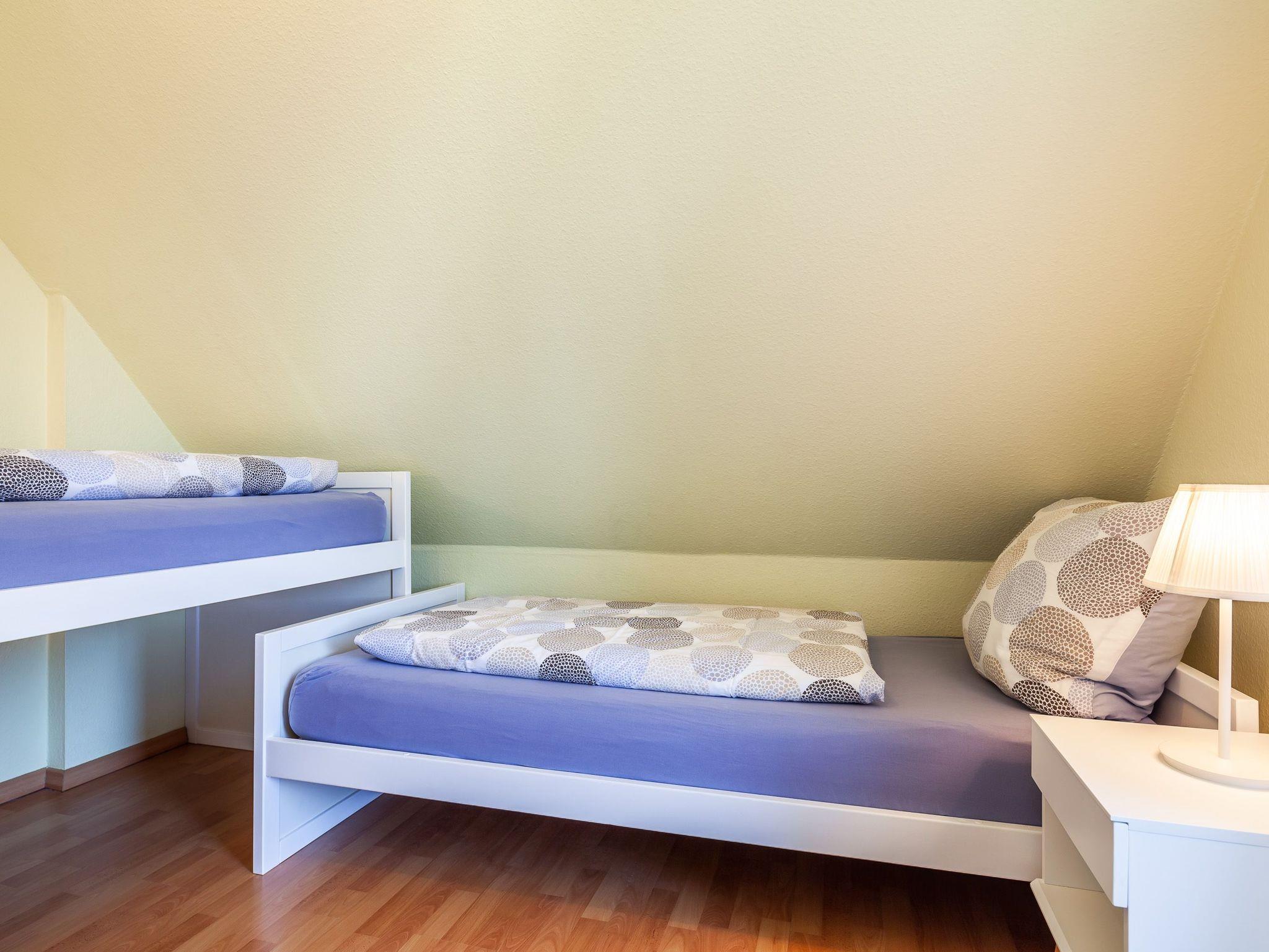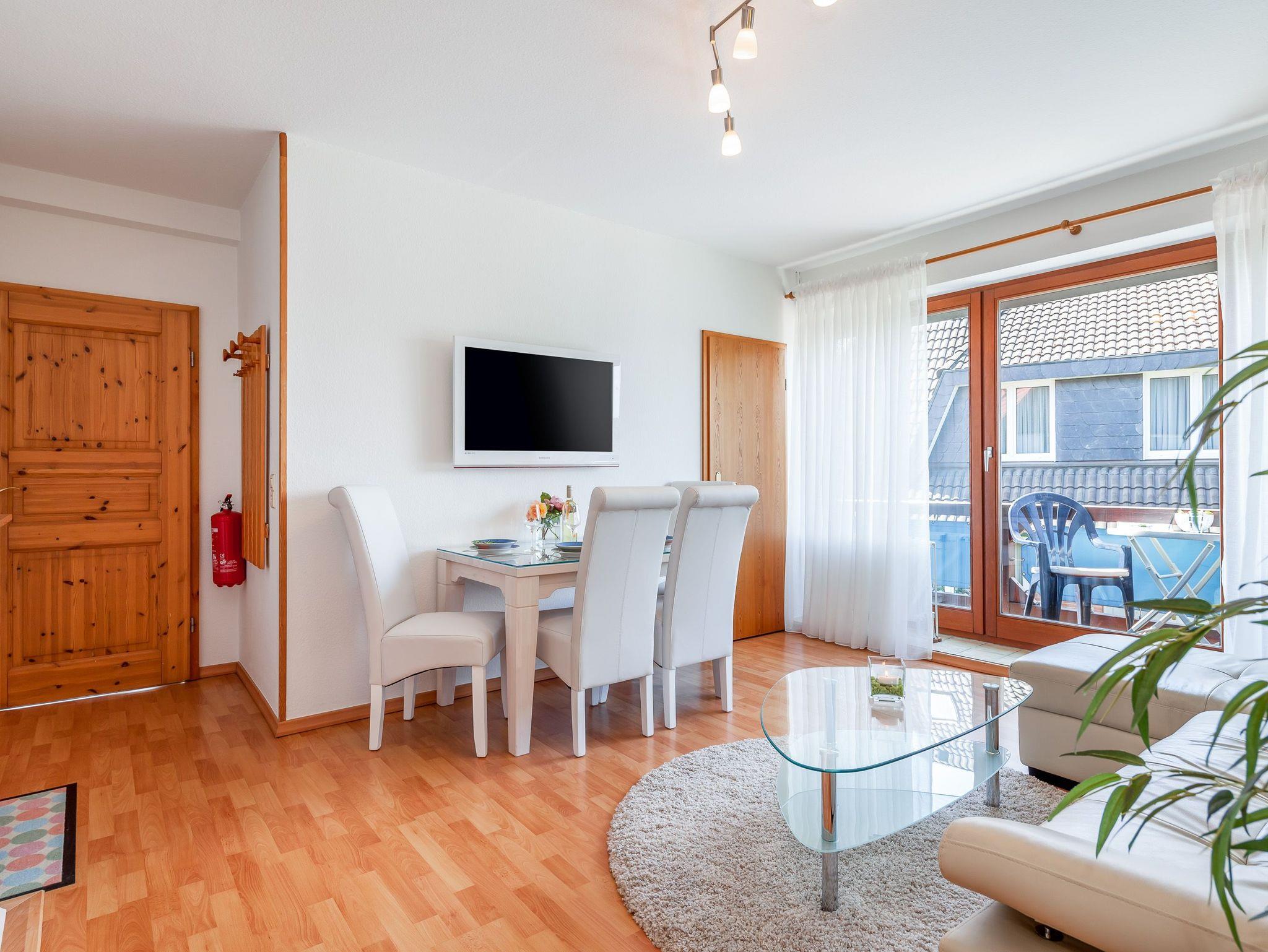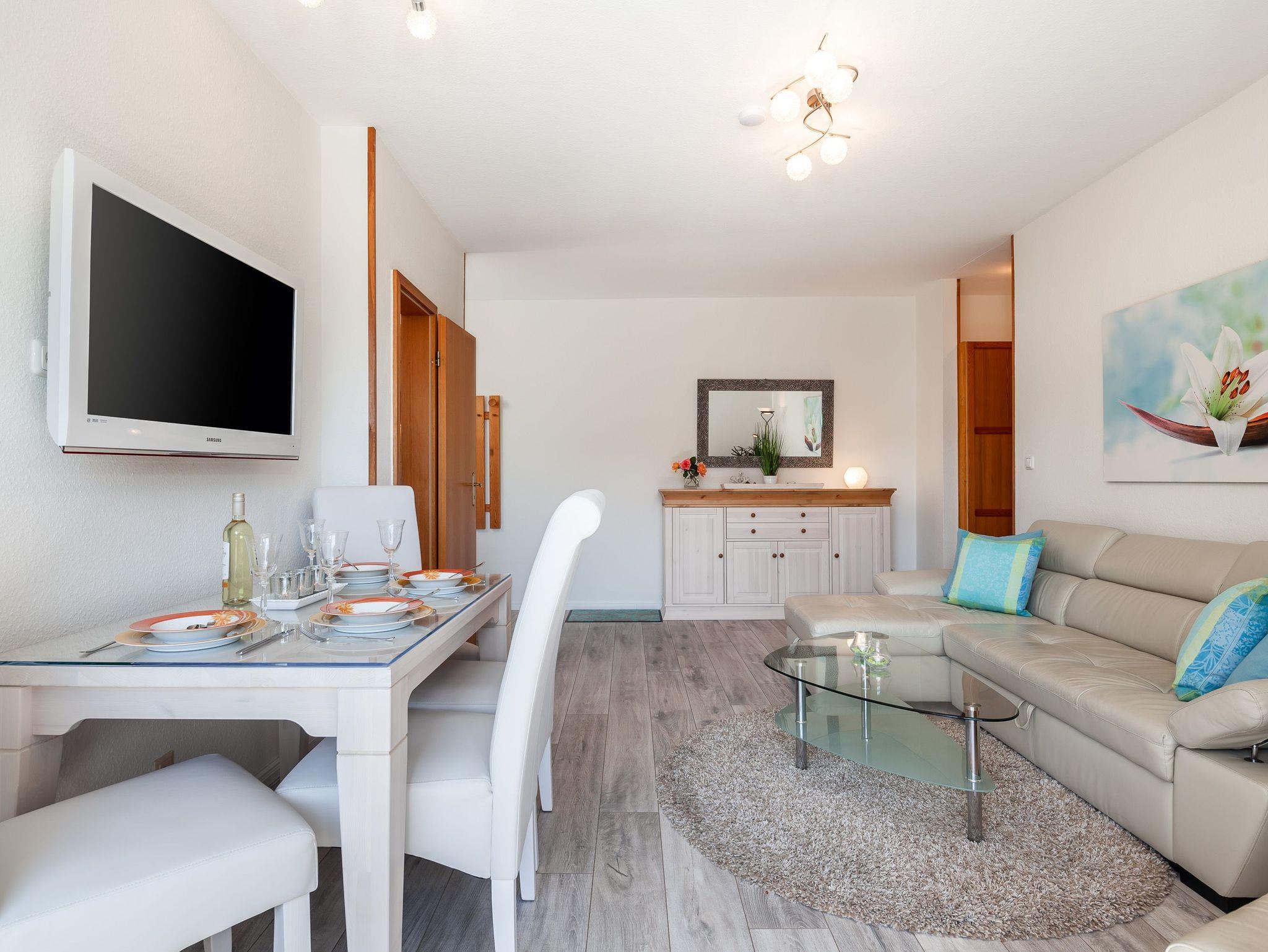 Die 50qm große Wohnung hat 3 Zimmer: ein Wohnzimmer mit Essplatz und integrierter komplett eingerichteter Einbauküche, ein Schlafzimmer mit Doppelbett und ein Kinderzimmer mit 2 Einzelbetten, sowie ein komfortables Duschbad. Die Einzelbetten des Kinderzimmers sind grosszügig bemessen (90x200 cm), so dass in der Wohnung 4 reguläre Schlafplätze vorhanden sind. Auf Wunsch werden auch Kleinkinderbetten und Hochstuhl gestellt. Der Balkon mit Sitzgelegenheiten lädt zum Verweilen an frischer Luft ein. Die Einrichtung der Wohnung ist neu und komplett ausgestattet.