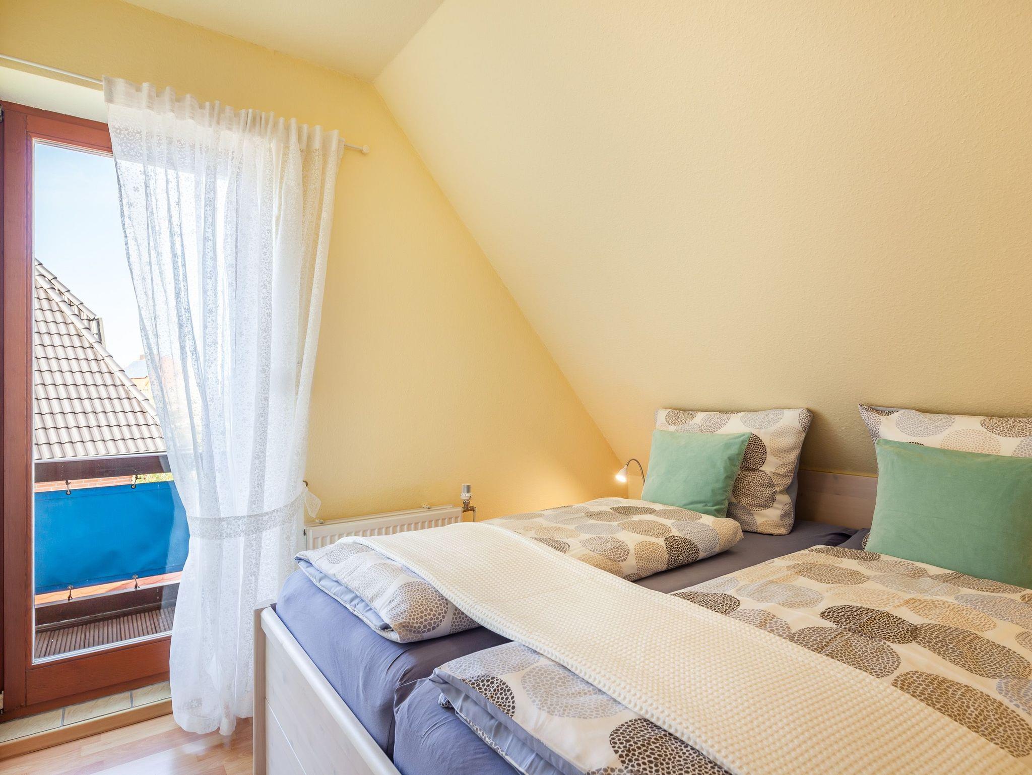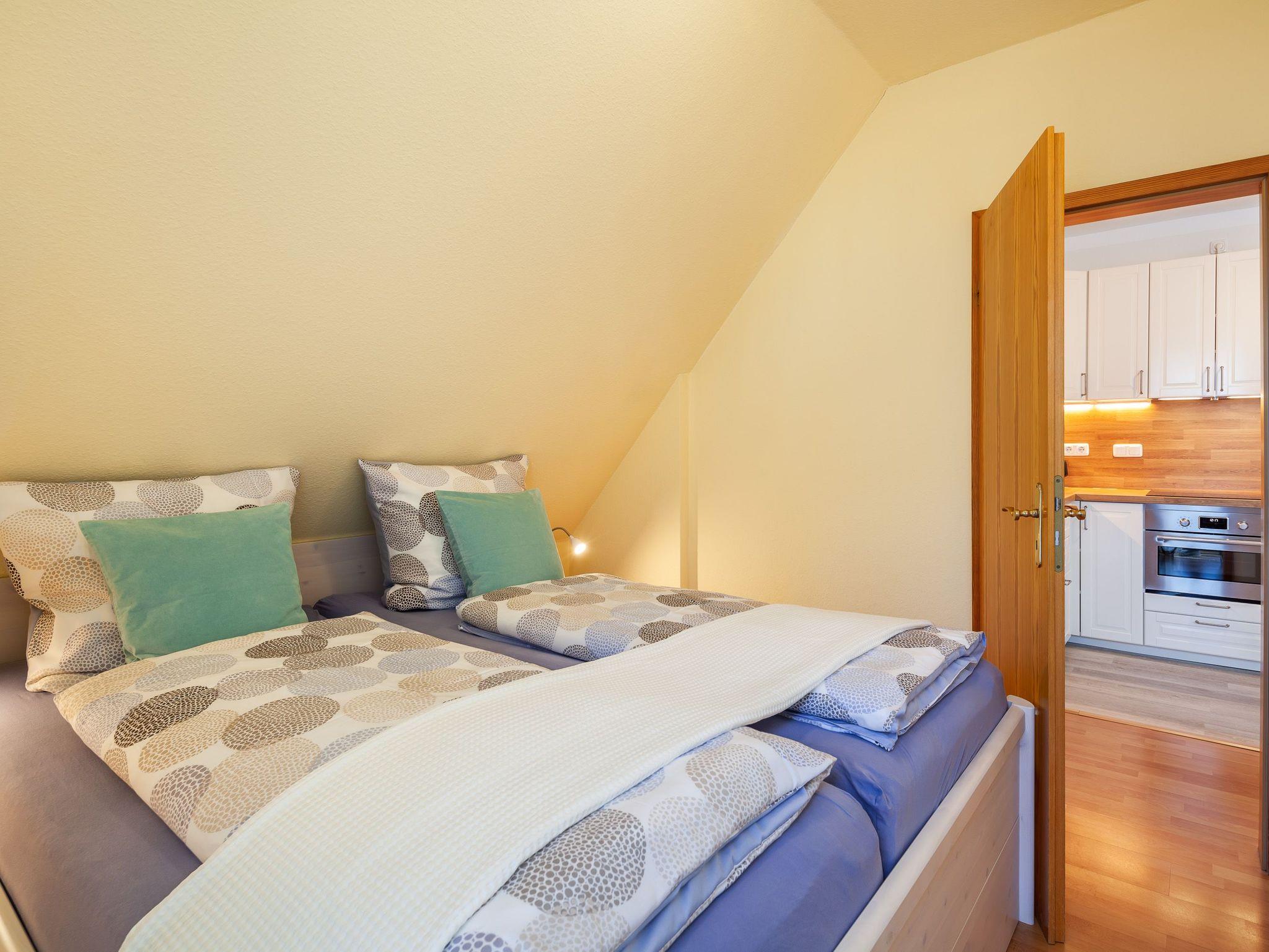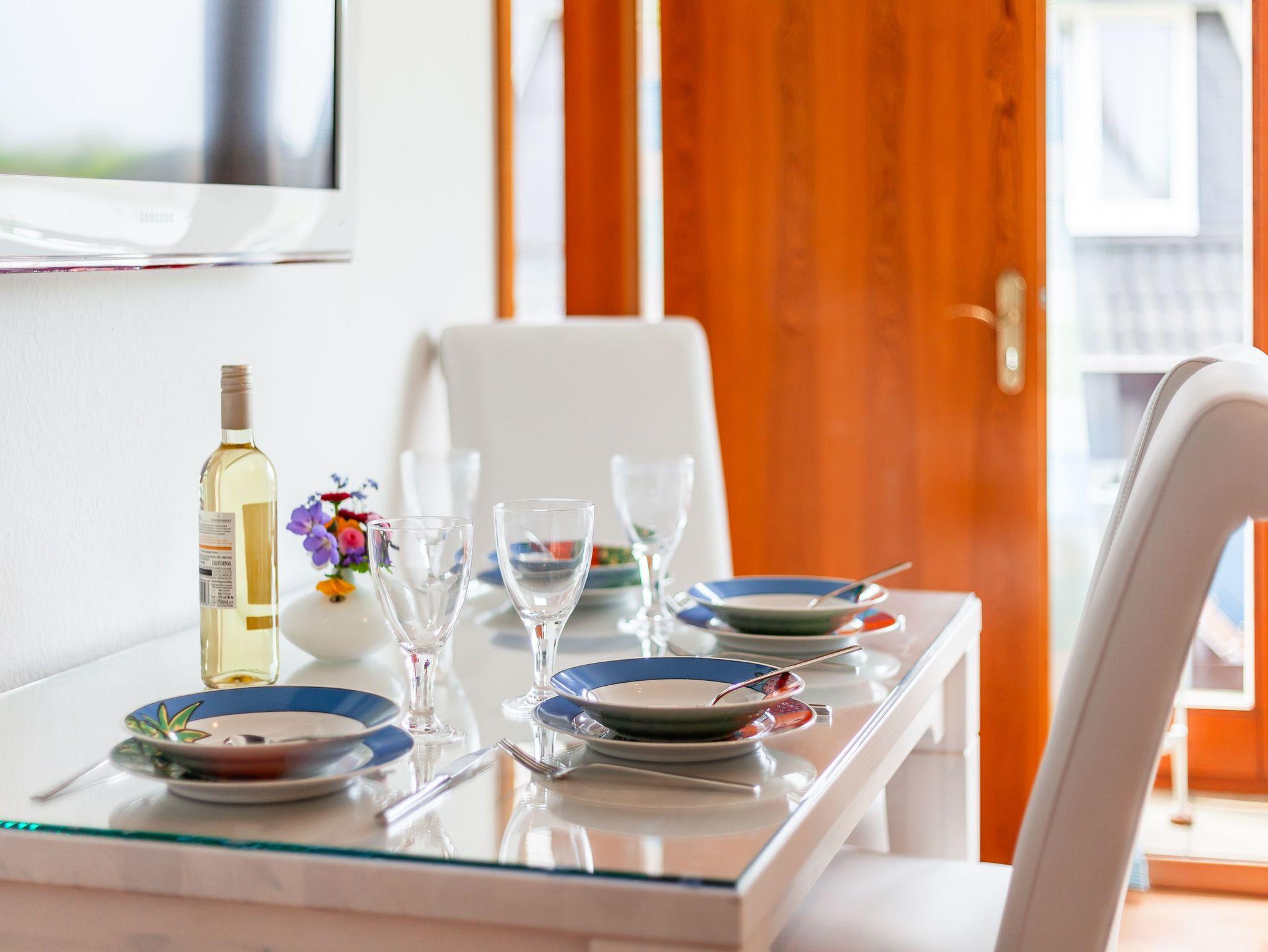 Die 50qm große Wohnung hat 3 Zimmer: ein Wohnzimmer mit Essplatz und integrierter komplett eingerichteter Einbauküche, ein Schlafzimmer mit Doppelbett und ein Kinderzimmer mit 2 Einzelbetten, sowie ein komfortables Duschbad. Die Einzelbetten des Kinderzimmers sind grosszügig bemessen (90x200 cm), so dass in der Wohnung 4 reguläre Schlafplätze vorhanden sind. Auf Wunsch werden auch Kleinkinderbetten und Hochstuhl gestellt. Der Balkon mit Sitzgelegenheiten lädt zum Verweilen an frischer Luft ein. Die Einrichtung der Wohnung ist neu und komplett ausgestattet.