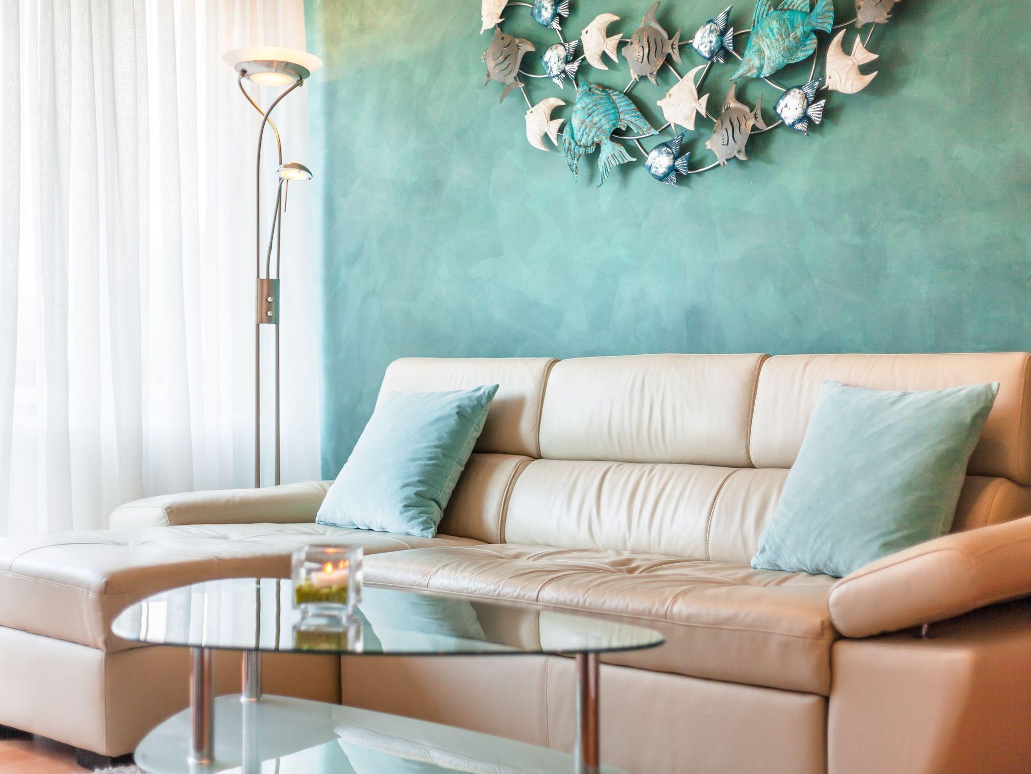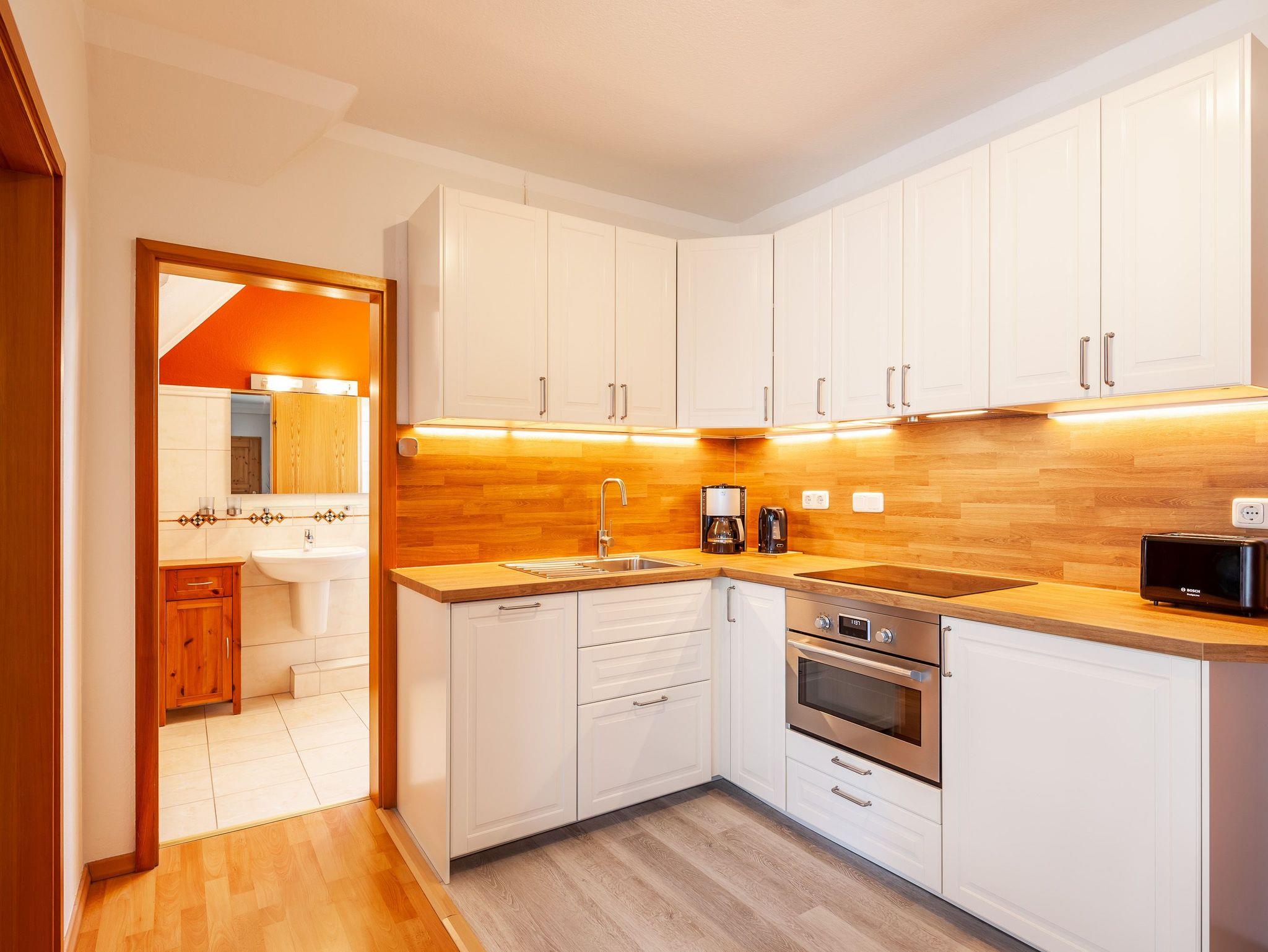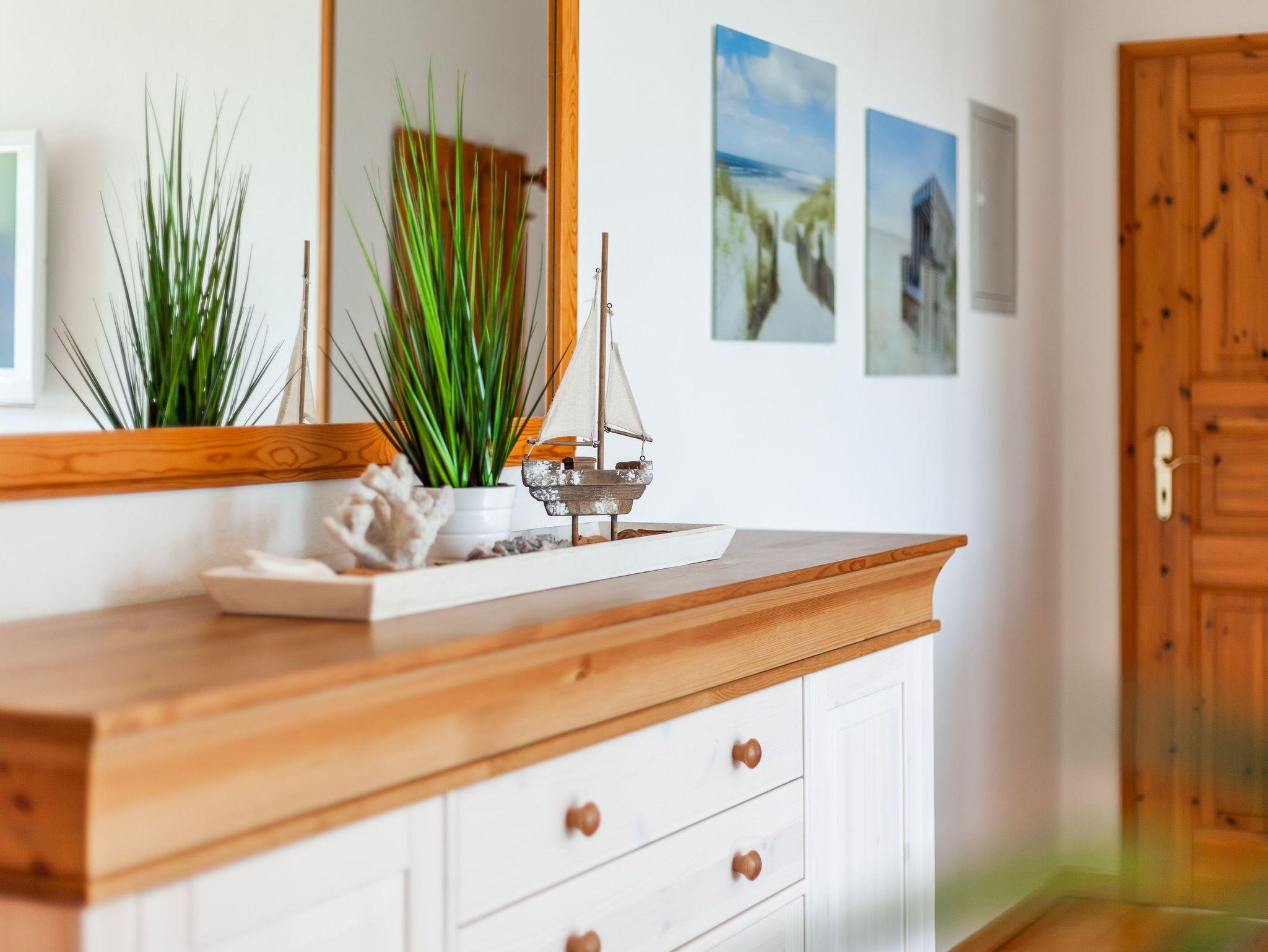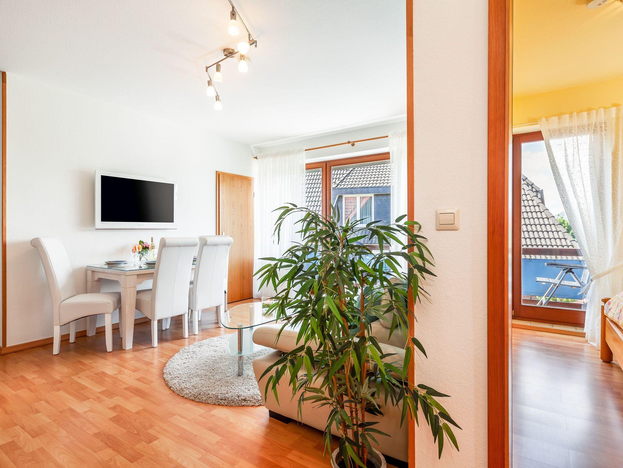 Die 50qm große Wohnung hat 3 Zimmer: ein Wohnzimmer mit Essplatz und integrierter komplett eingerichteter Einbauküche, ein Schlafzimmer mit Doppelbett und ein Kinderzimmer mit 2 Einzelbetten, sowie ein komfortables Duschbad. Die Einzelbetten des Kinderzimmers sind grosszügig bemessen (90x200 cm), so dass in der Wohnung 4 reguläre Schlafplätze vorhanden sind. Auf Wunsch werden auch Kleinkinderbetten und Hochstuhl gestellt. Der Balkon mit Sitzgelegenheiten lädt zum Verweilen an frischer Luft ein. Die Einrichtung der Wohnung ist neu und komplett ausgestattet.