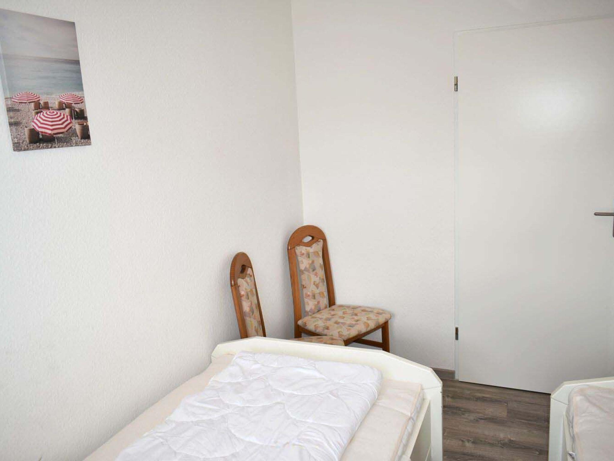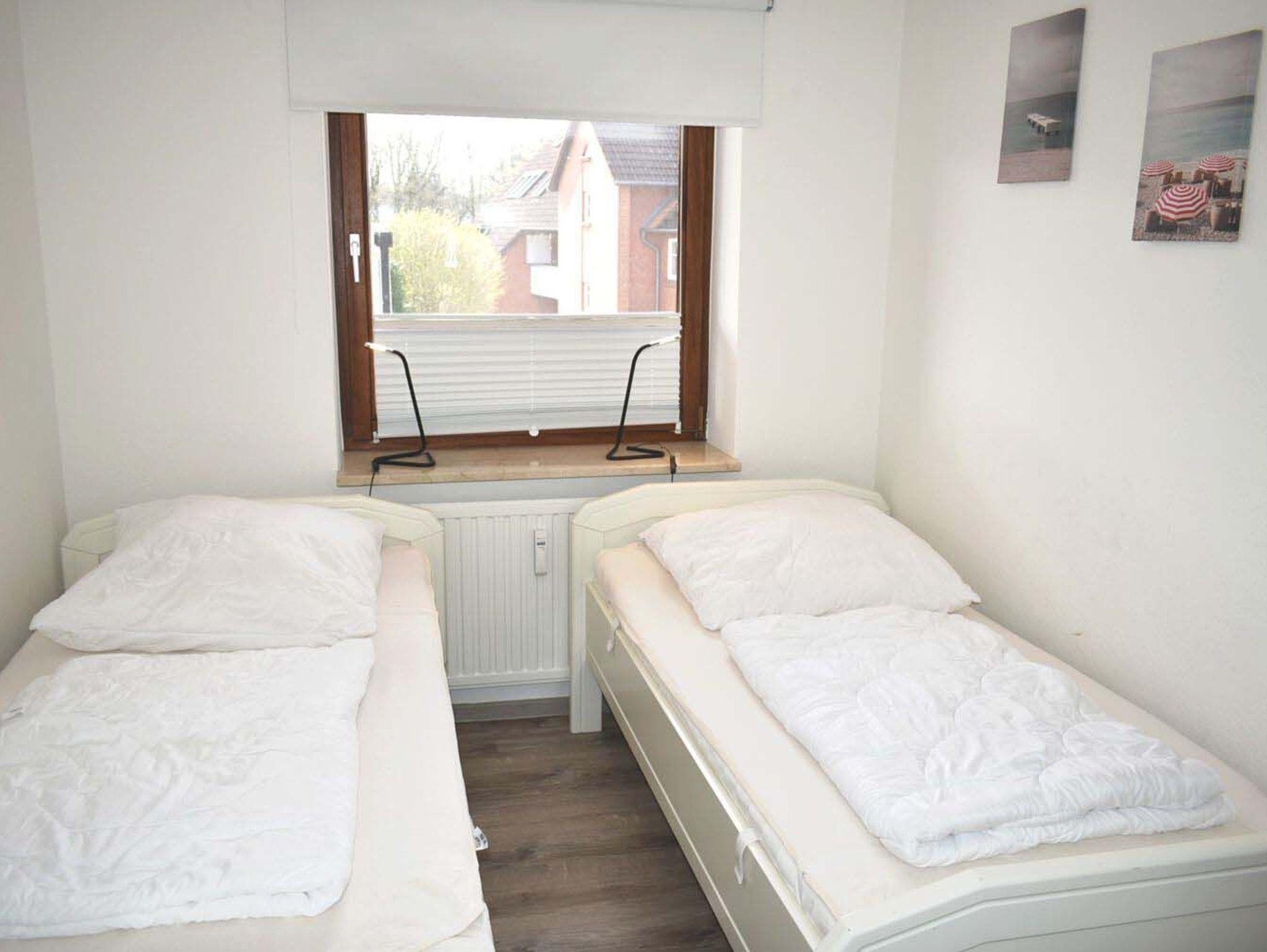 Schlafzimmer 1: 2 Einzelbetten 1,90 x 0,90 m, 2 Nachttischlampen, 2 Stühle, Kommode, Verdunklungsplissee