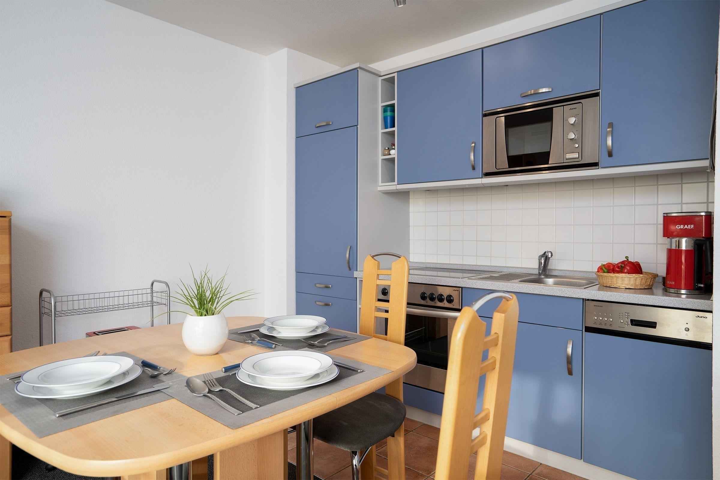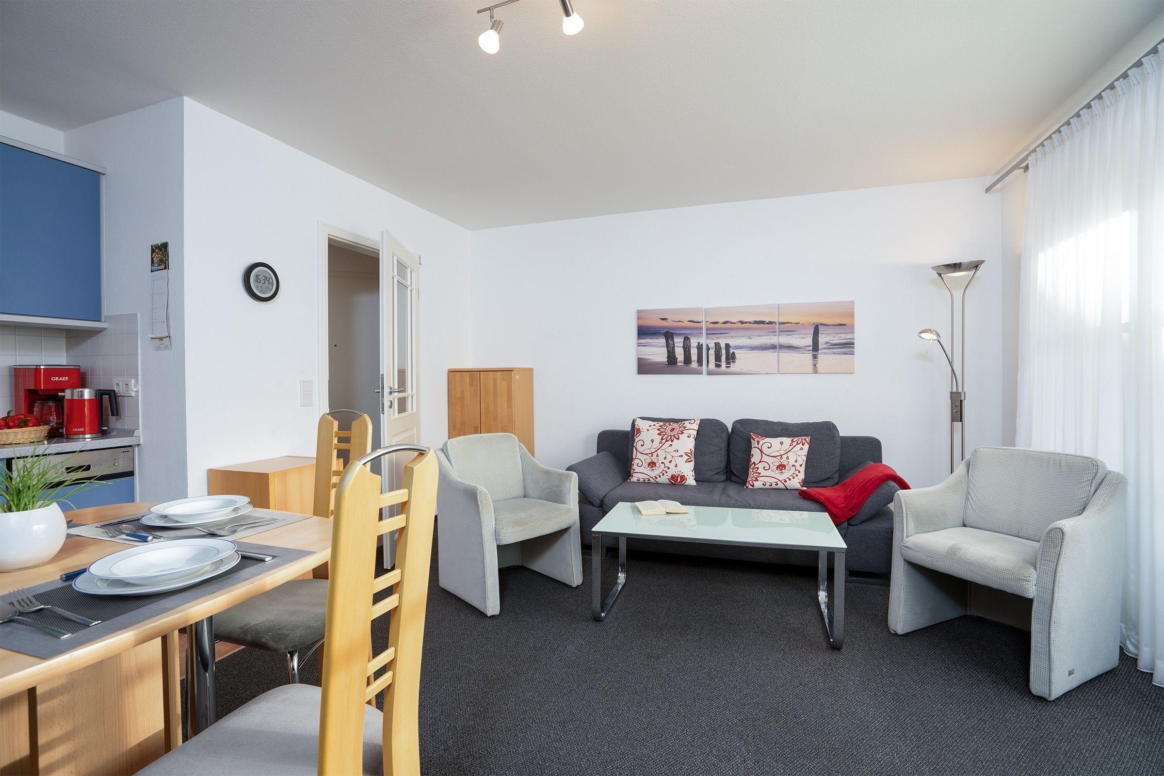Das moderne 2-Zimmer-Appartement im Erdgeschoss bietet auf ca. 50 m² eine komfortable Unterkunft für 2 Erwachsene und max. ein Kind. Der lichtdurchflutete Wohnraum ist mit Teppichboden ausgelegt und beinhaltet ein umwandelbares Polstersofa, zwei Sessel, einen Couchtisch sowie einen Flachbild-TV. Die moderne, integrierte Einbauküche ist ausgestattet mit Geschirrspüler und Mikrowelle, während der Essplatz ausreichend Platz für alle Personen bietet. Das Schlafzimmer verfügt über ein Doppelbett, Nachttisch und einen großen Kleiderschrank. Das Bad ist mit einer Eckdusche, WC und Handtuchwärmer ausgestattet. Eine Garderobe befindet sich im Eingangsbereich. Die kostenfreie W-Lan-Nutzung erfolgt auf eigene Verantwortung. Rauchen und Tierhaltung sind in der Wohnung nicht gestattet. Ein PKW-Außenstellplatz ist inklusive.