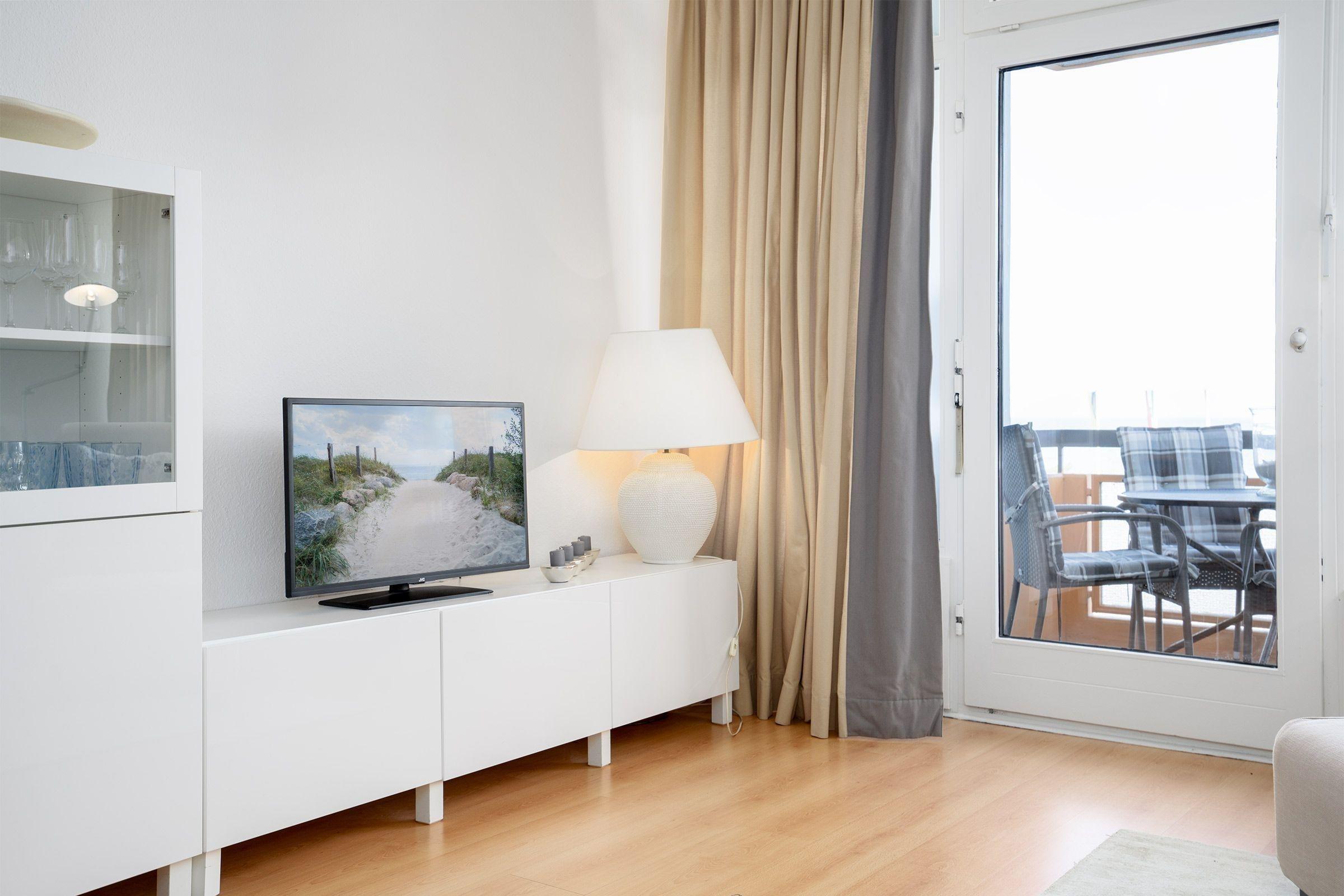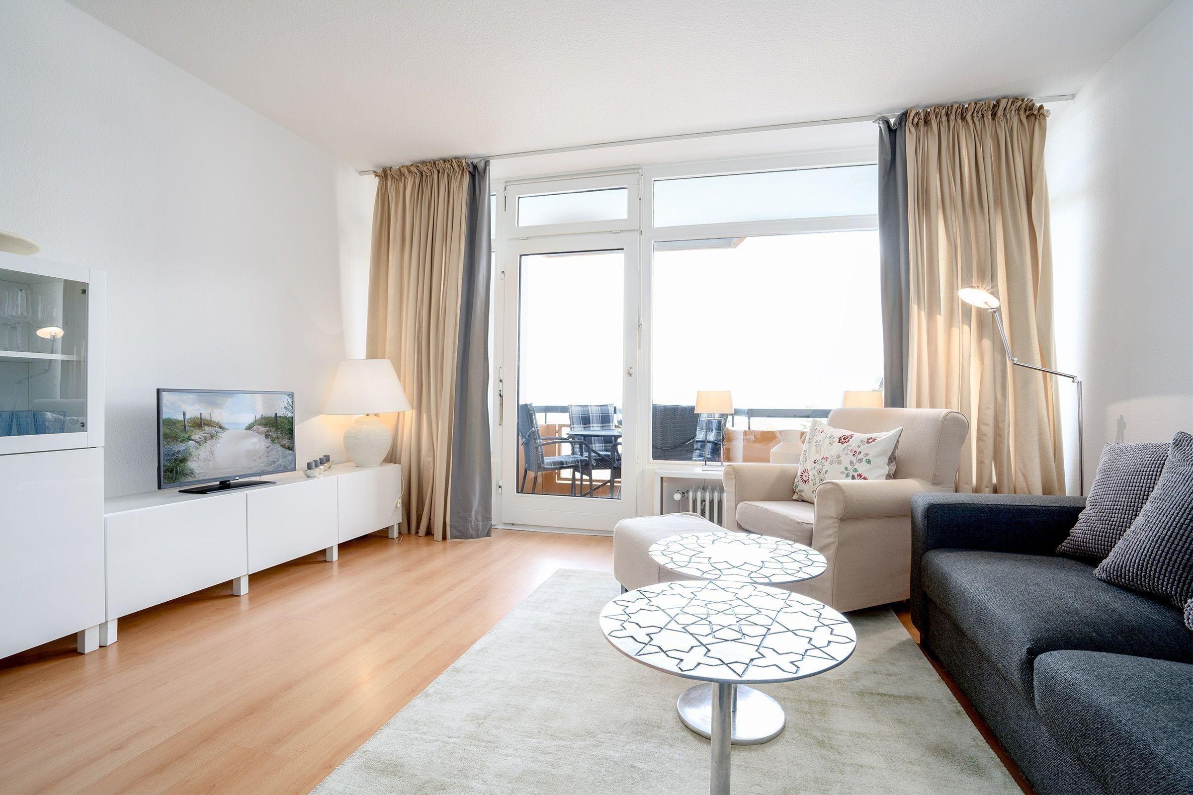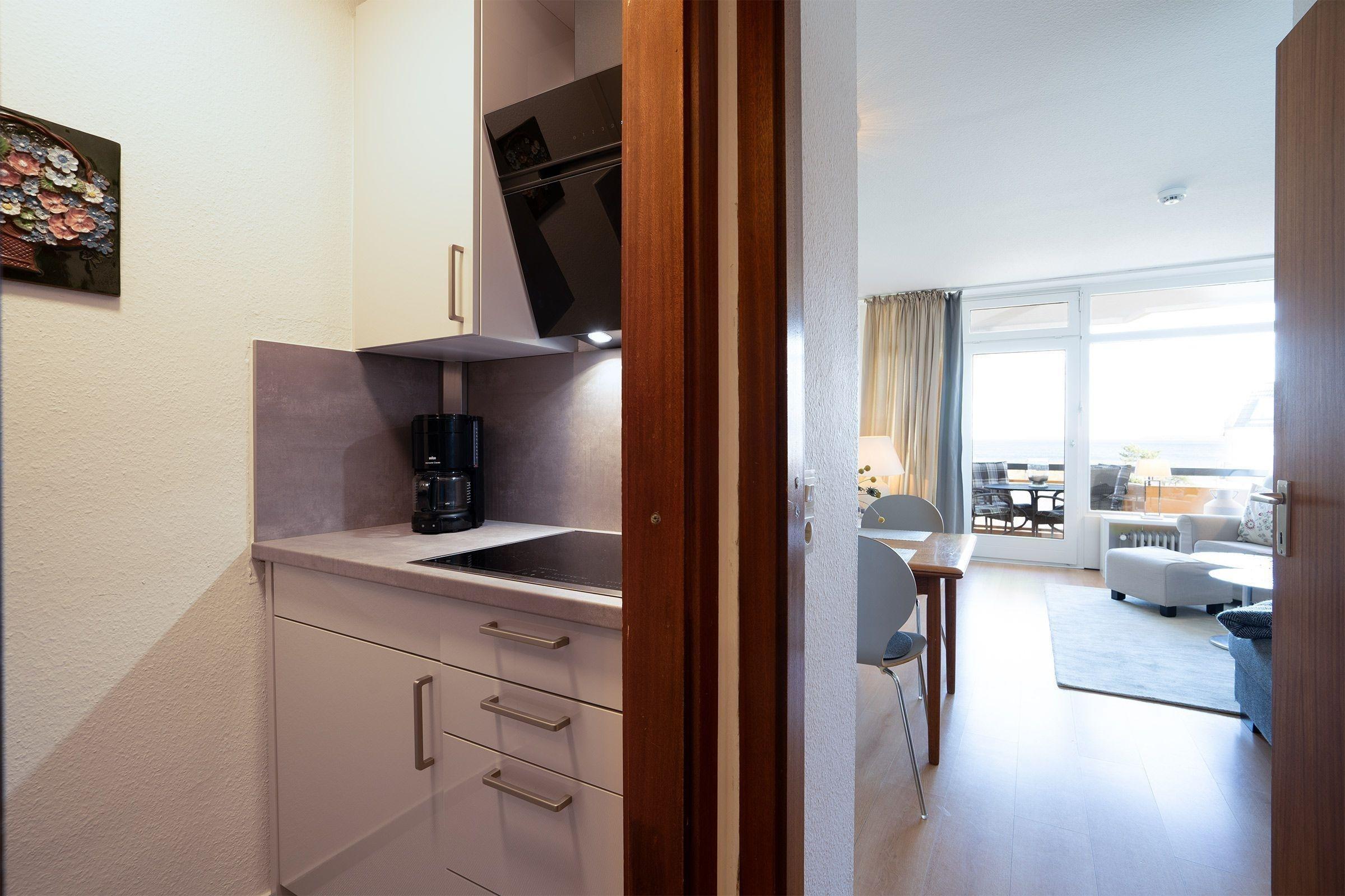 Das 60 qm große 3-Zimmer-Appartement befindet sich im 3. Stock eines Hauses mit Lift und bietet einen herrlichen Blick auf die Ostsee. Der helle Wohnbereich verfügt über ein bequemes Ecksofa, zwei Sessel und einen Flachbild-TV, ideal zum Entspannen. Der großzügige Essplatz lädt zum Frühstücken ein und die gut ausgestattete Küche umfasst eine Kaffeemaschine, einen Wasserkocher, einen Toaster, ein Cerankochfeld, eine Mikrowelle sowie eine Spülmaschine.