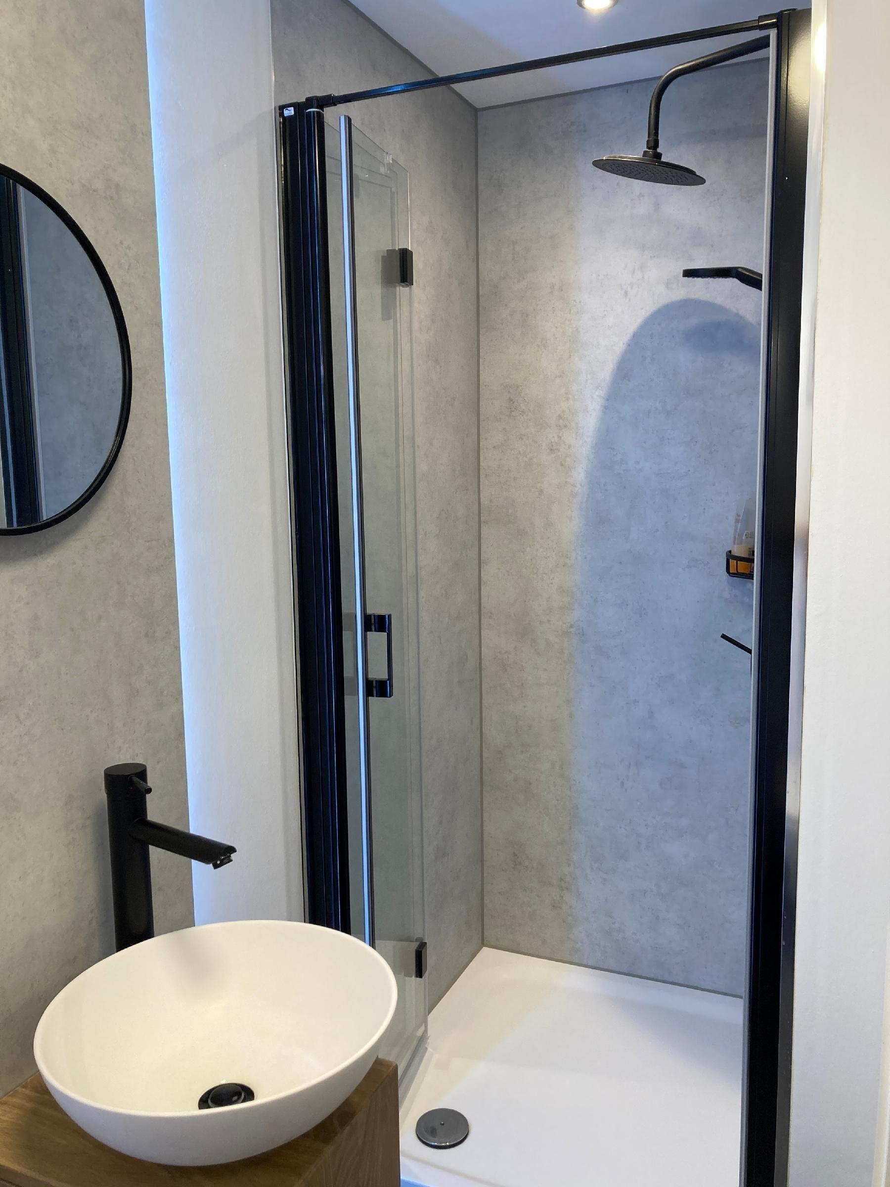 Das Badezimmer überzeugt mit hochwertigen Duschwänden in Betonoptik und stilvollen schwarzen Armaturen im Industrie-Style. Indirekte LED-Beleuchtung hebt das handgefertigte Aufsatzbecken mit Eichenschrank hervor.