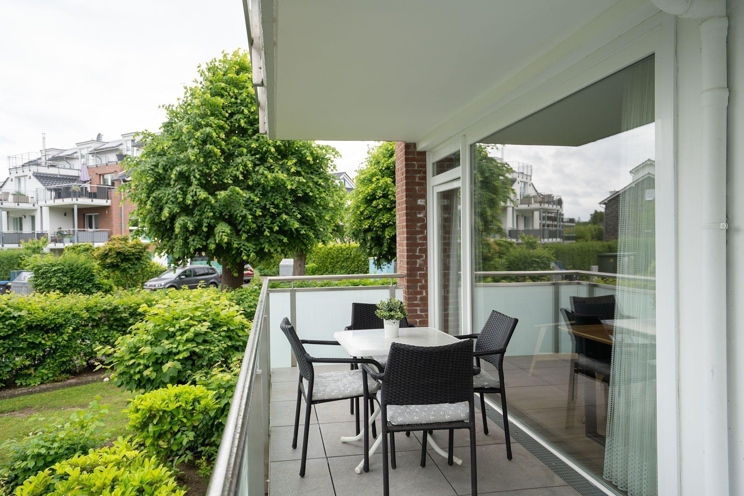 Die Ferienwohnung überzeugt durch ihren ansprechenden Außenbereich, der einen geräumigen Balkon umfasst. Dieser bietet Platz zum Entspannen und lädt dazu ein, die Sonne vom späten Vormittag bis zum Sonnenuntergang zu genießen. Der Balkon ist ideal, um frische Luft zu tanken und die ruhige Umgebung der Wohnanlage zu erleben.