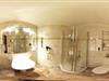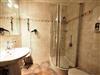 Das moderne Bad verfügt über eine Runddusche, Waschtisch, WC und einen Föhn.