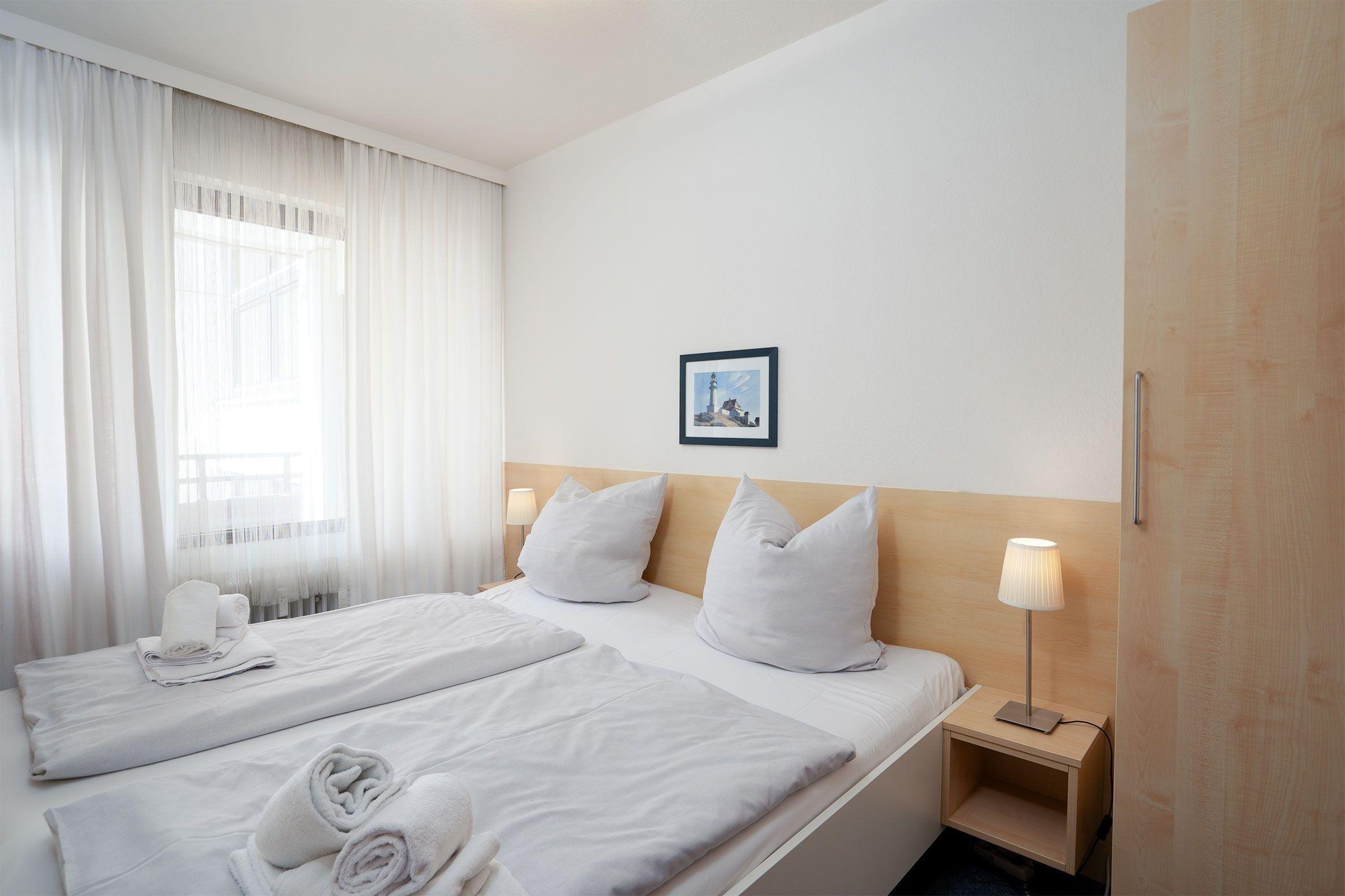 Das Appartement hat zwei Schlafzimmer, davon eines mit einem Doppelbett, Nachttischen und einen Kleiderschrank. In dem anderen Schlafzimmer befinden sich zwei Einzelbetten und ein kleiner Schreibtisch.