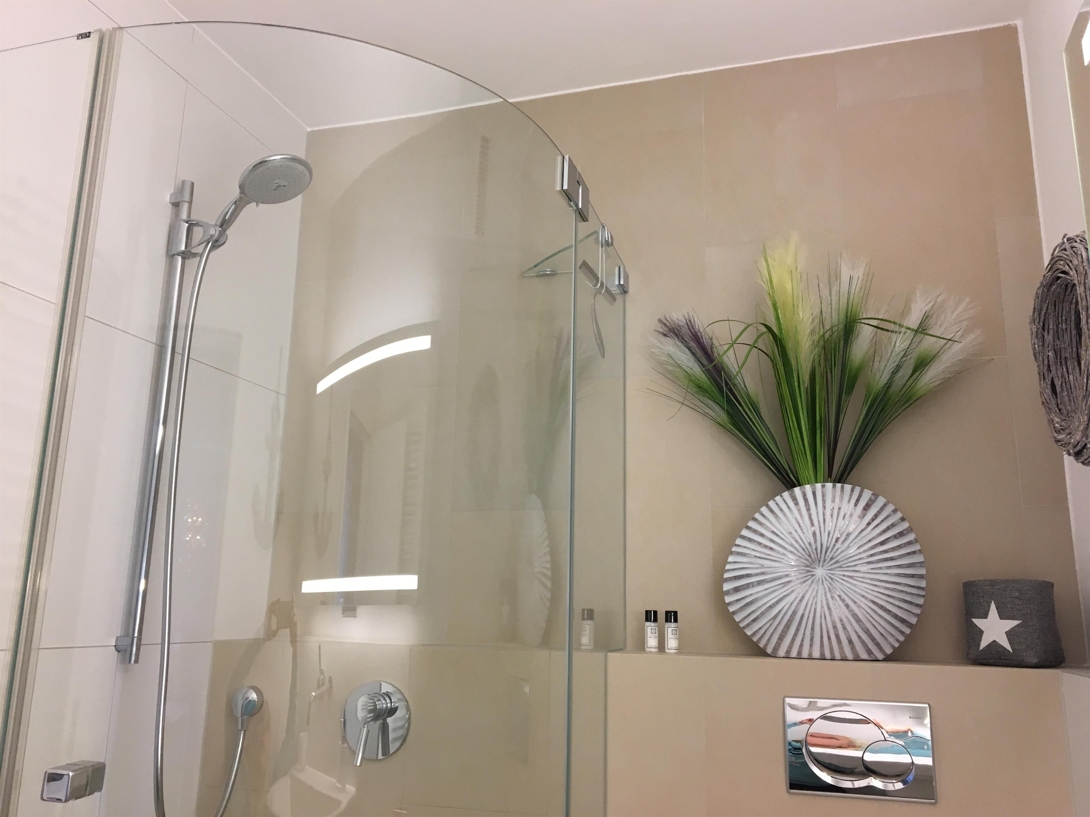 Im Wohlfühl-Duschbad mit flacher Duschtasse und edler Glastür sowie einem Handtuchheizkörper startet ein entspannter Urlaubstag!